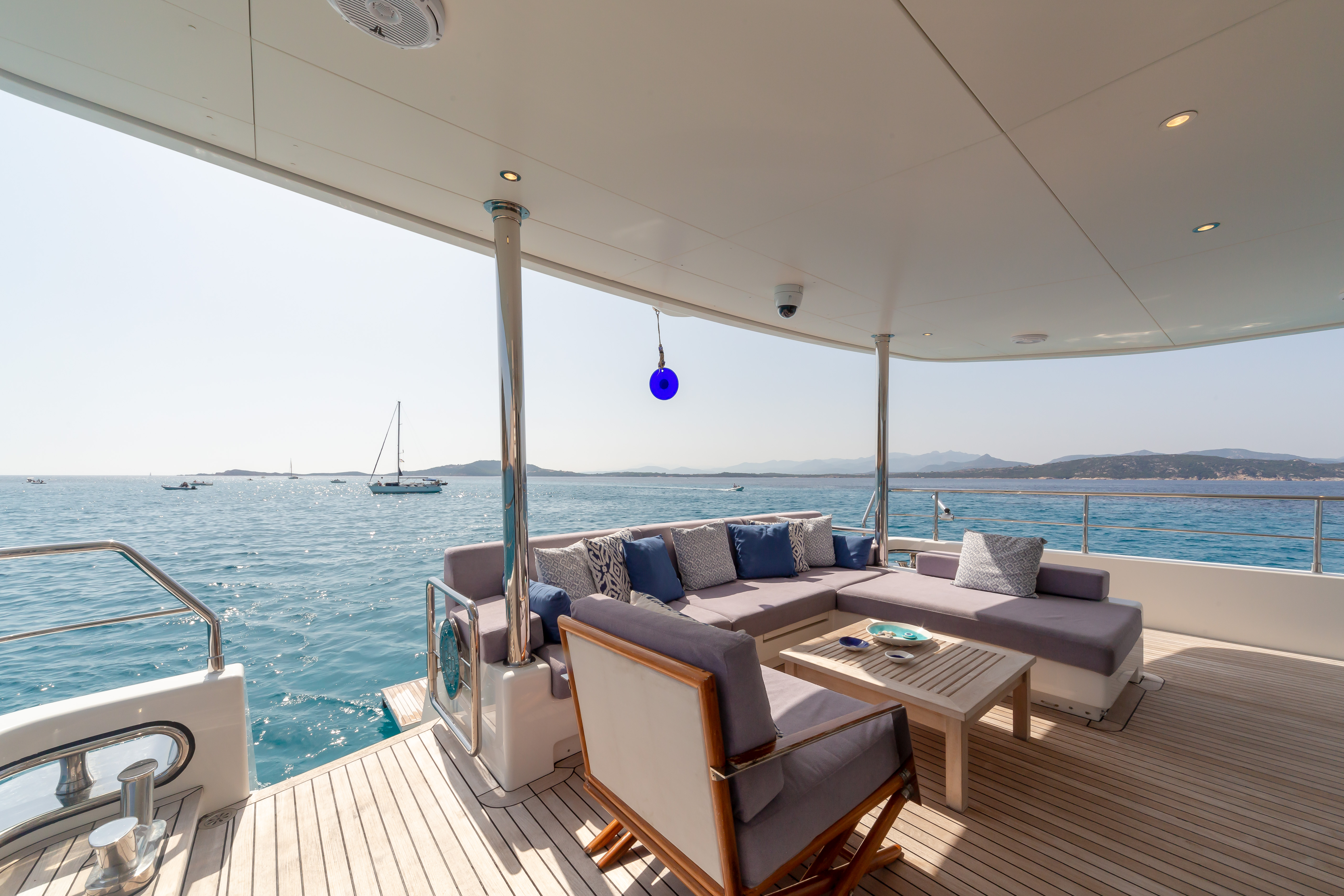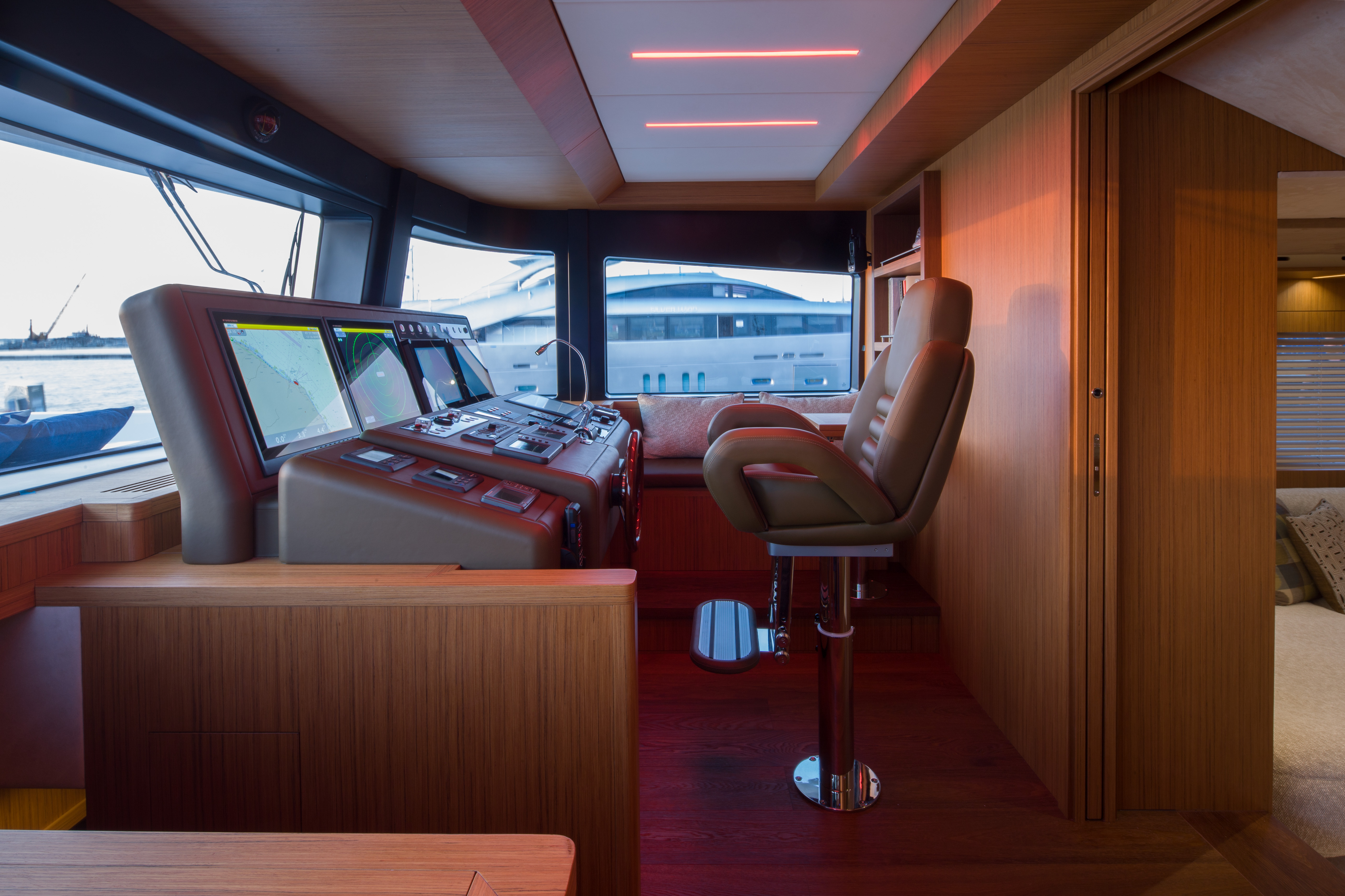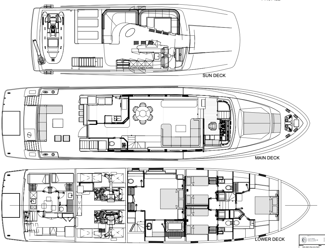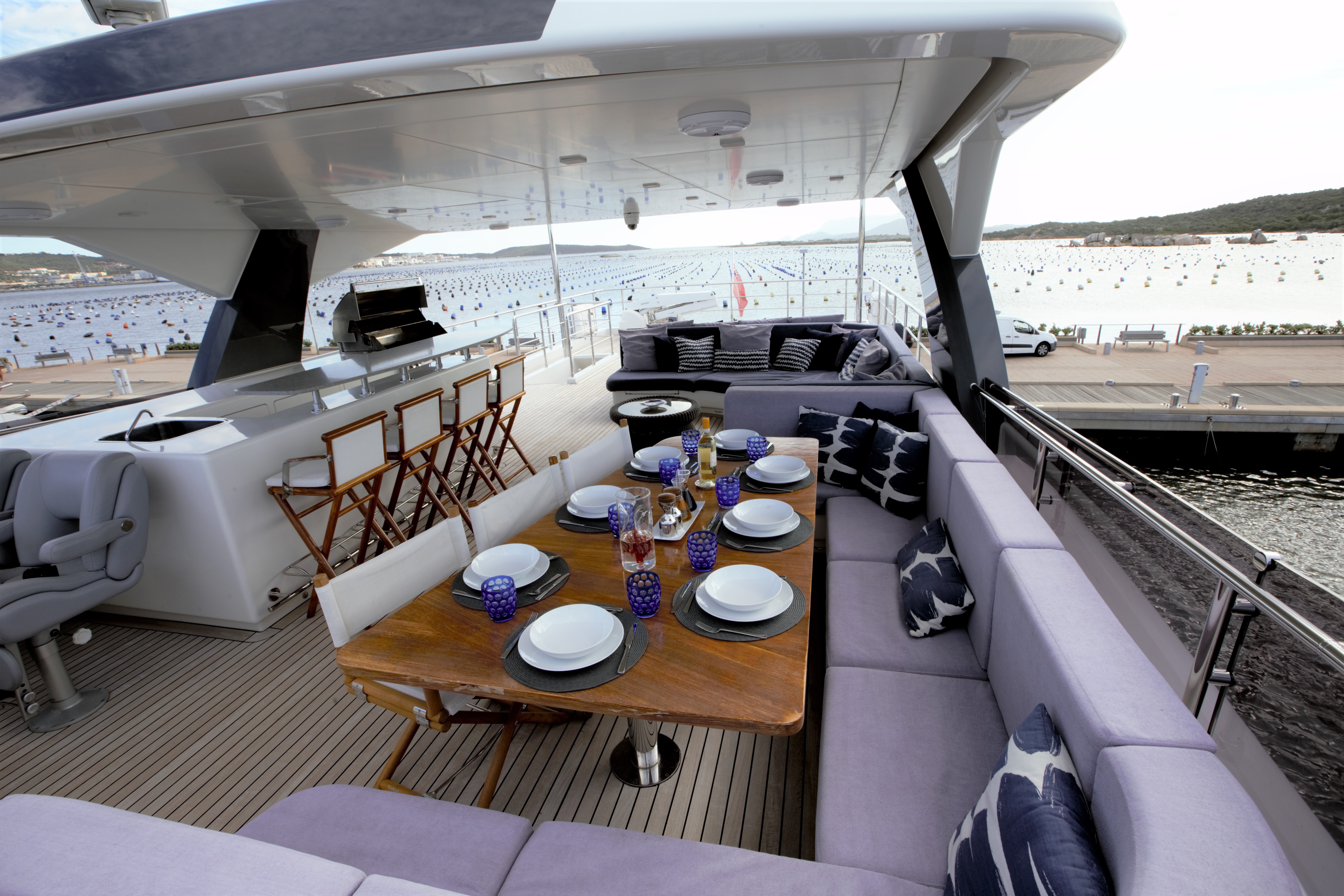 Exceedingly spacious interior has been designed by Francesco Guida. Interior and exterior spaces are kept in direct visual contact thanks to use of transparent glass in both windows and doors. The galley on the main deck was designed to be accessible both from indoors and out, and the central main salon is divided into conversation, relaxation and dining areas.