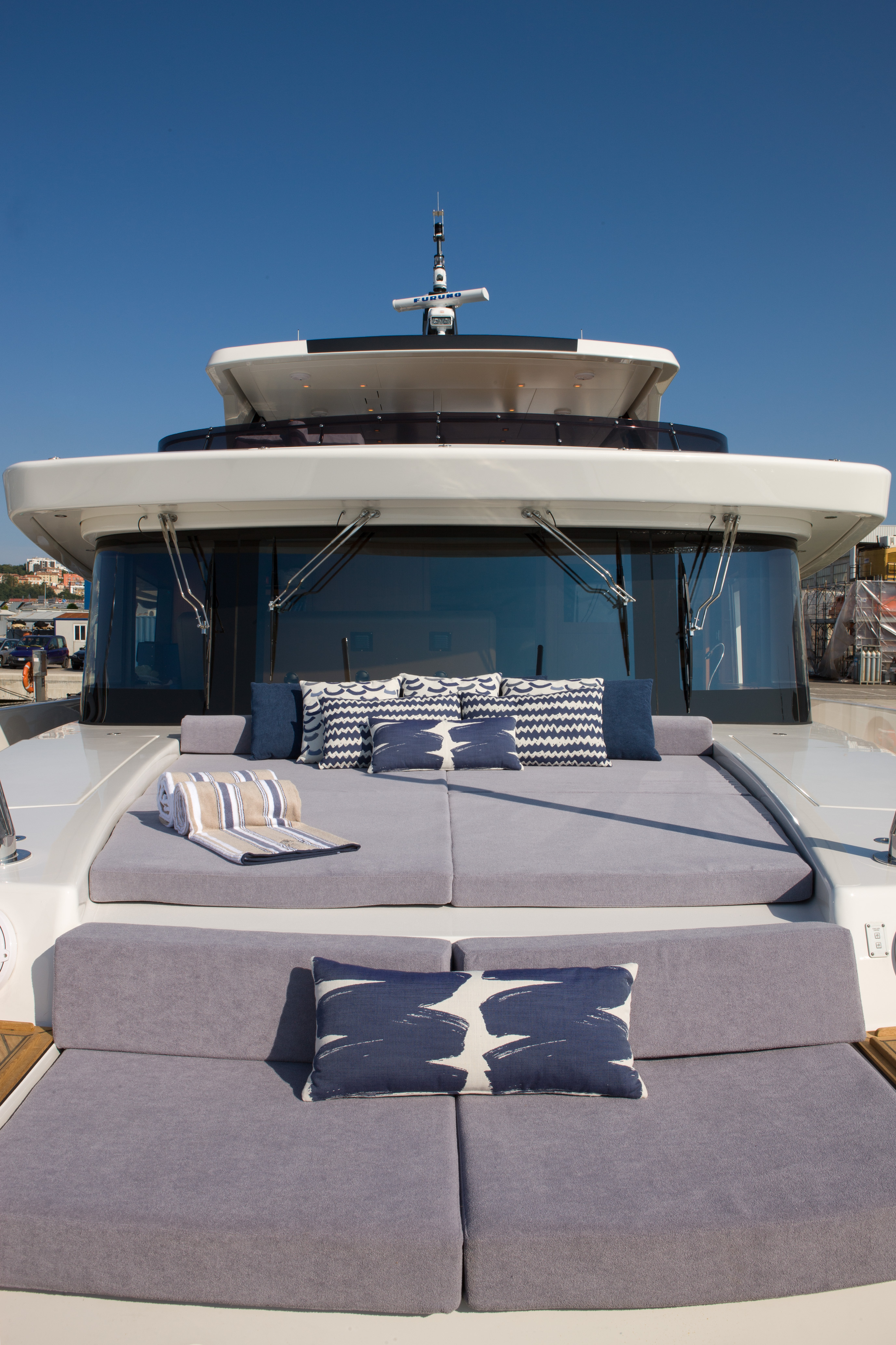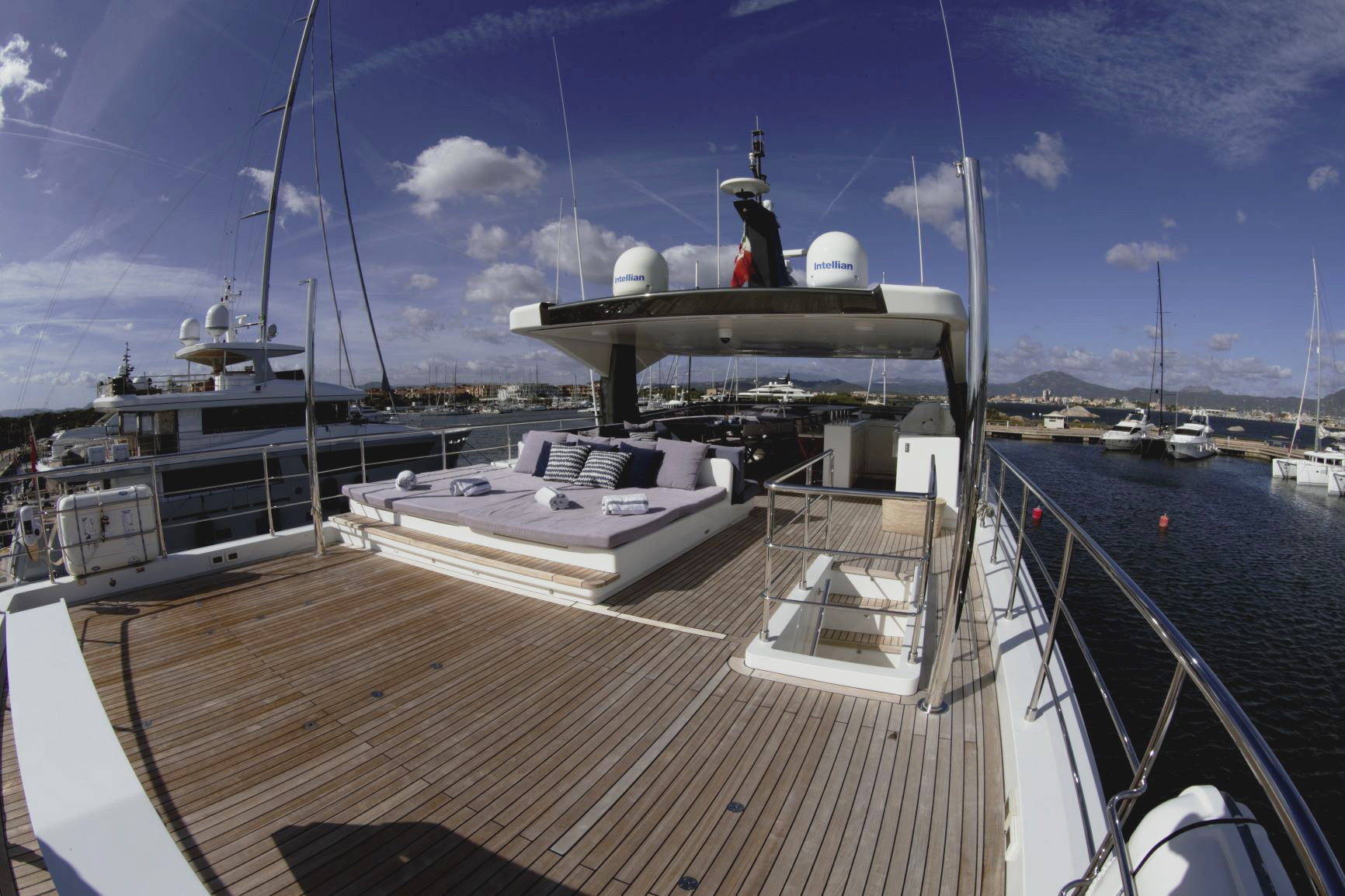 The yacht also benefits from a huge 60 sq.m panoramic fly bridge, with a sun area, BBQ, bar, 2 dining areas and spacious al fresco lounge, designed for easy outdoor living. A dedicated stairway leads from the main deck to the owner’s suite for total privacy. A separate entrance leads to the lower deck and guest cabins. All guest area feels airy and spacious thank to the 2.1 m (6,8 ft) headroom.