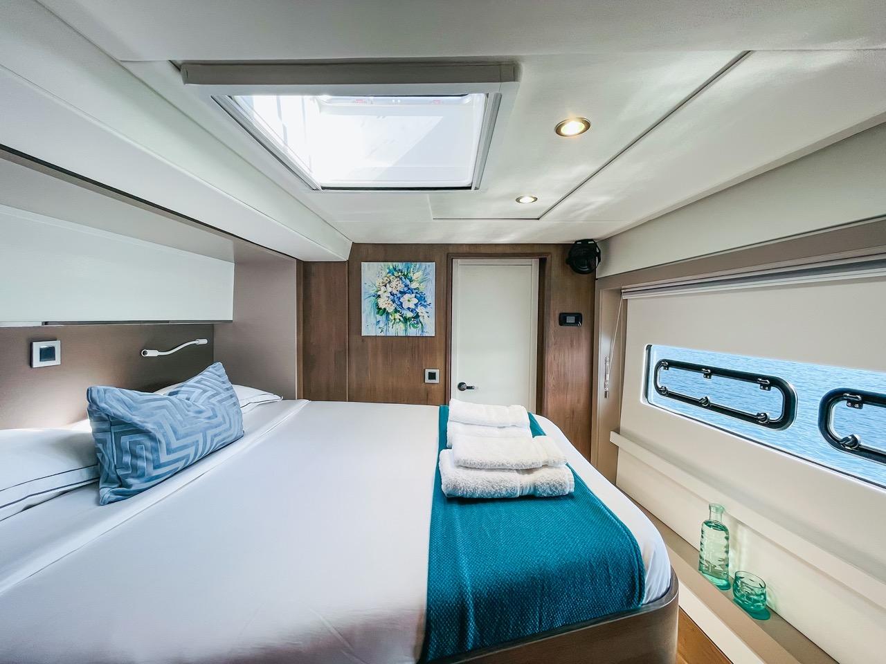 Model: Bali 5.4 Year Built: 2022 Layout: 6 guest cabins (each with ensuite) + 2 crew cabins Version: 6 cabins (3 portside + 3 starboard), 6 bathrooms Engines: 2 x Yanmar 80 HP (1300 hours) Genset MASE, Italy 15.5 kW, 230V, (3780 hours) Water-maker Aquabase 240l/h (700 hours) Air-conditioner in Saloon, (6+2 cabins) Electric fresh water toilets (6+2 cabins) Square top reinforced Dacron fully-battened main sail + Lazybag Aluminium V-boom white painted White painted mast Code O rigging Flexi-teak deck 2 x Side-by-side fridges (612 l each) Grey Water Tanks Carbonautica Steering Wheel Layout Charter version (6 cabins + 2 crew cabins)