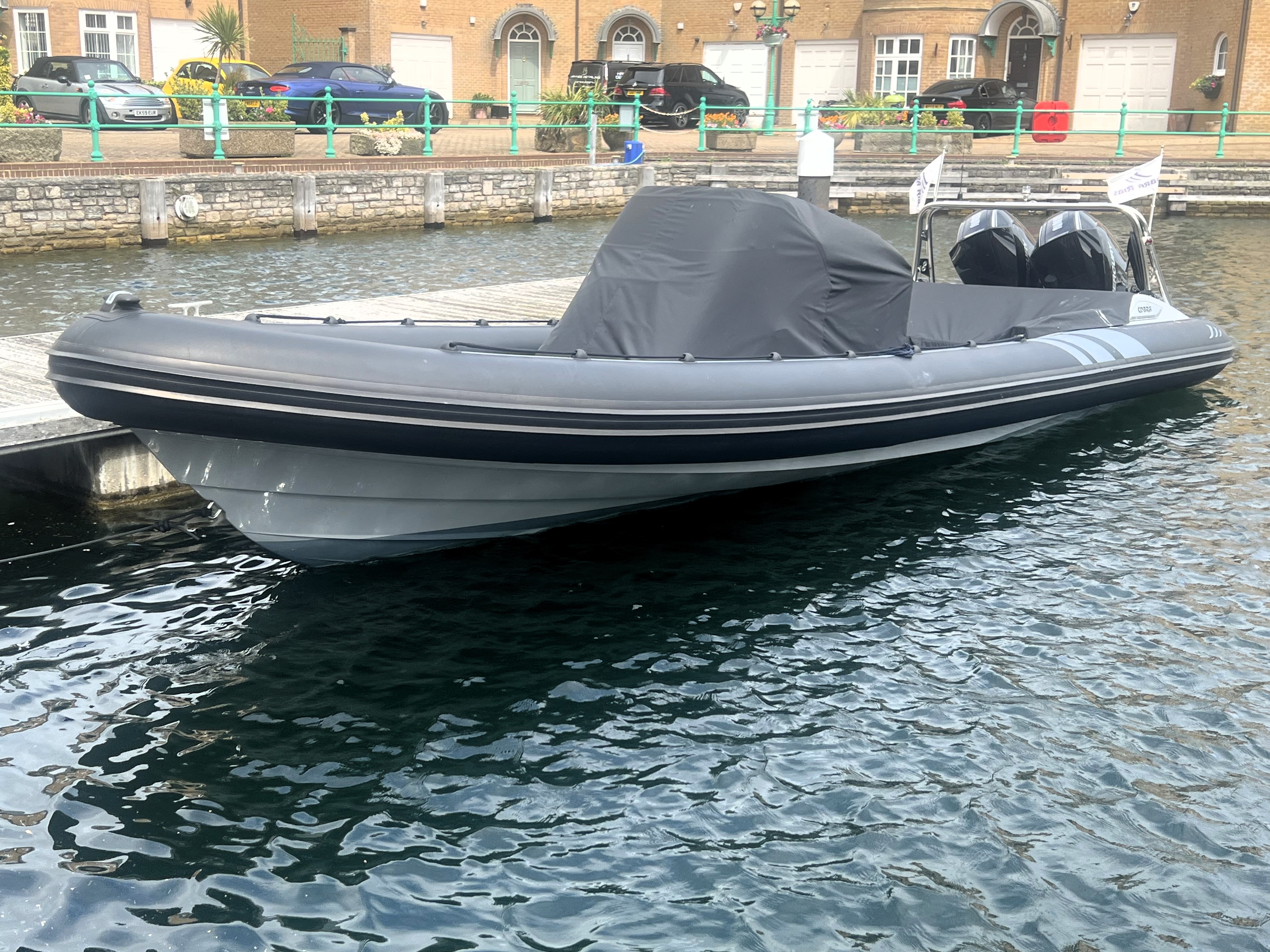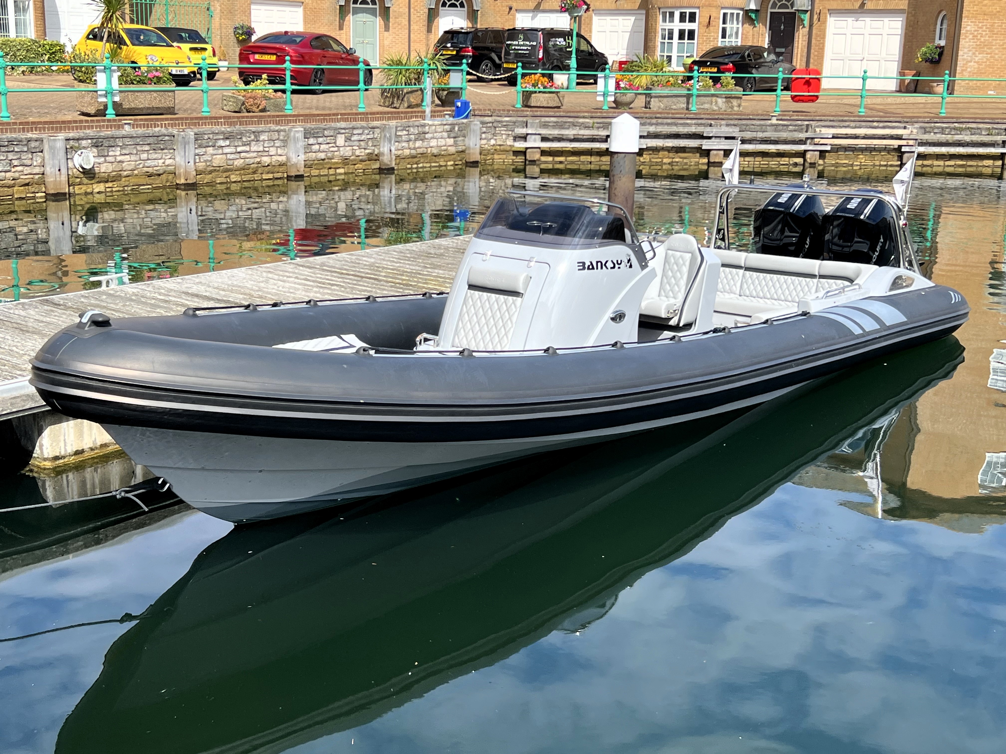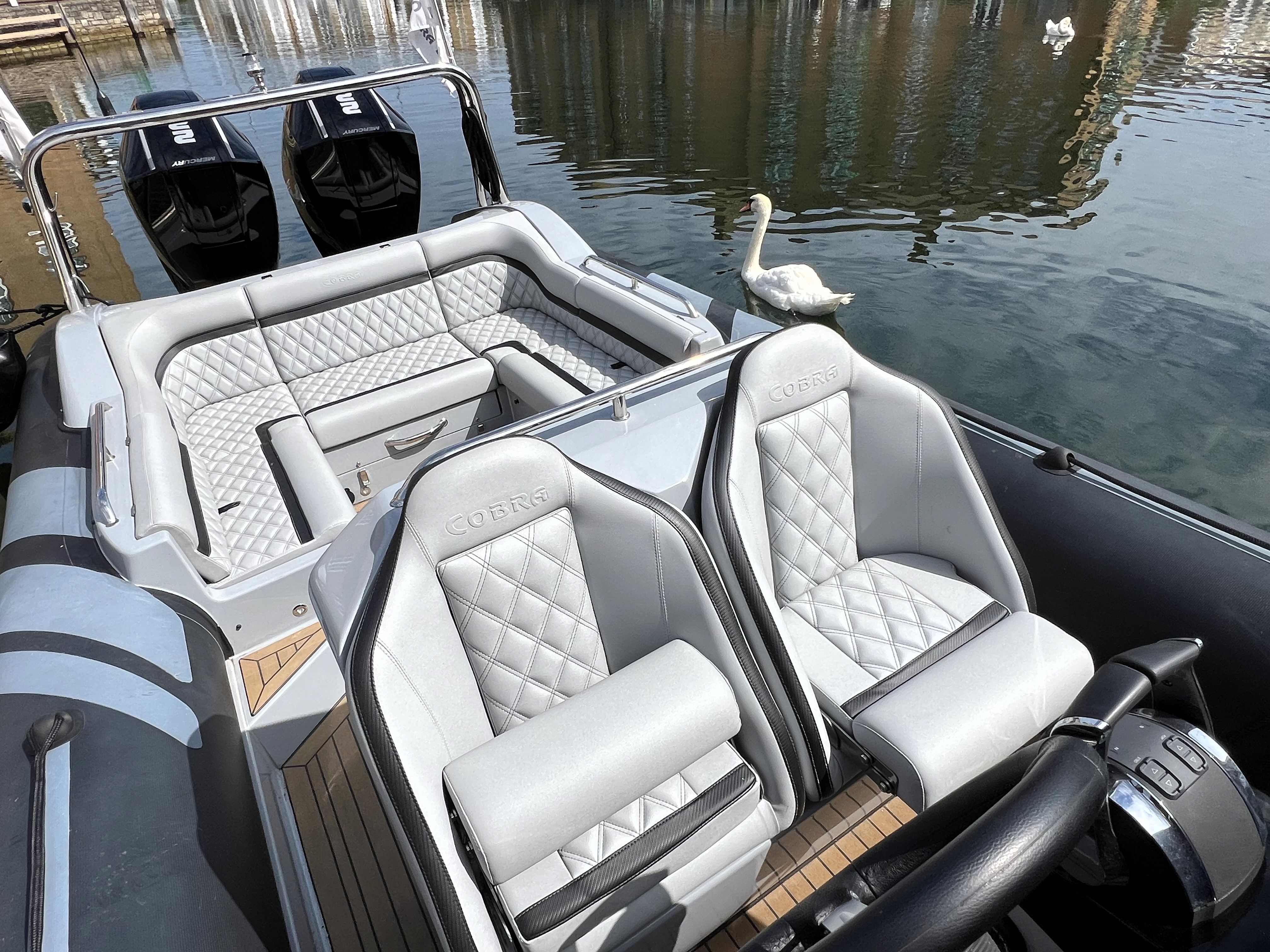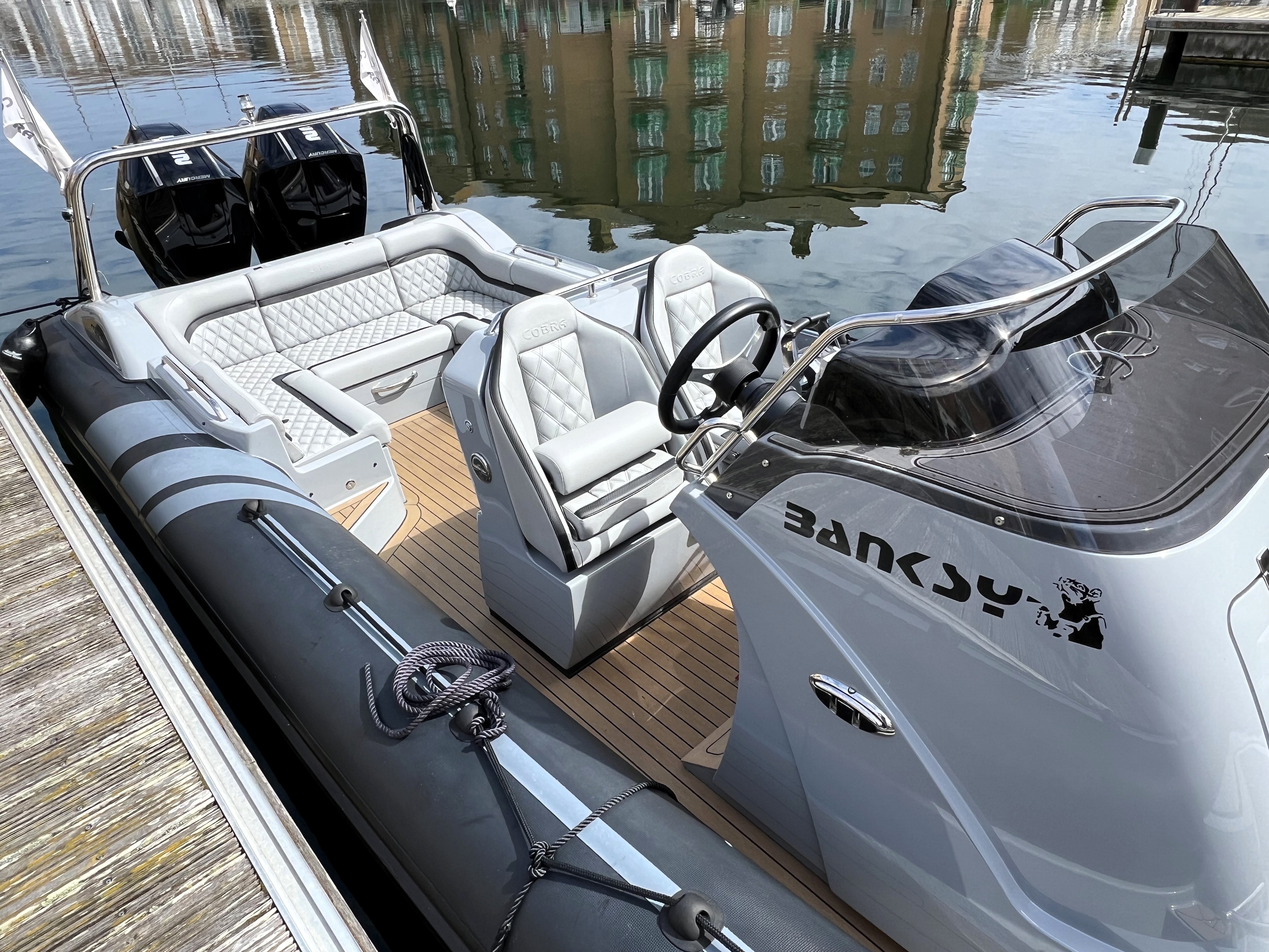 One owner from new. 2023 launch, '22 model; Cobra Nautique 8.7m fitted with Twin Mercury 225hp V6 Outboards. Speeds up to 50 knots and handling only expected from Cobra! Stylish finishings such as Black Carbon Hypalon tubes, grey grp and black accents, she is sure to stand out from the crowd. 'Banksy' is packed full of extras with suppression seats, 12" Garmin plotter, AIS, wireless phone charging, low hours and just serviced ready for the season. We highly recommend a viewing of this performance vessel. Ashore, stored inside for winter on new twin axle SBS trailer.