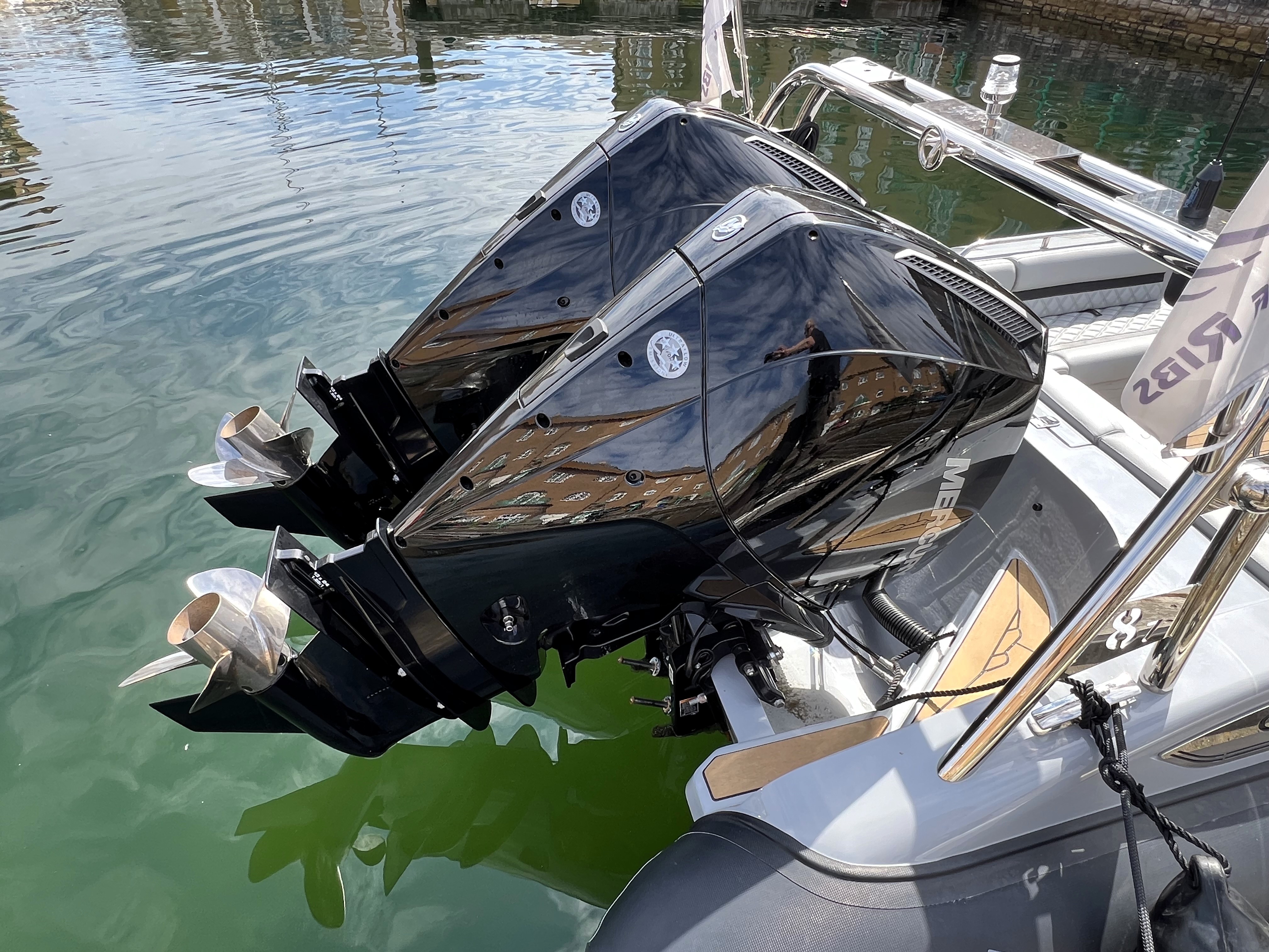 Twin Mercury 225hp V6 Outboards with power assisted steering.