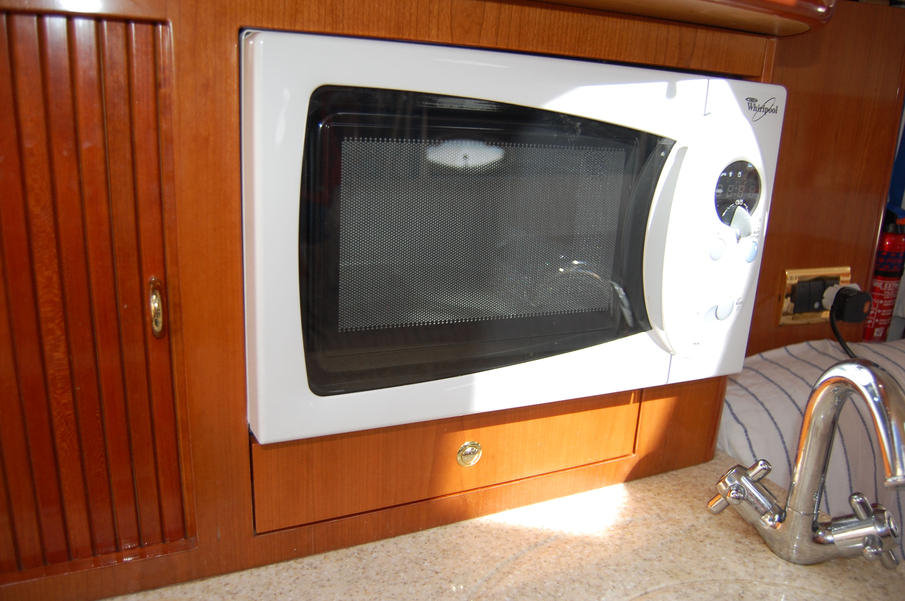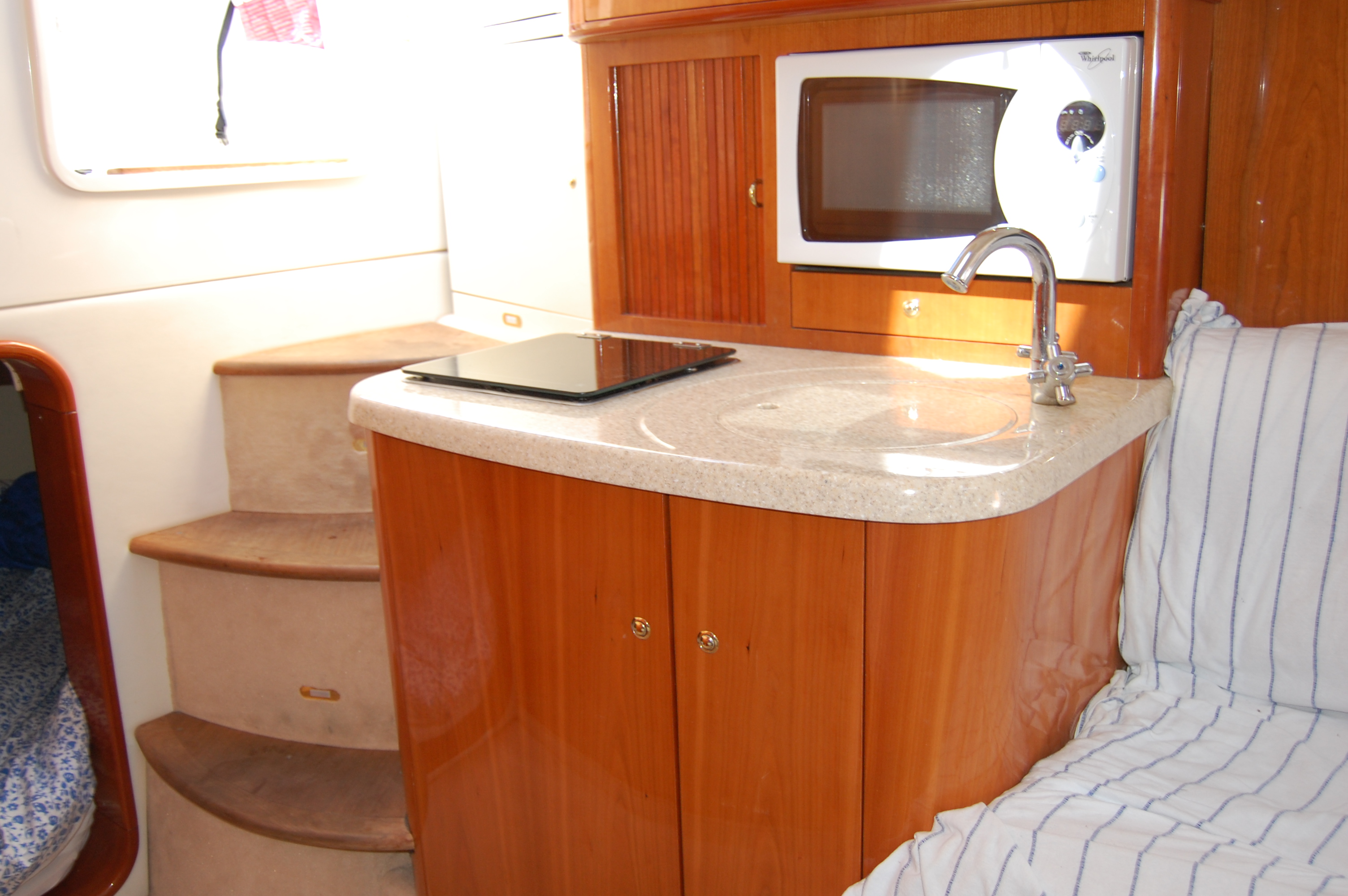 Galley with corian worktop, single burner alcohol and electric hob, microwave oven, refrigerator and sink