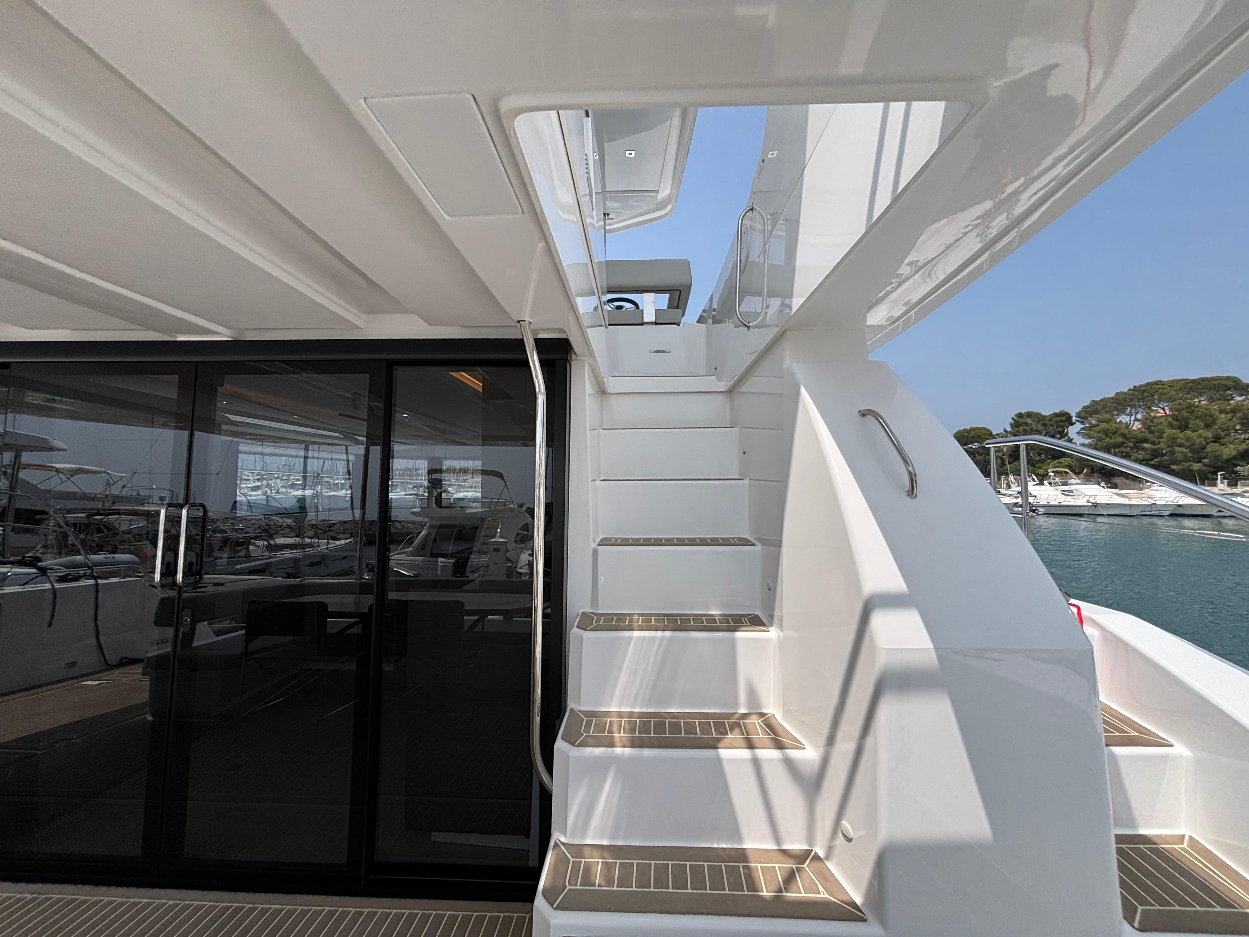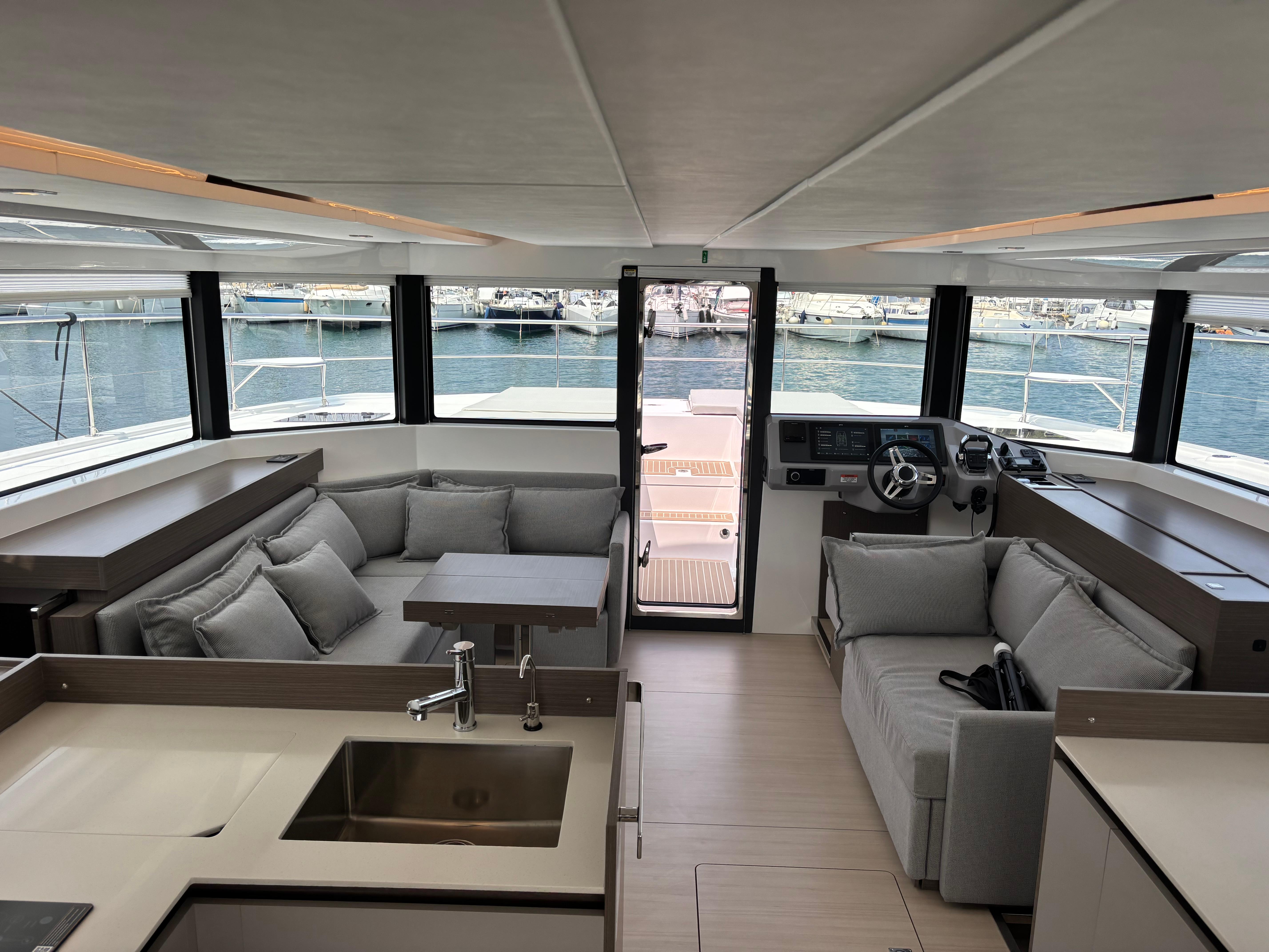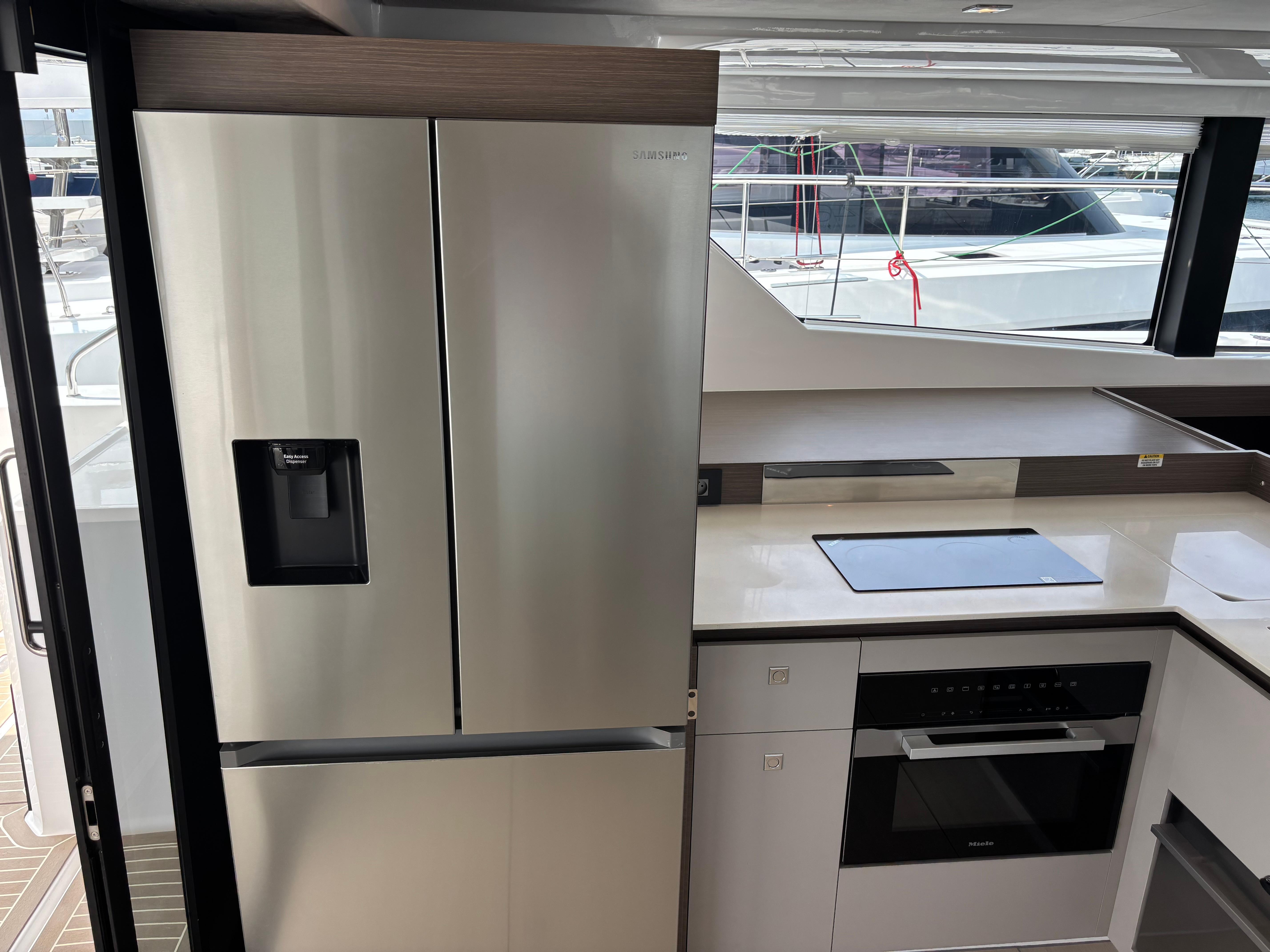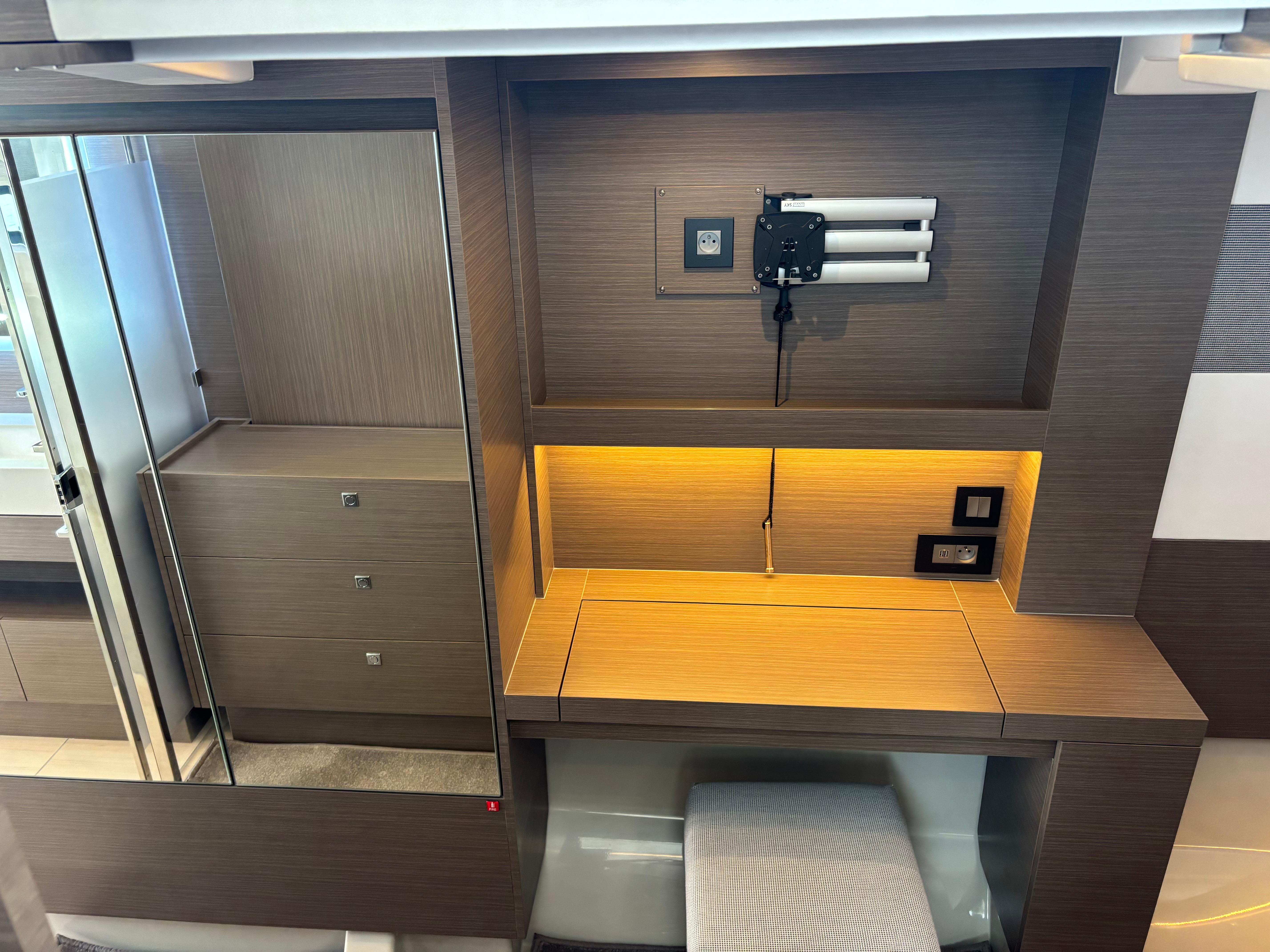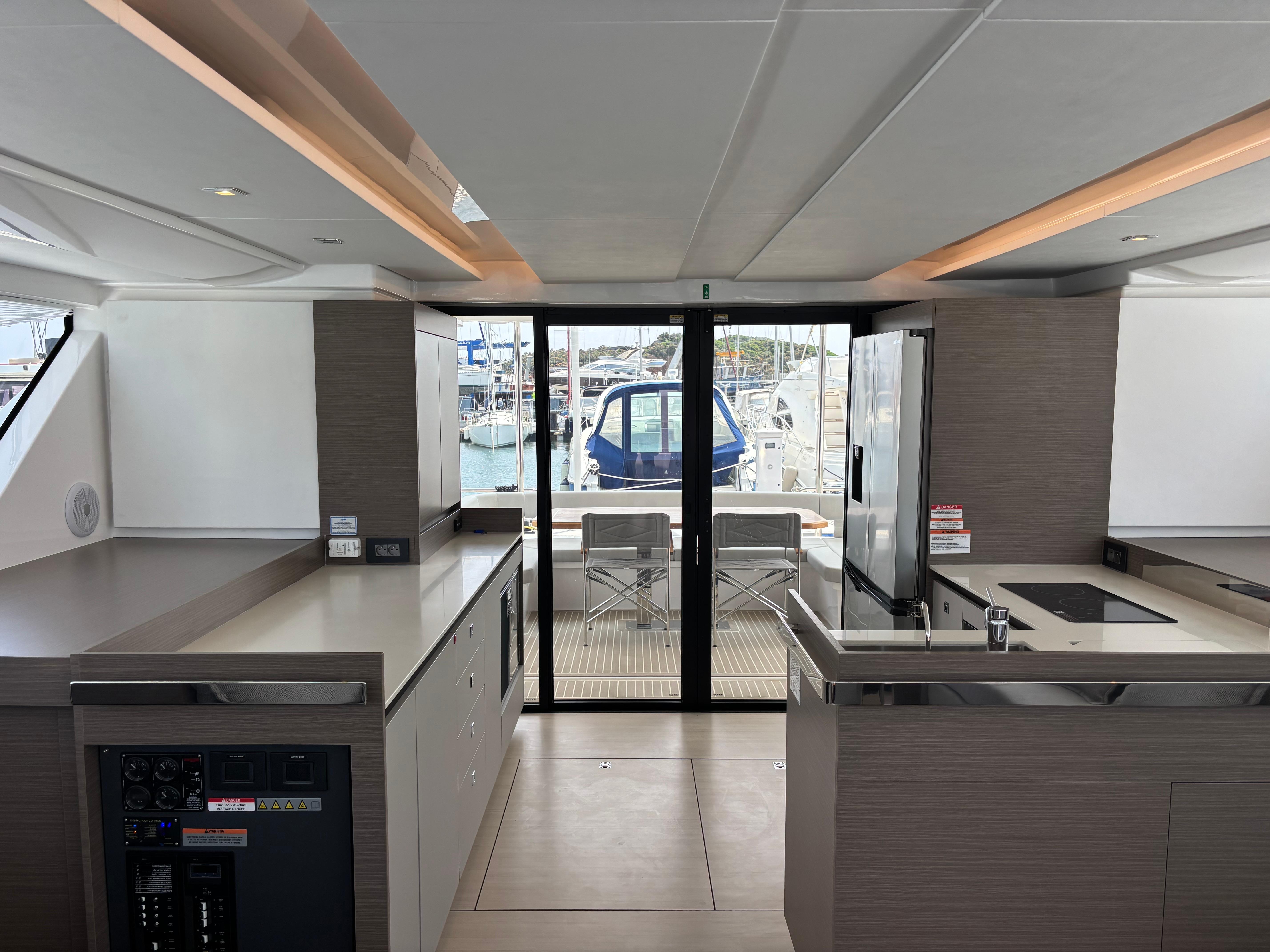Venture inside and discover every anticipated detail, from the recessed LED task lighting to the new, soft furnishing for the settees. Gloss white galley locker doors and countertops can be upgraded to a matte beige finish. The Galley Serving Area, an additional space at the aft end of the saloon, provides an extended entertainment area complete with a large counter for food and drink preparation, ample storage lockers for crockery and food and a drinks locker.