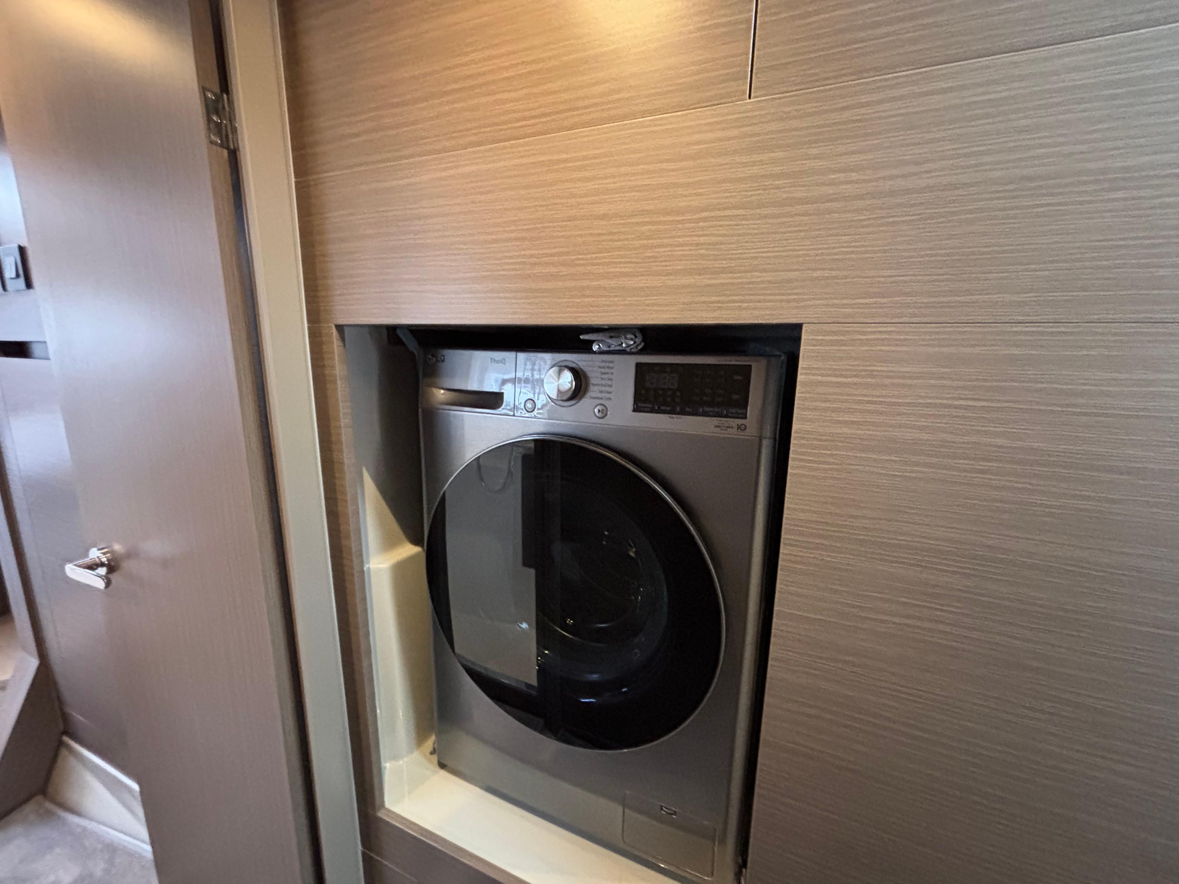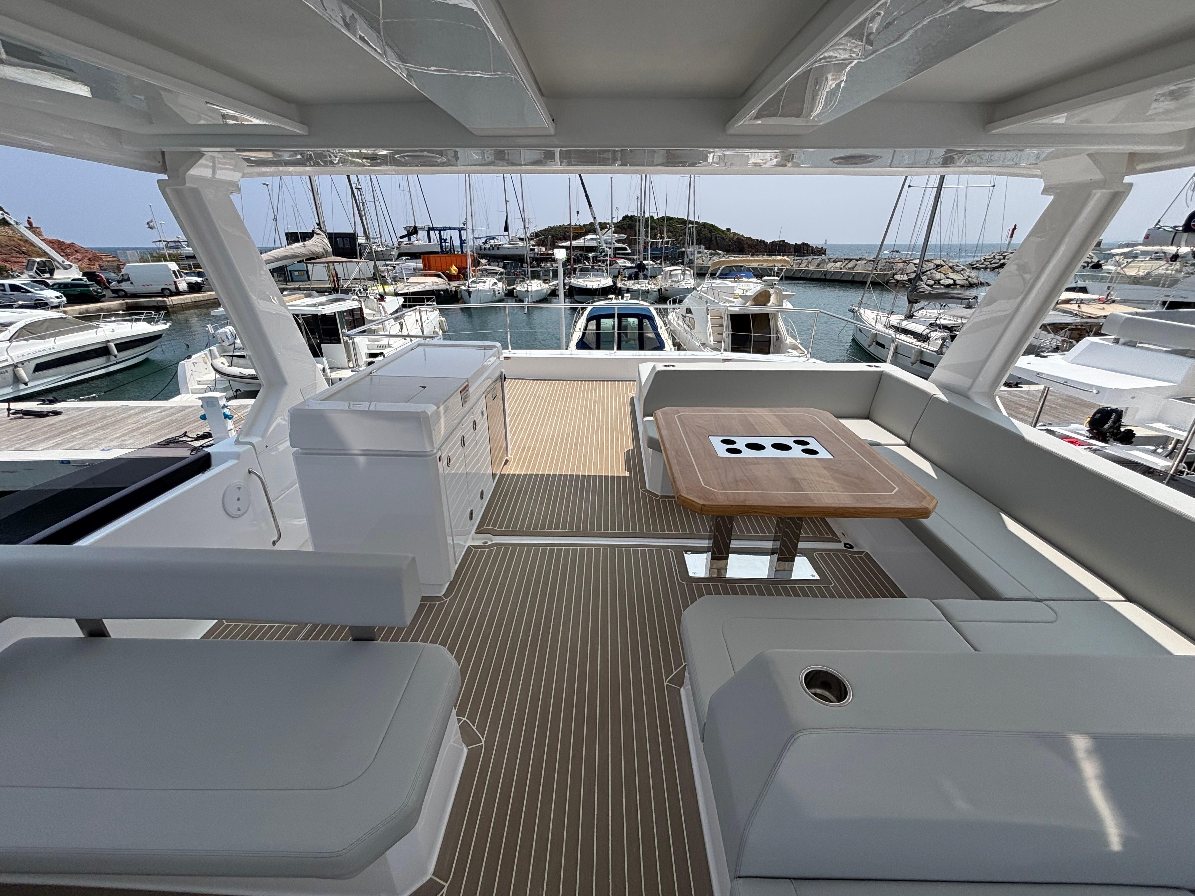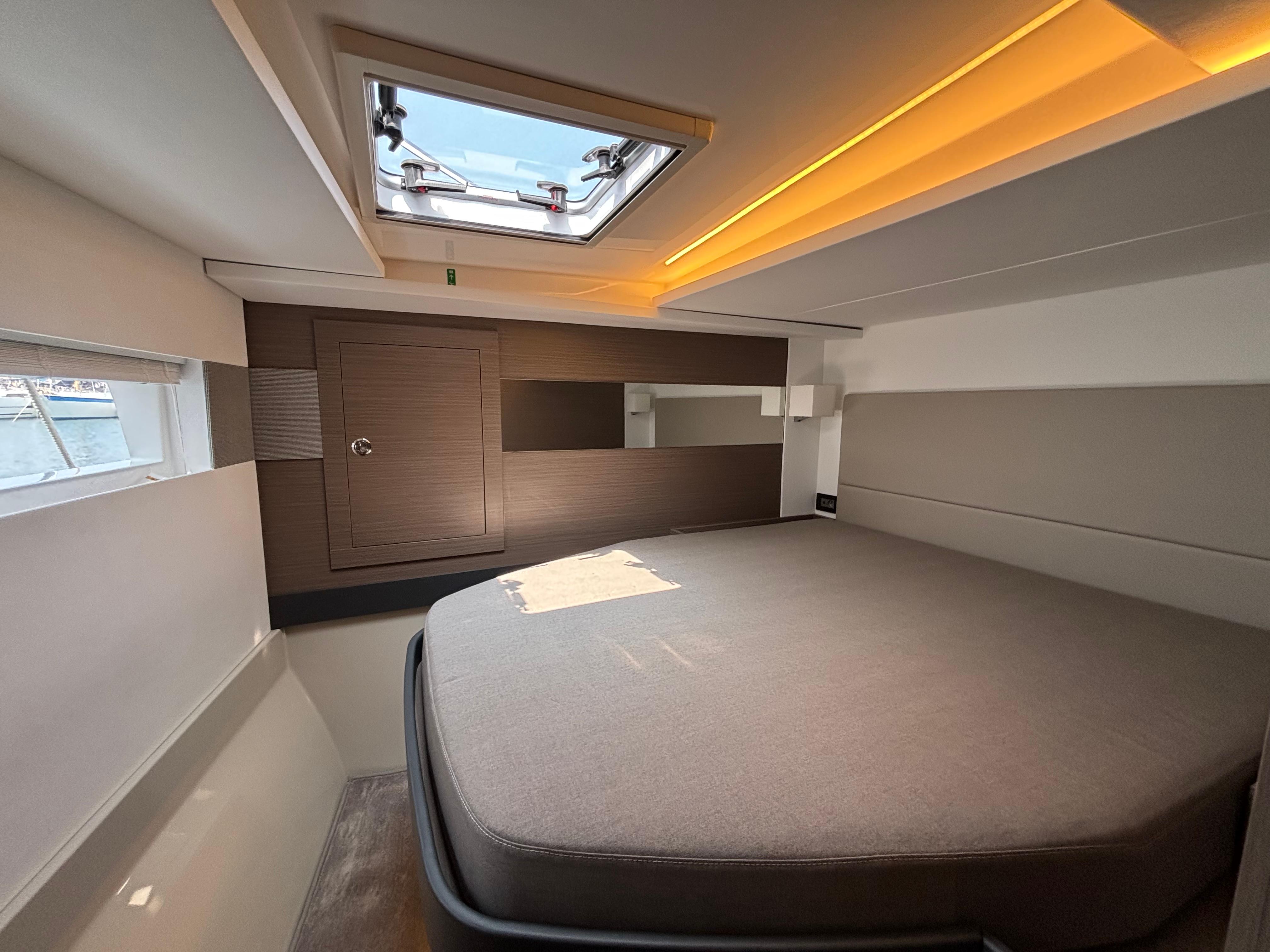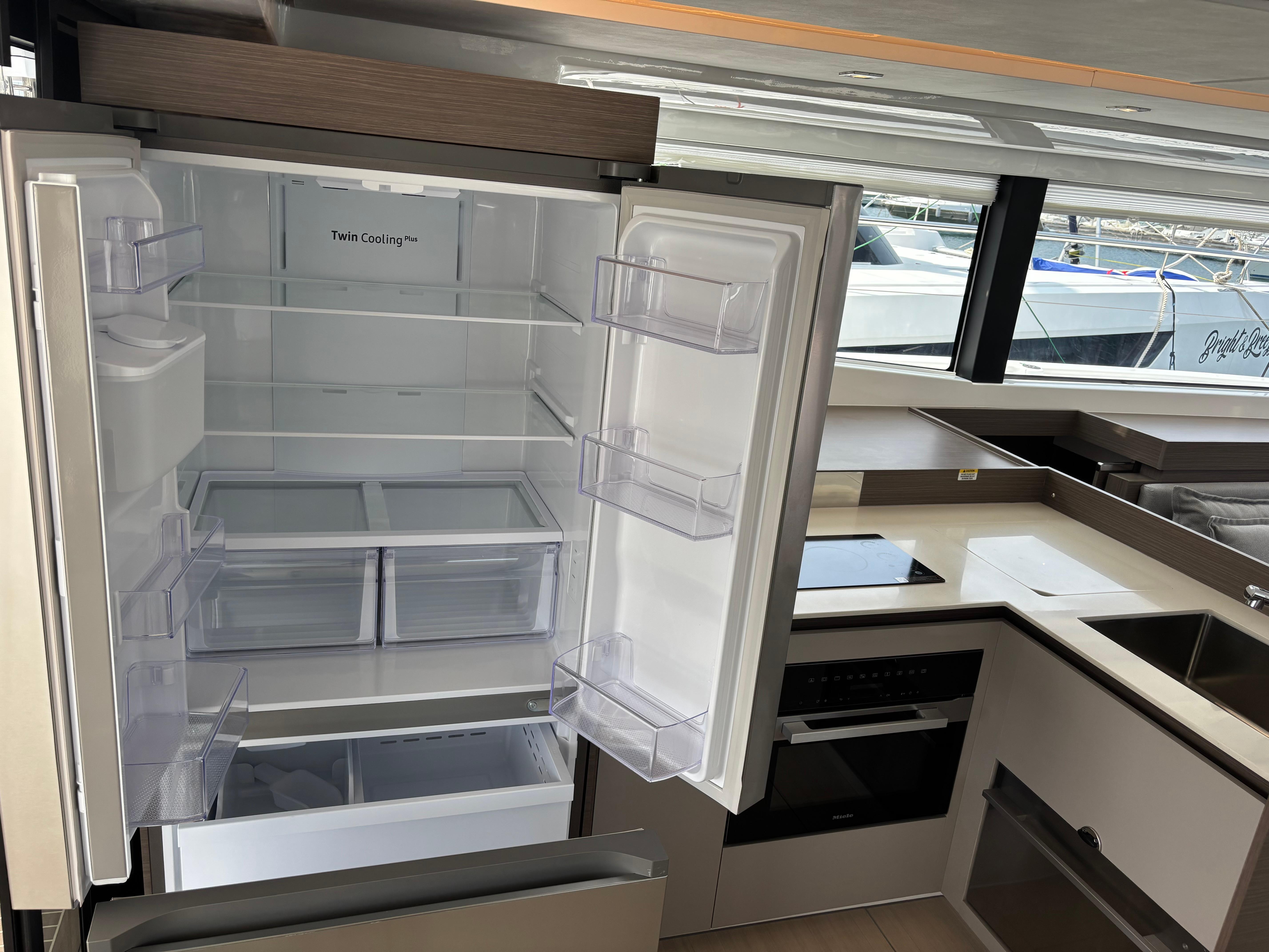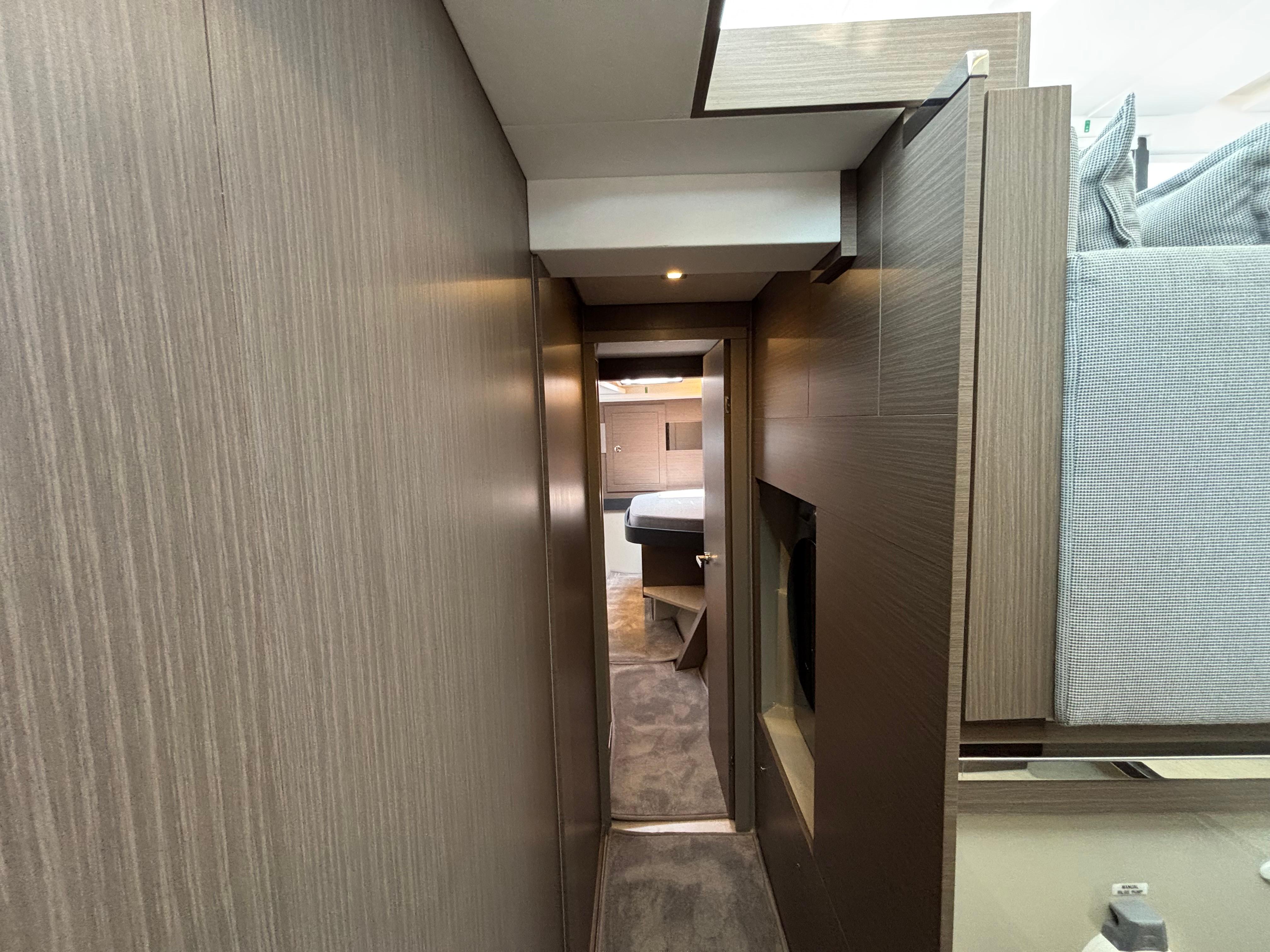 Venture inside and discover every anticipated detail, from the recessed LED task lighting to the new, soft furnishing for the settees. Gloss white galley locker doors and countertops can be upgraded to a matte beige finish. The Galley Serving Area, an additional space at the aft end of the saloon, provides an extended entertainment area complete with a large counter for food and drink preparation, ample storage lockers for crockery and food and a drinks locker.