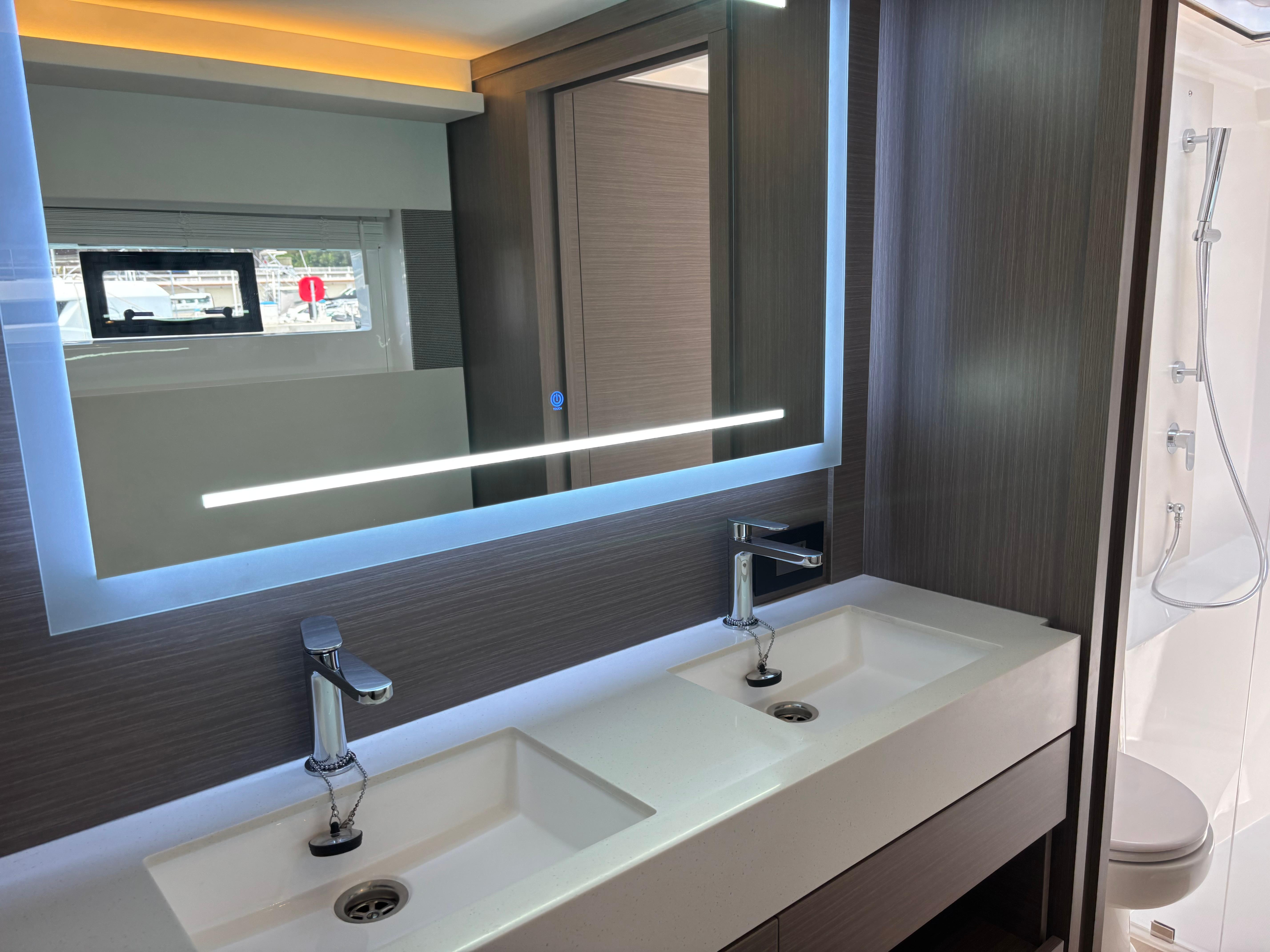 Private quarters, available in three- or four-cabin layouts with ensuite heads, are inviting with generous floorspace and wide bunks that are accessible from each side. Here, you can move about effortlessly and set up home with all your personal effects. Most notably, cabins feel like true private quarters, with comfortable beds, soft furnishings and smart lighting that avoids glare and dark spots and instead casts warm, consistent lighting throughout the room. All cabins include their own private ensuite heads, with the primary suite head featuring a vanity mirror with a semi-translucent perimeter strip and concealed lighting. The three-cabin owner's suite boasts a large walk-in closet, desk, and double vanity.