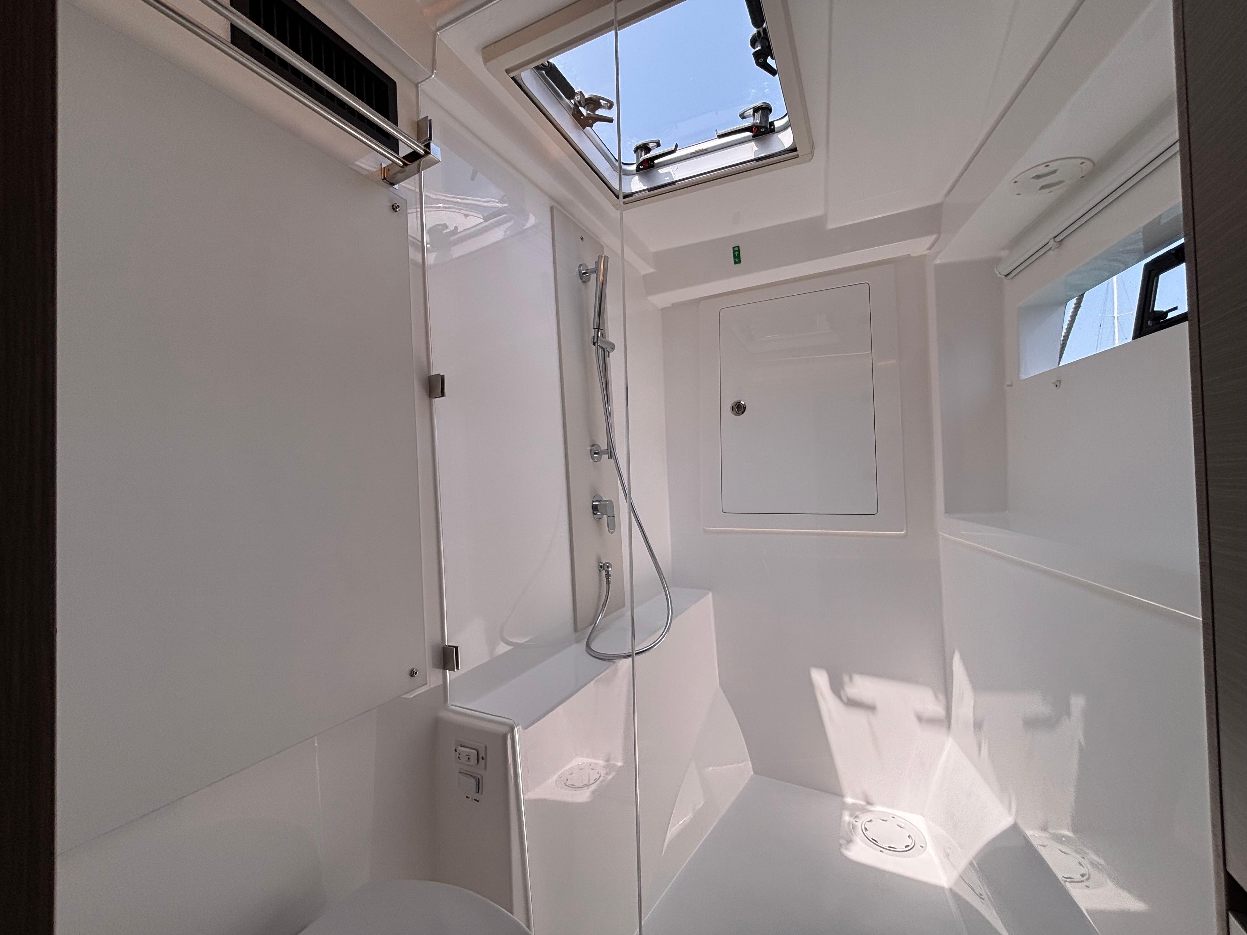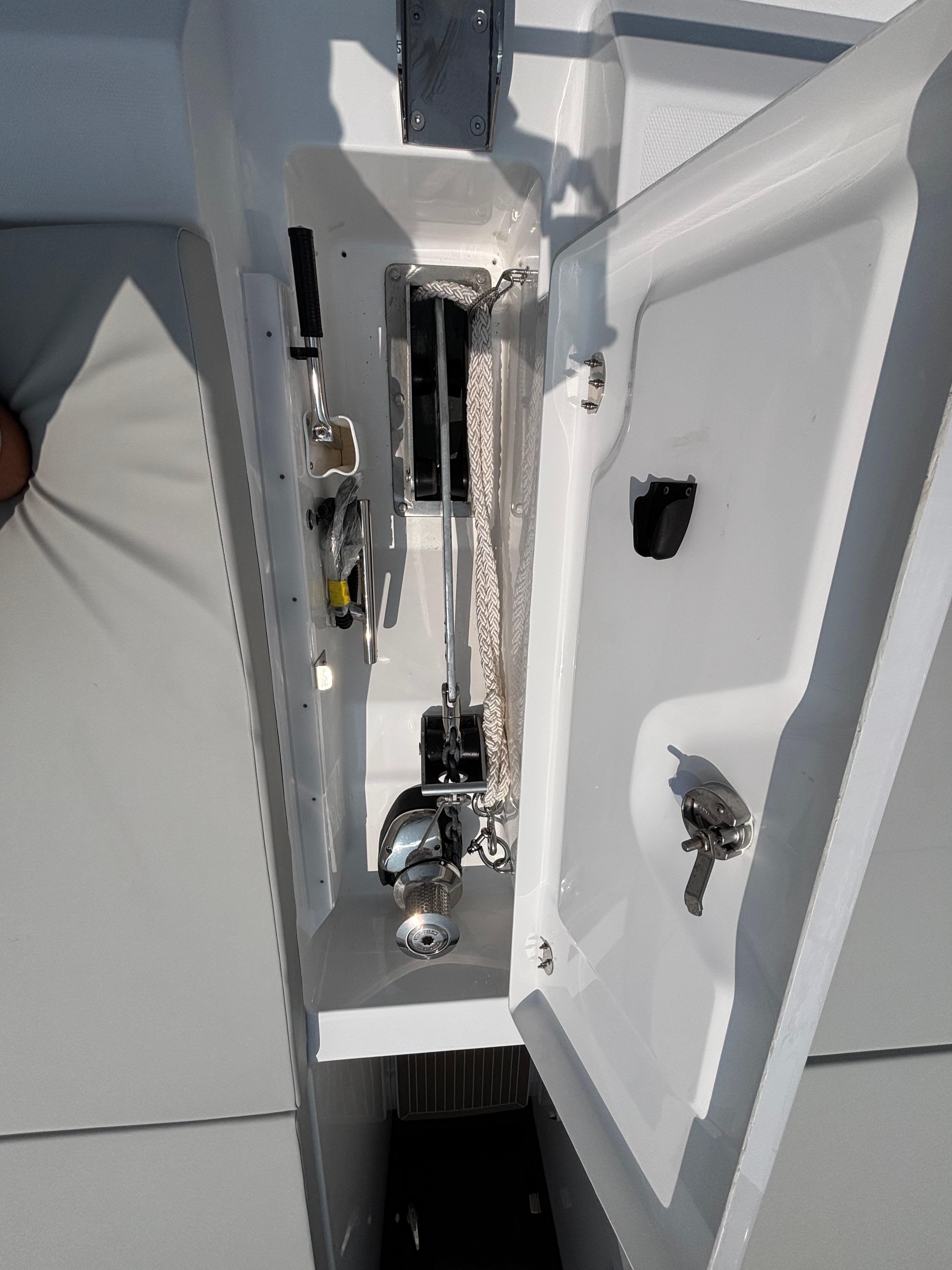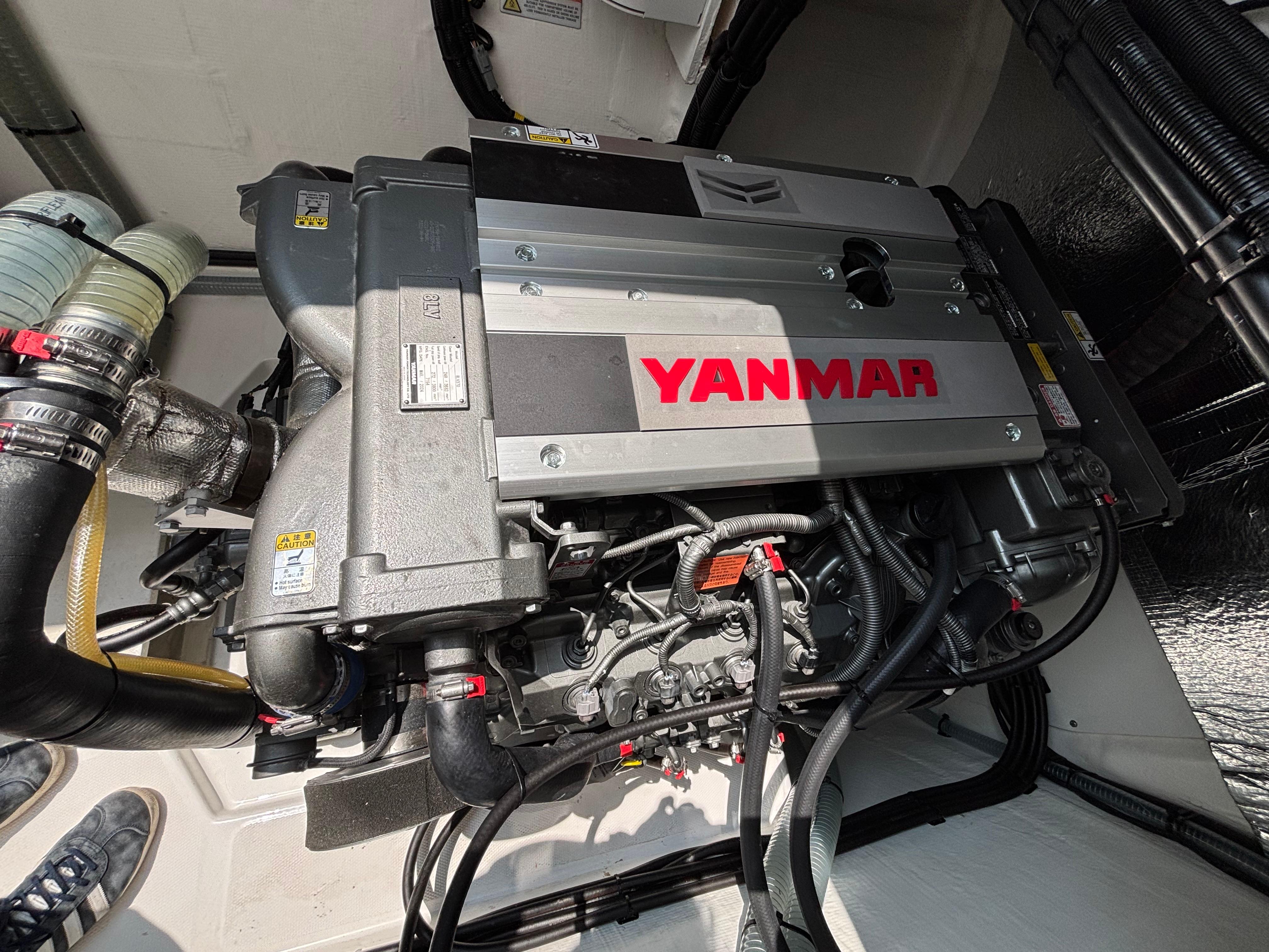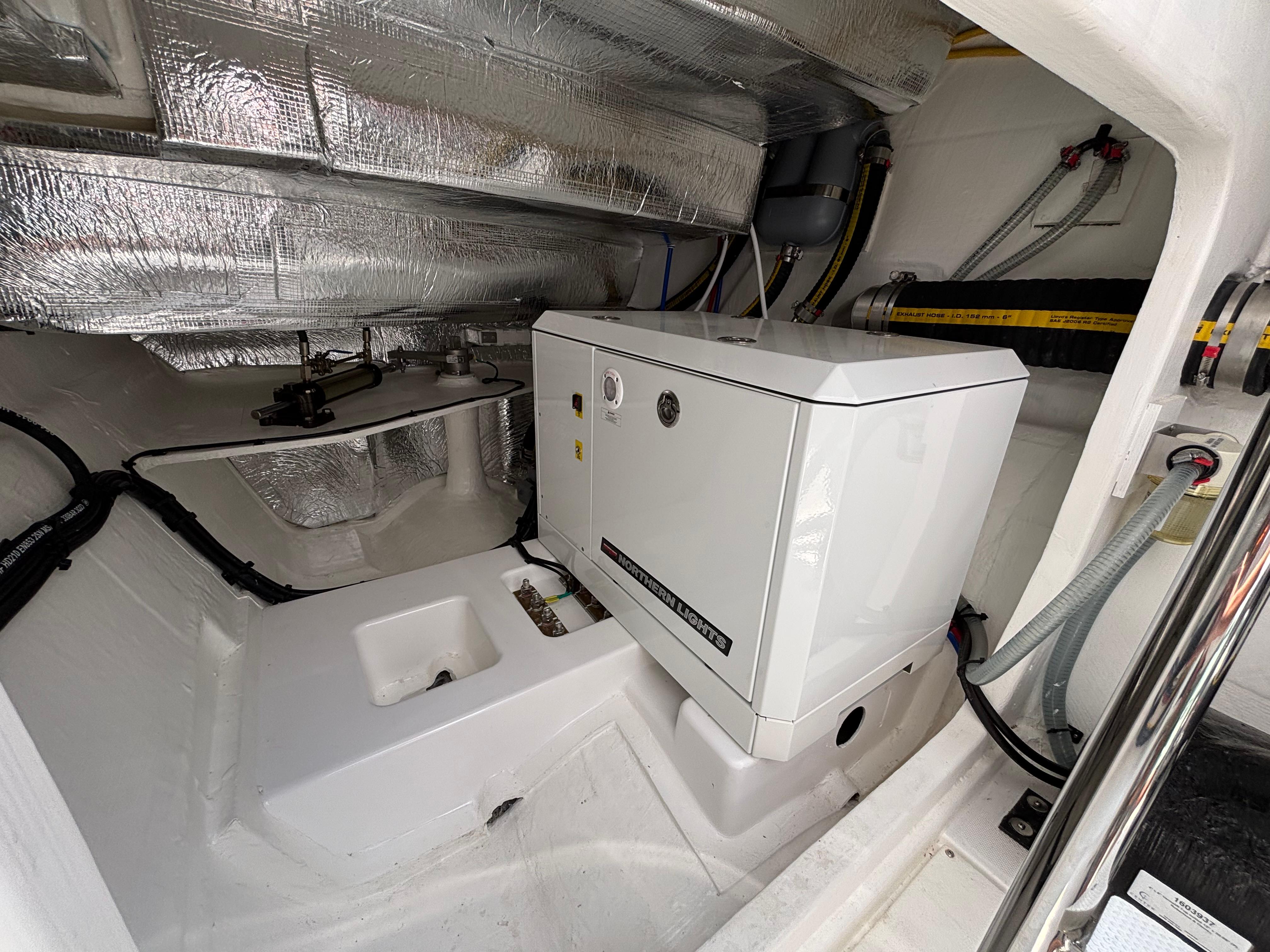 A separate engine room is completely sealed off from the living space, substantially reducing engine noise and odors. Here, access can be found via a large deck hatch with a step ladder for easy entry. All major systems, complete with intuitive functionality, are housed in the engine room.
