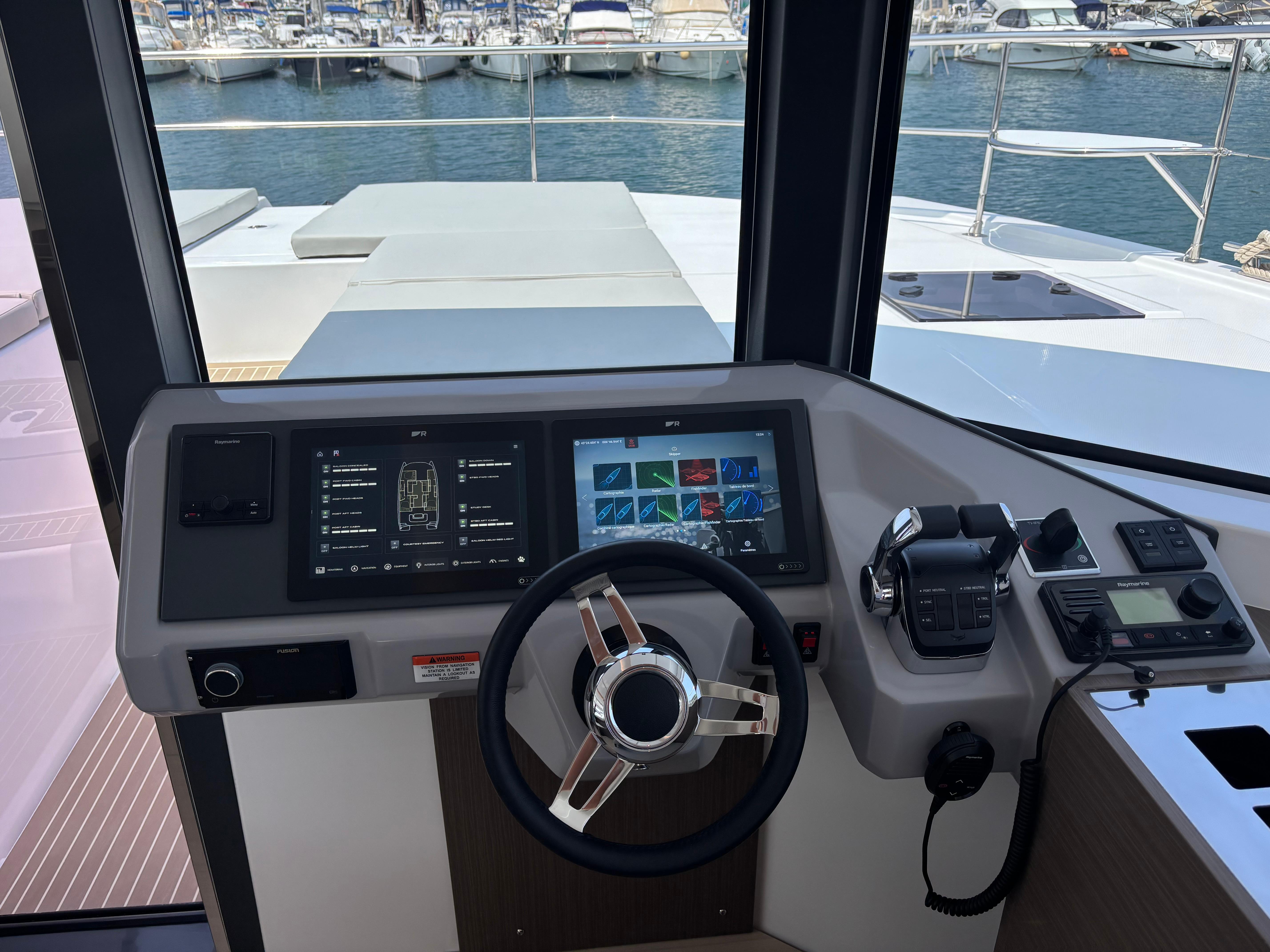 Marine Stereo. Includes Wifi and Bluetooth connectivity. Speakers in saloon (2), aft cockpit (2), fwd. cockpit (2) & flybridge (2). Wired remote controls in fwd cockpit (1), aft cockpit (1) & flybridge (1). – Note: Raymarine MFD’s (not included in option) & personal wireless devices