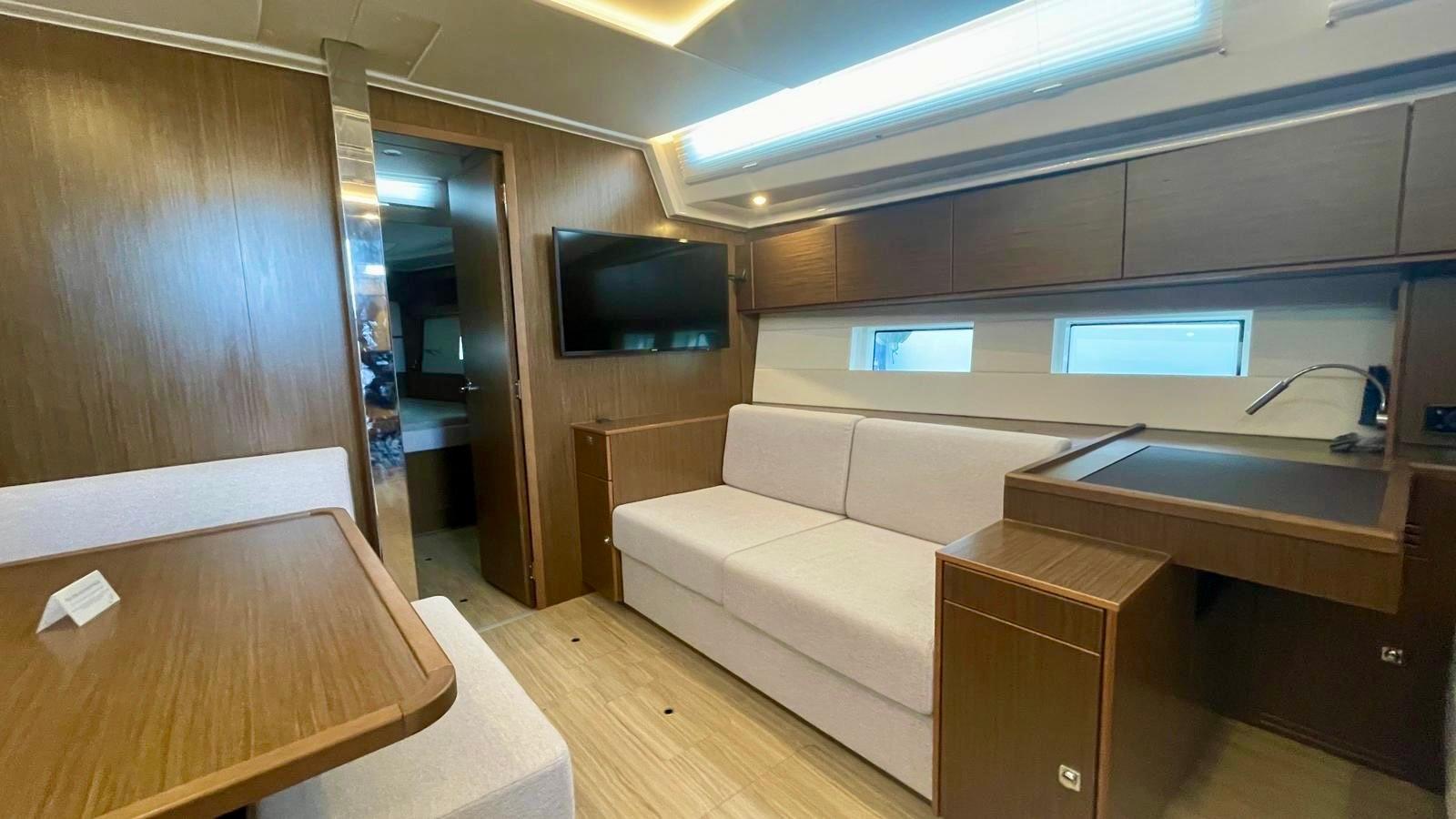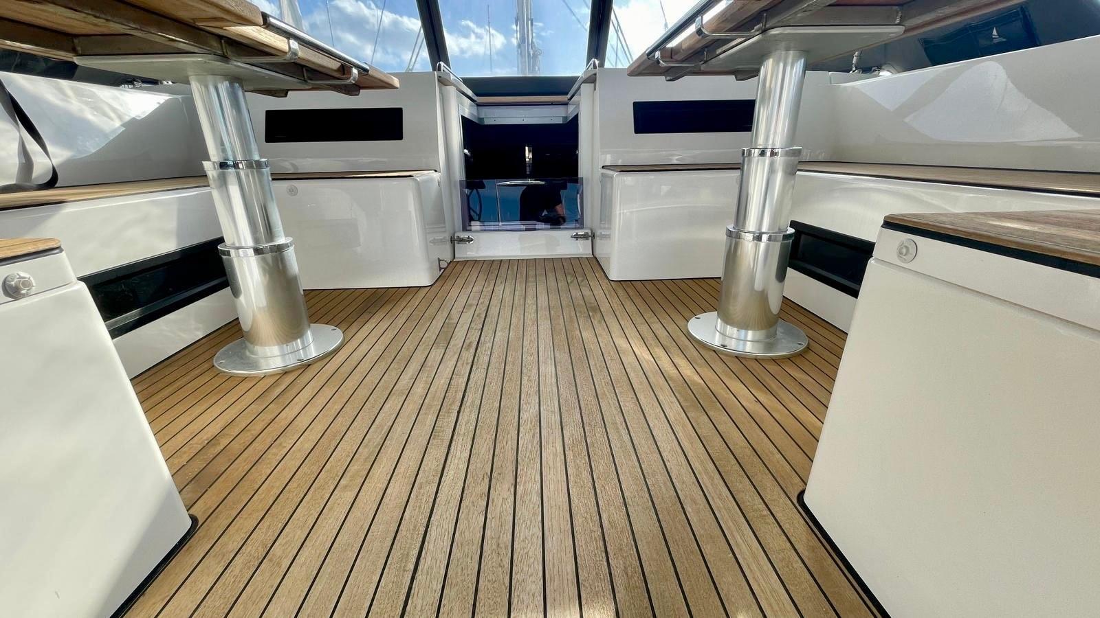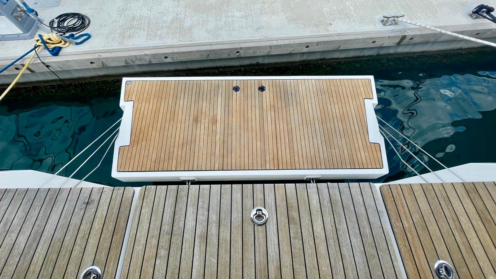 Outdoors, an electric table, deck cushions, a bimini top, a carbon fiber gangway, and a retractable swim platform maximize comfort and enjoyment.