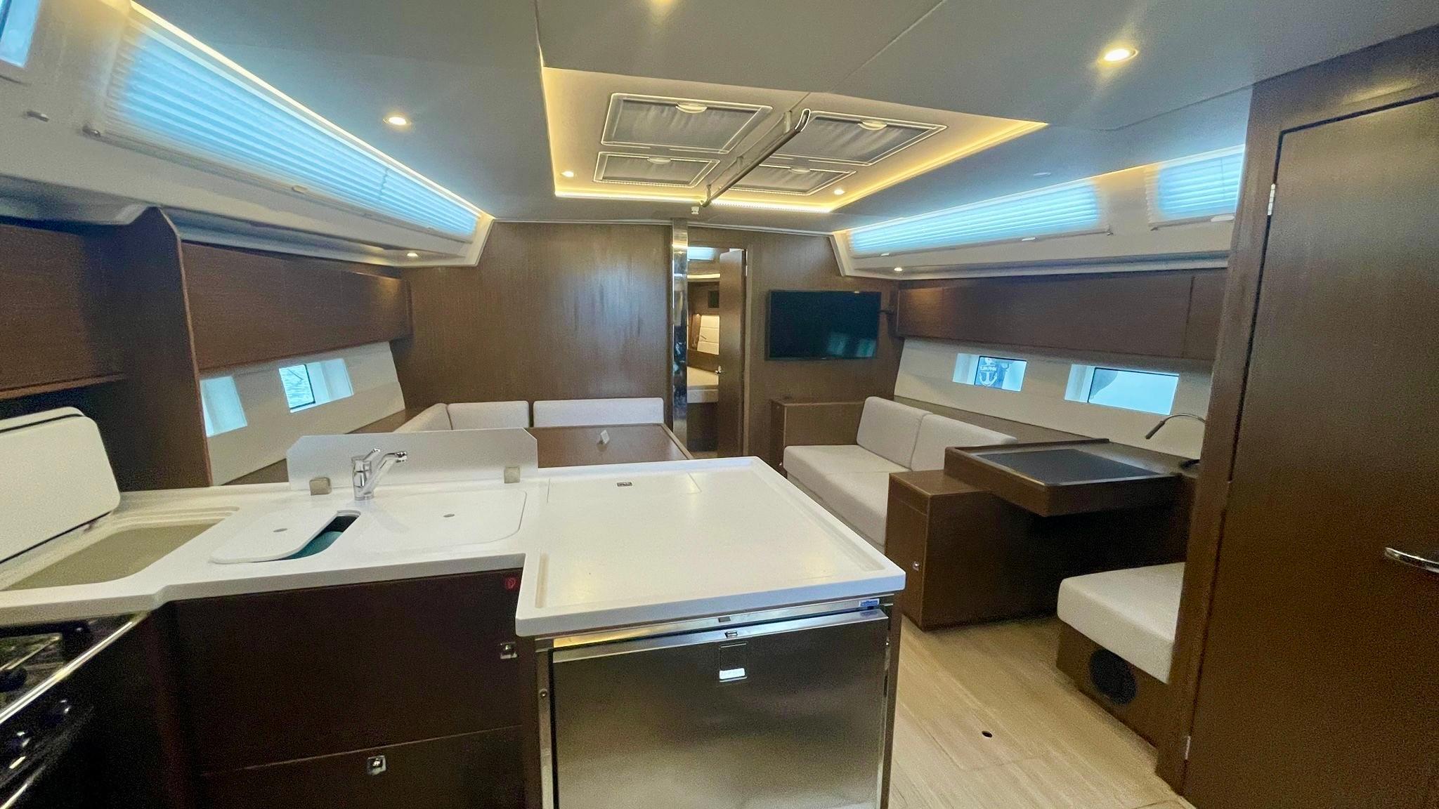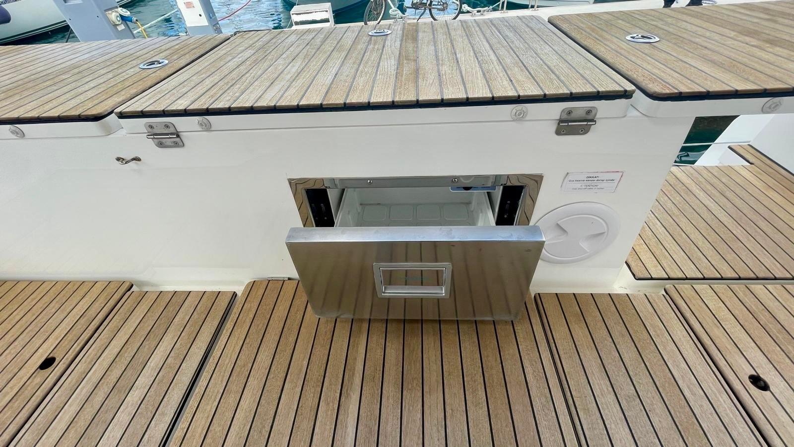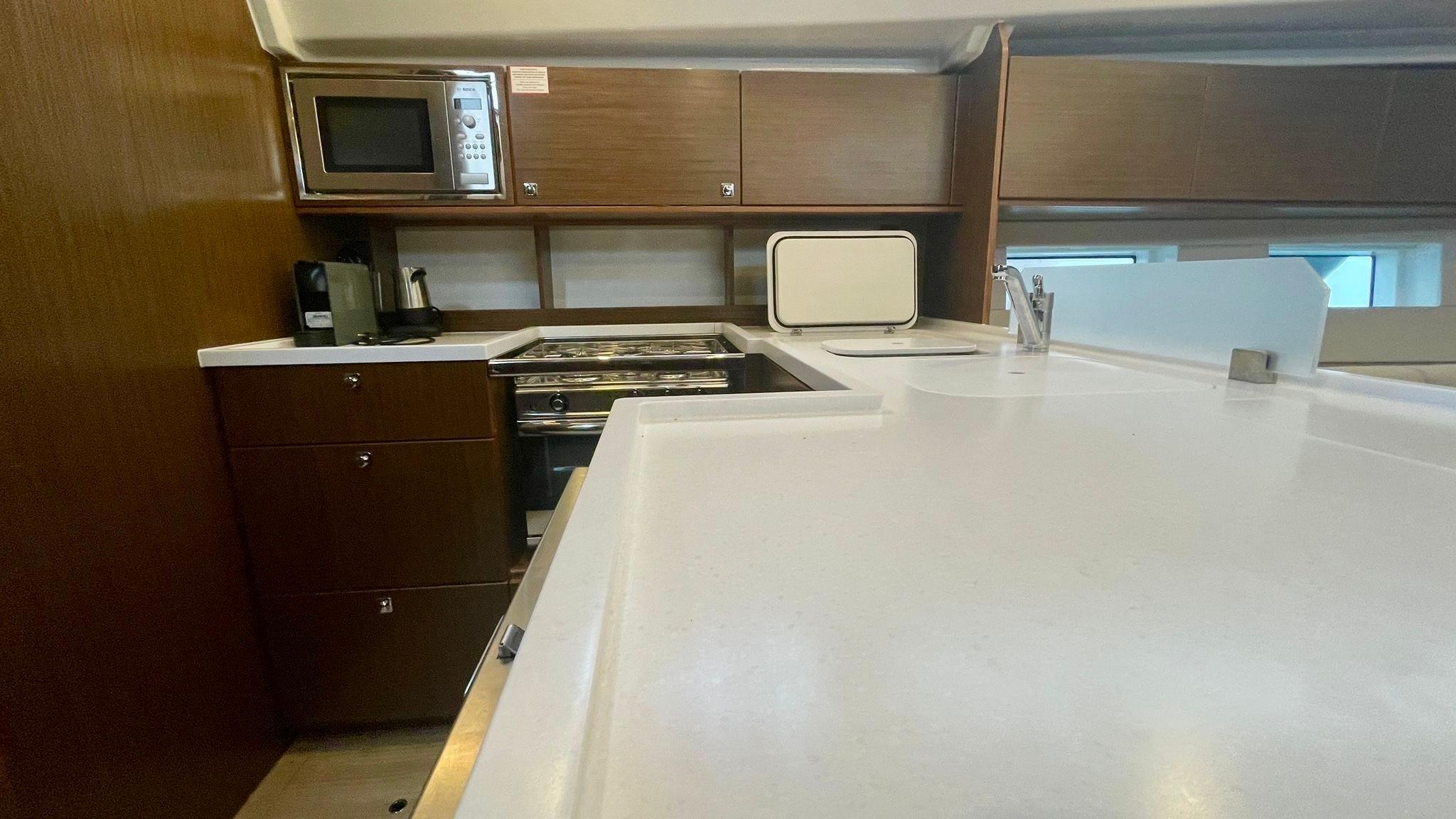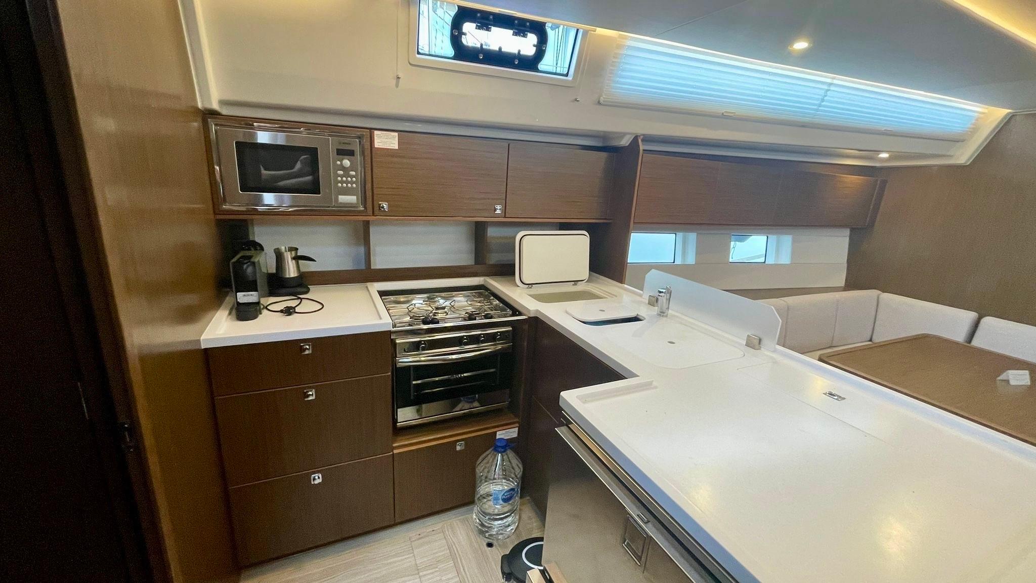 The fully equipped galley features three refrigerators, a microwave, a stove, an oven, and even an outdoor cockpit freezer and barbecue, allowing you to prepare your favorite meal. It offers a true living space for those planning to spend extended time at sea.