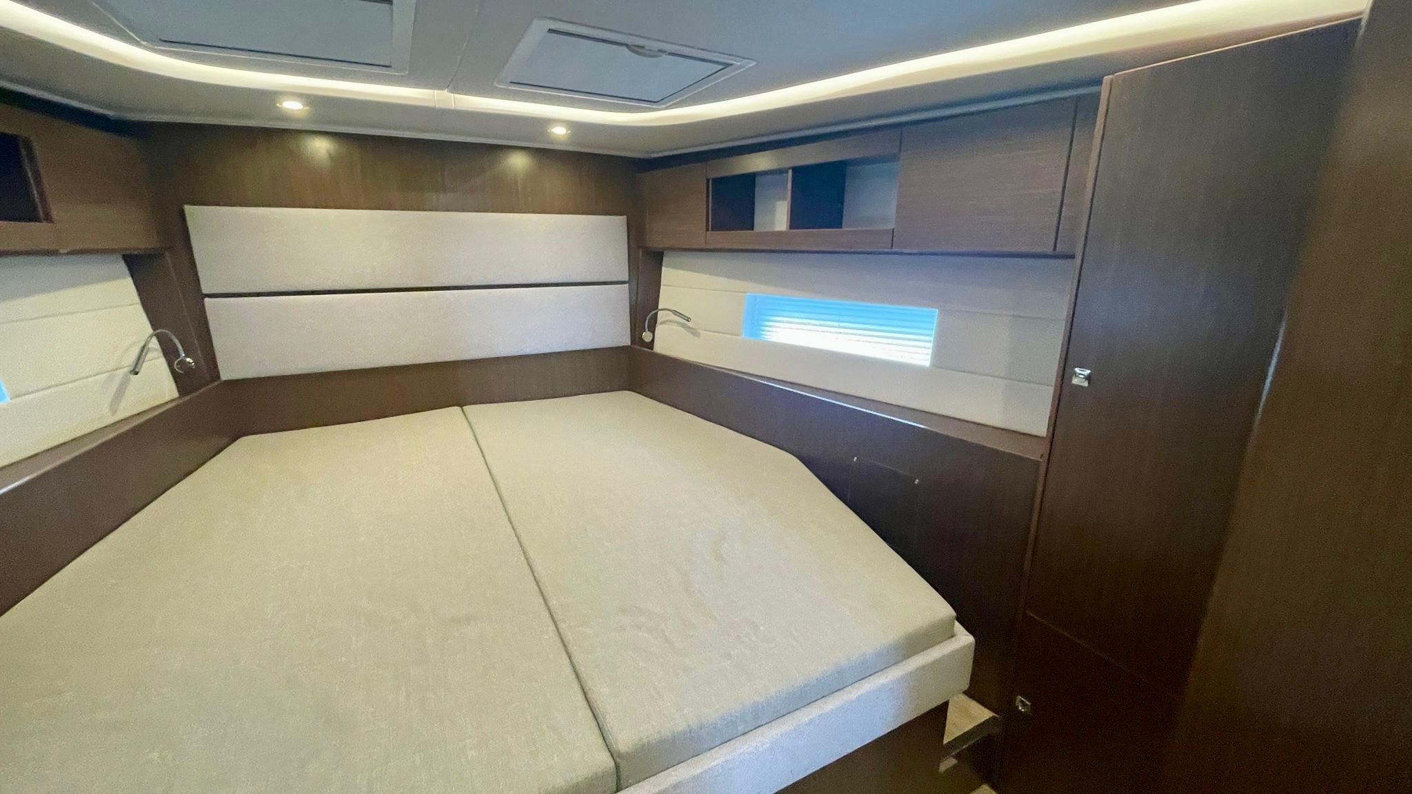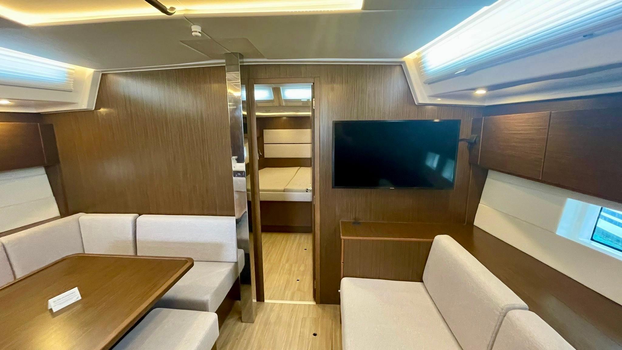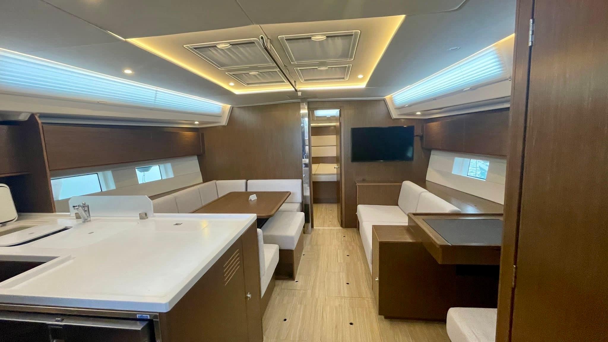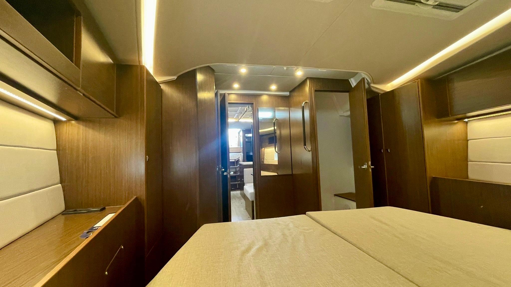 The interior welcomes you with three spacious cabins, each with a private shower/WC. There is also a separate cabin and bathroom area for crew. Details such as the electric table, hot water system, TV, Fusion sound system and a table that can be converted into a bed, which take comfort to the next level, make the boat feel like home.