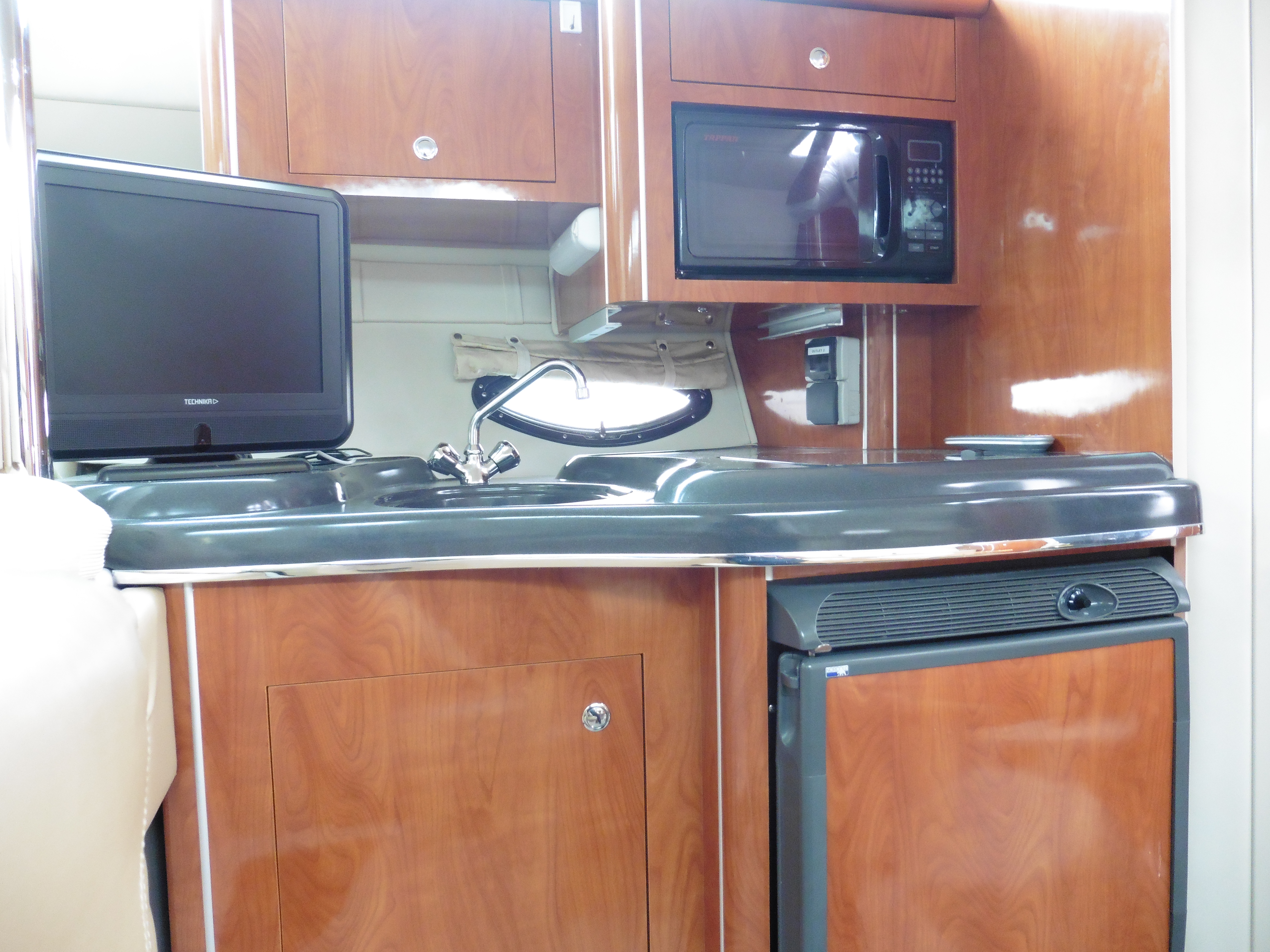 Wet bar with sink and fridge behind helm