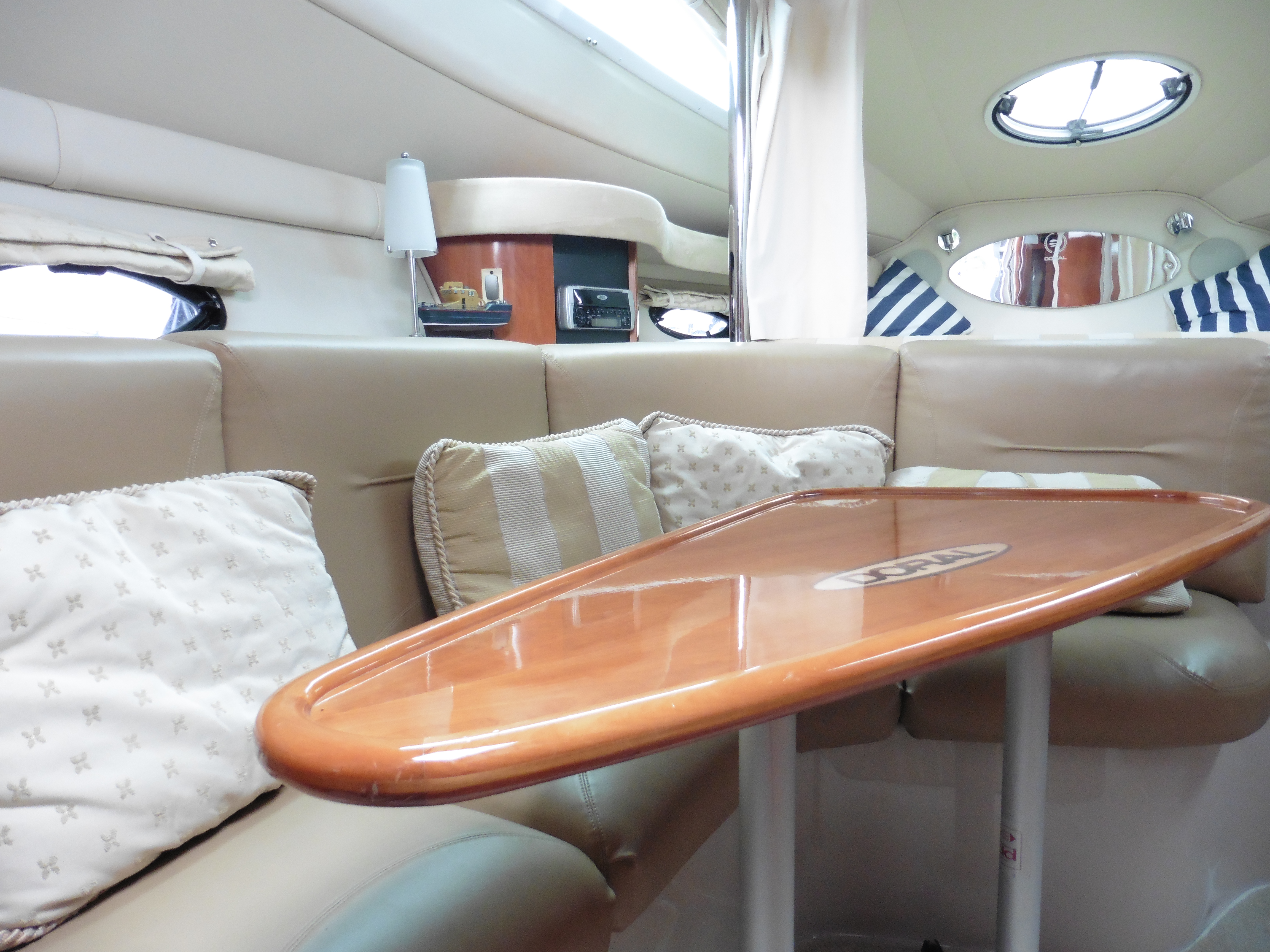 "L" shaped dinette area to port with a wooded table