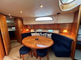 Teardrop shaped varnished wood table with L shaped seating to port for about 5 passengers
