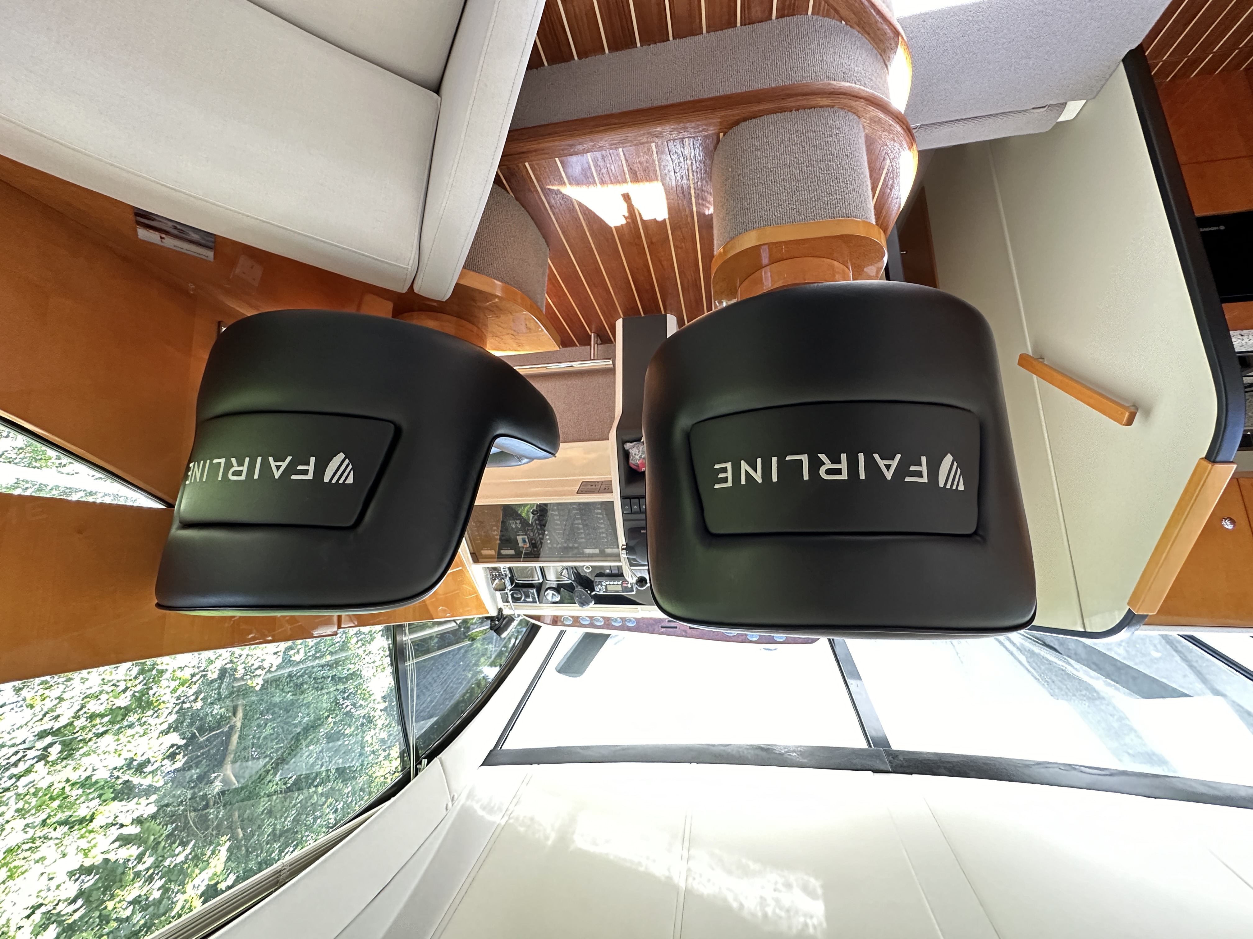 Adjustable helm seat on fly-bridge. 2 x co-pilot seats on fly-bridge - newly upholstered by Setag 2022