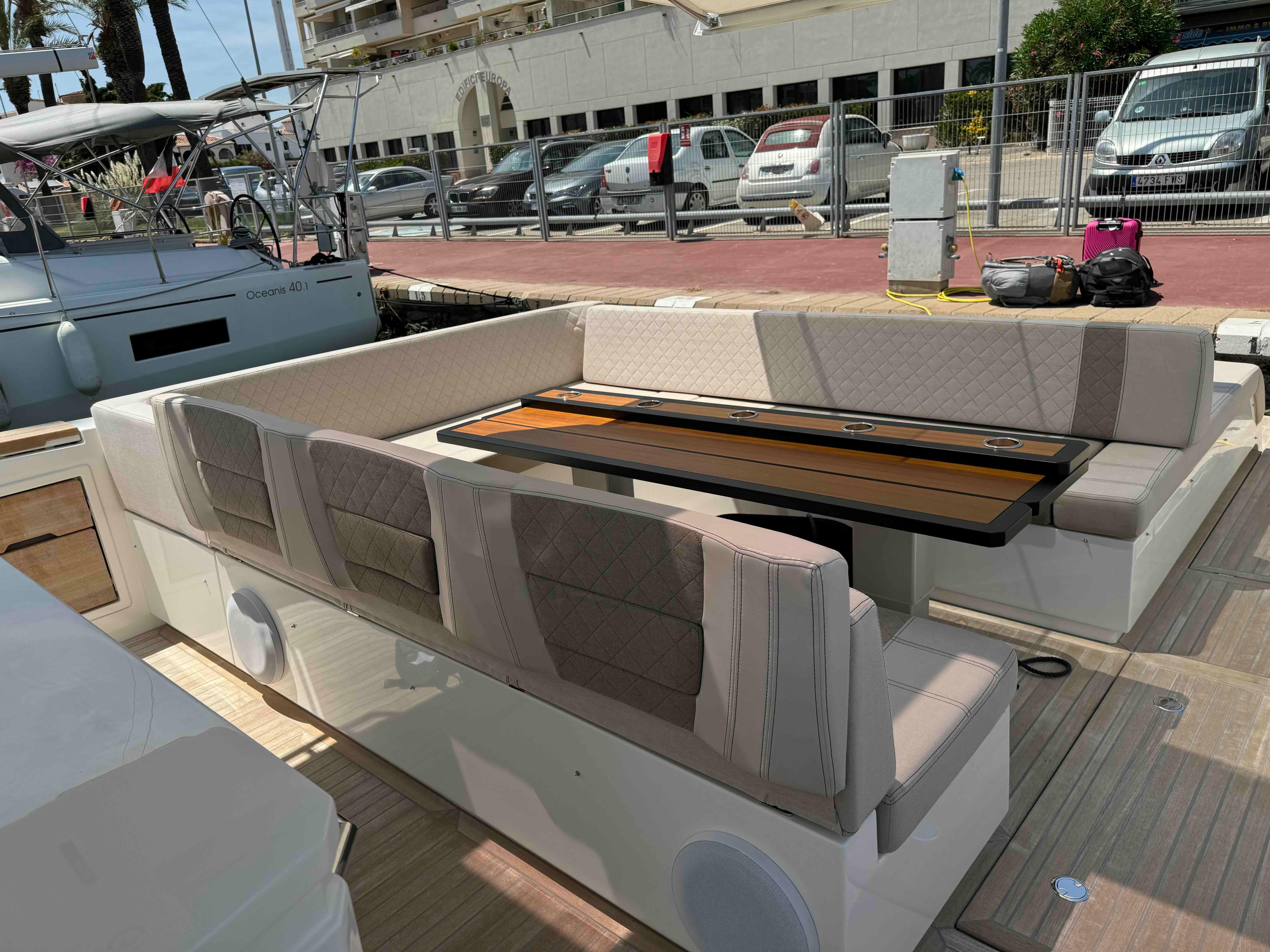 Teak & Comfort: Teak cockpit and bathing platform, hydraulic bathing platform, sun cushion on foredeck (Sunbrella/Niroxx), folding boarding steps