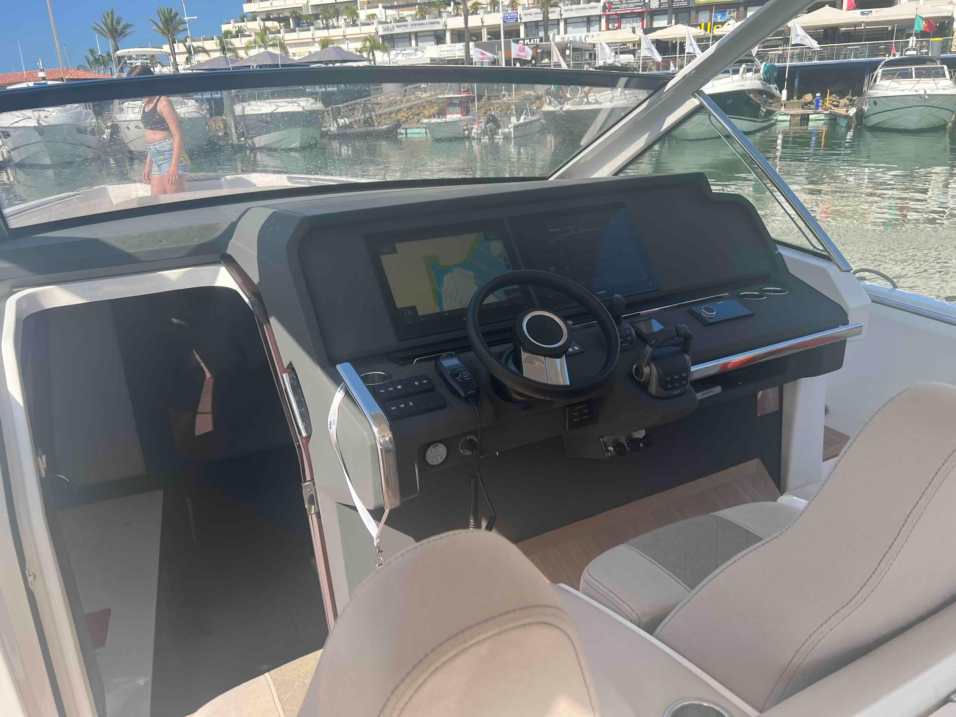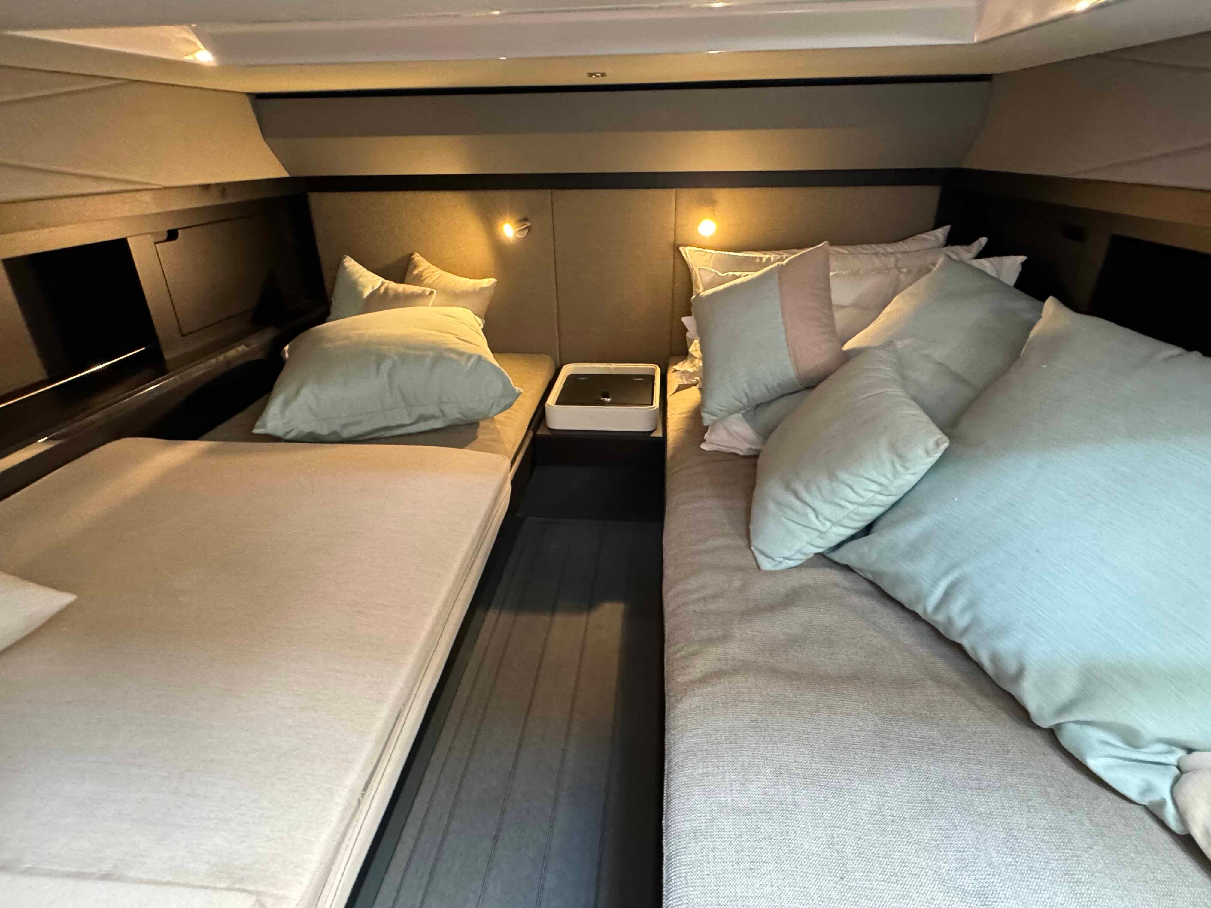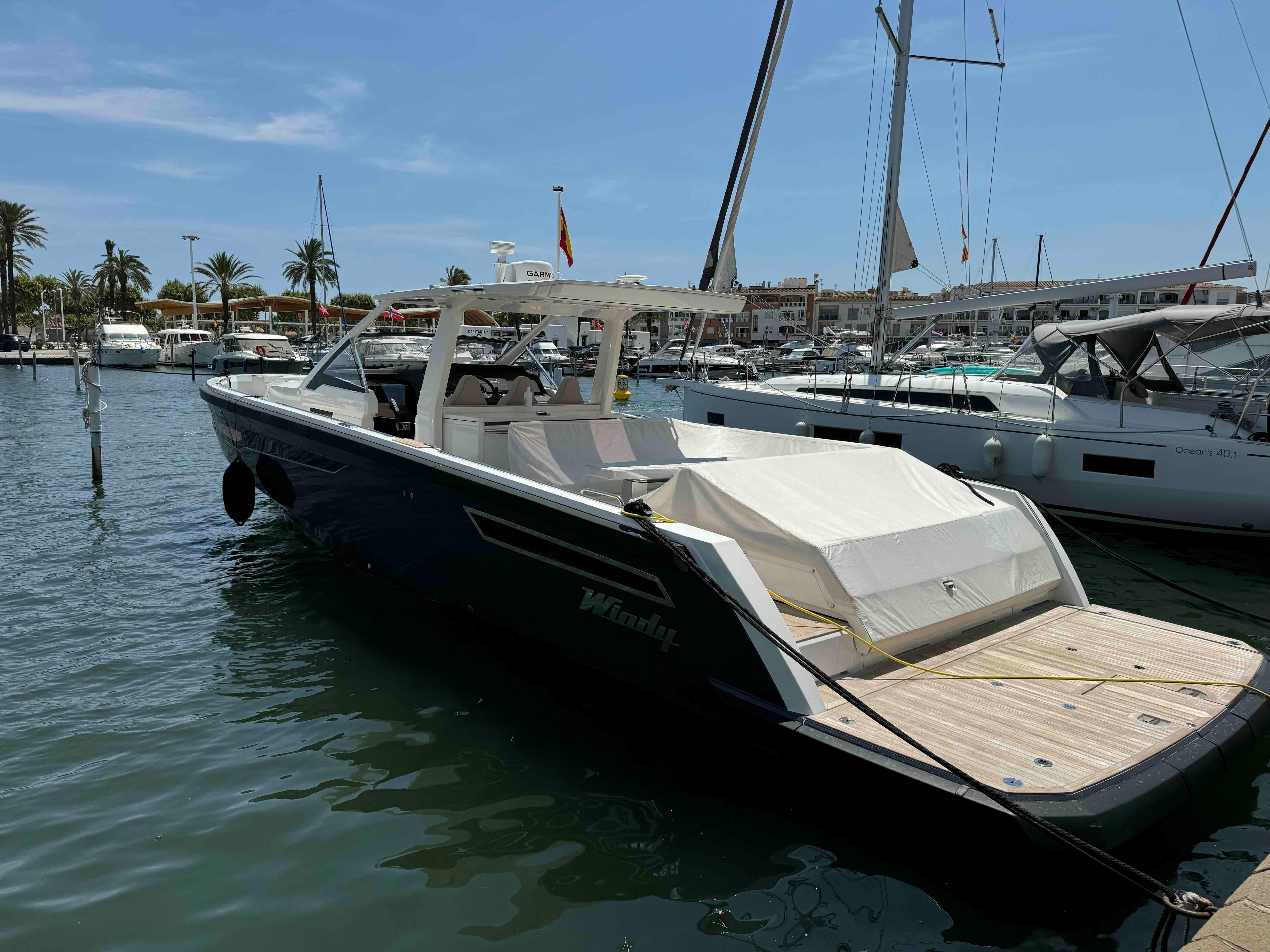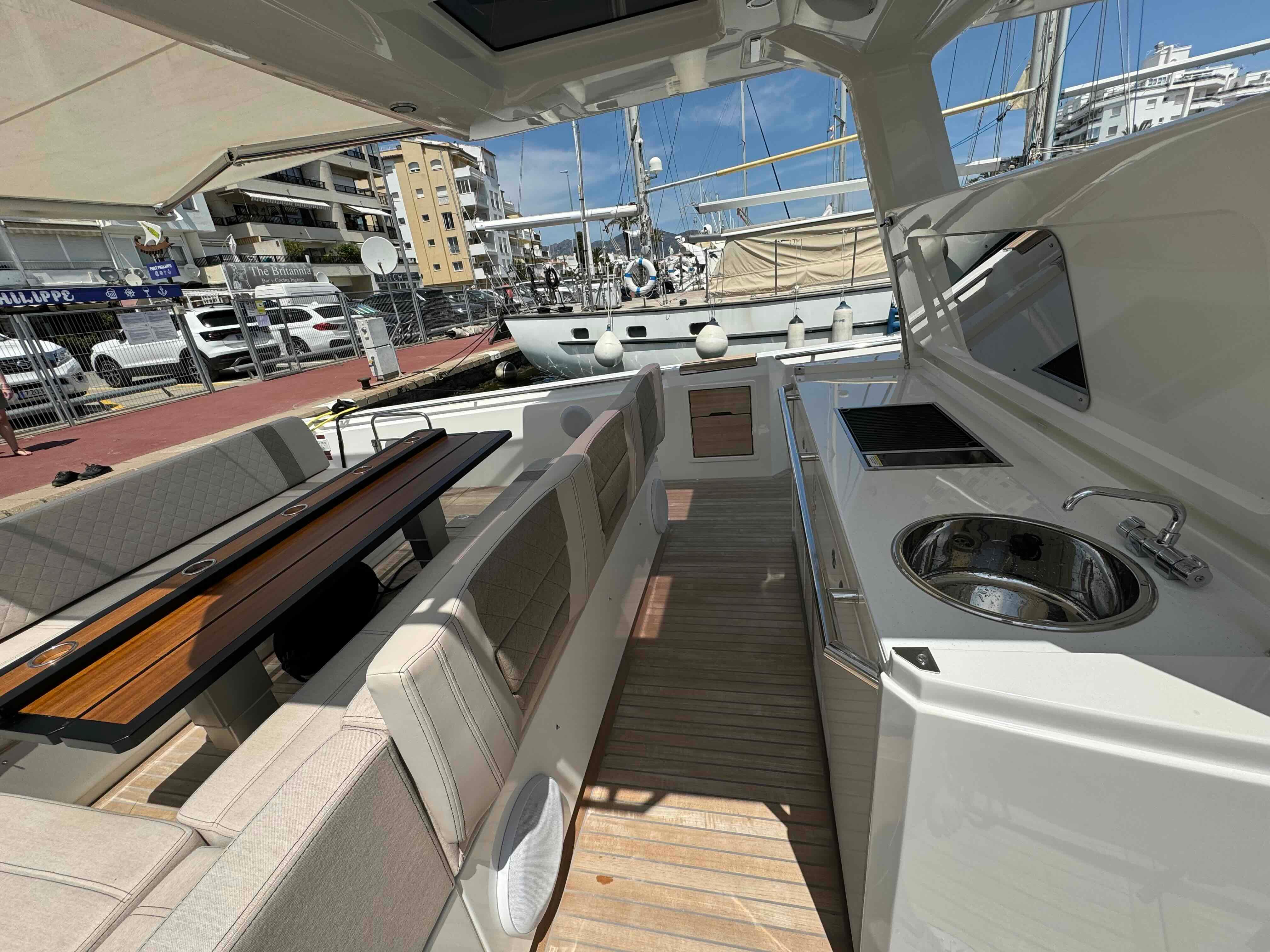 Extras: Shrink wrap transport protection, antifouling (€7,750), shore power with charger, septic tank with electric pump, windshield washer, water ski pole (x2), mooring kit (anchor, 4 ropes, 4 fenders w/ Windy socks), dashboard with Nextel finish, opening hatch in aft cabin, cover sets (instruments & harbour covers HH Lightex), scatter cushion set (SR44)