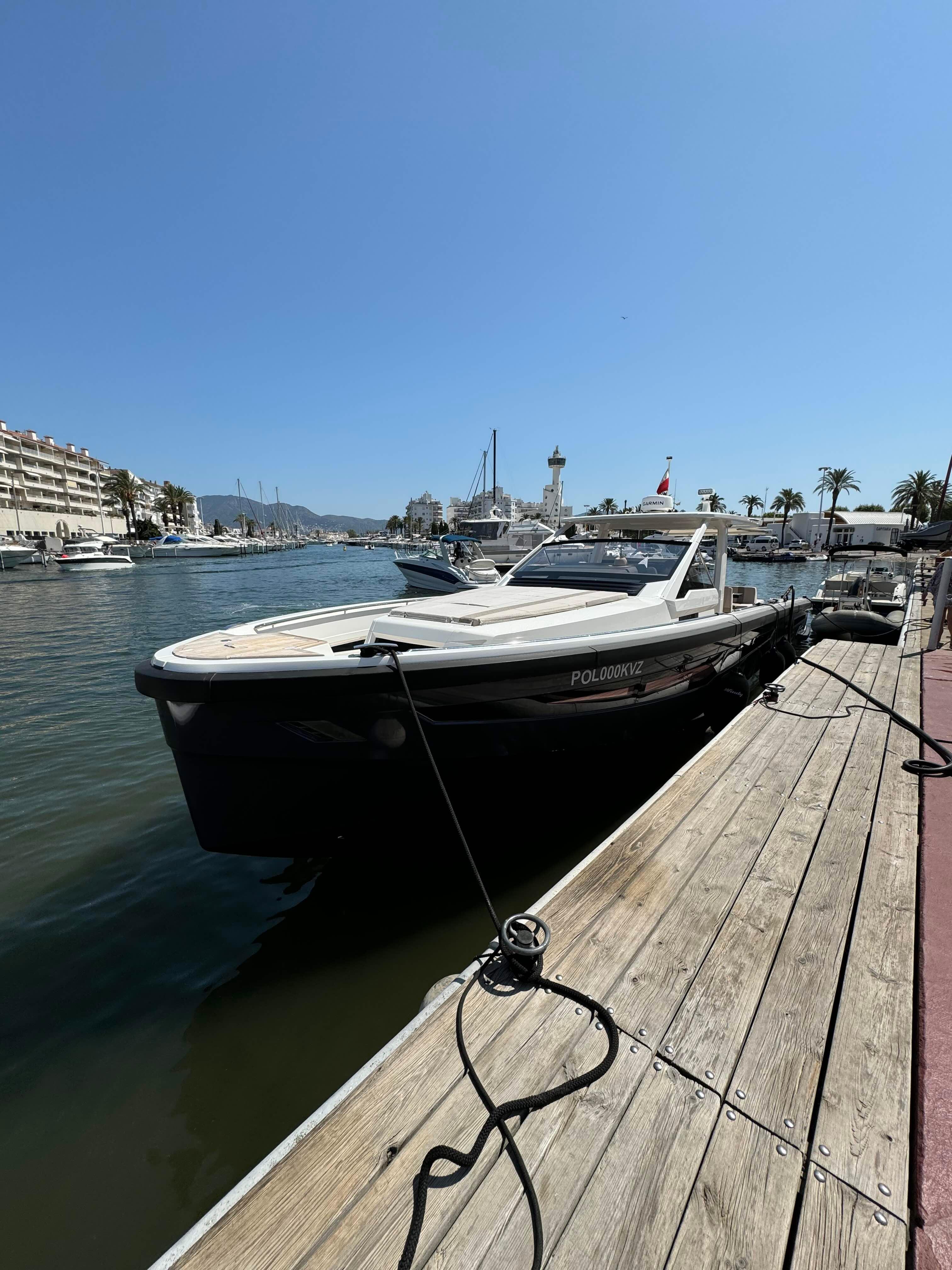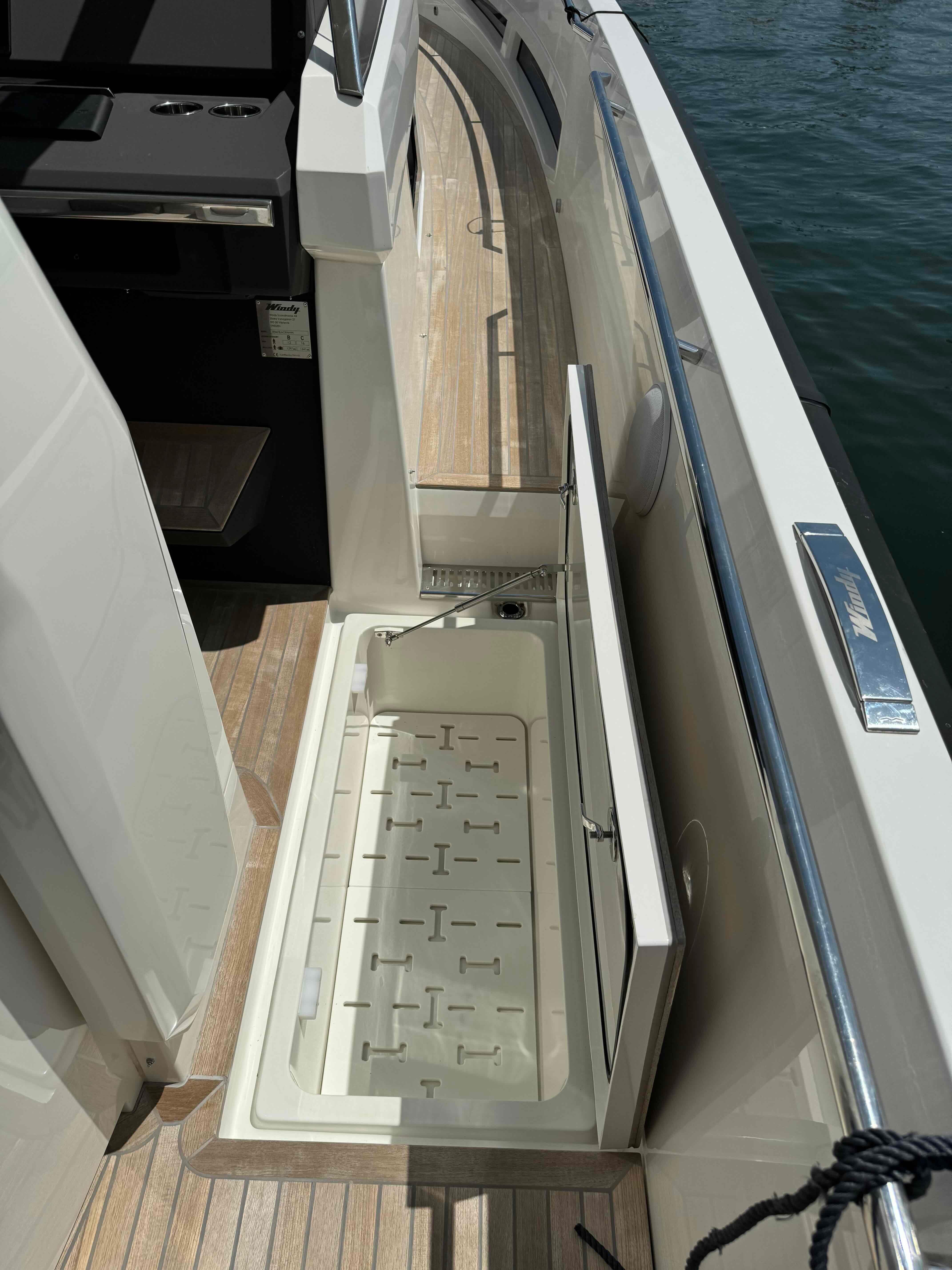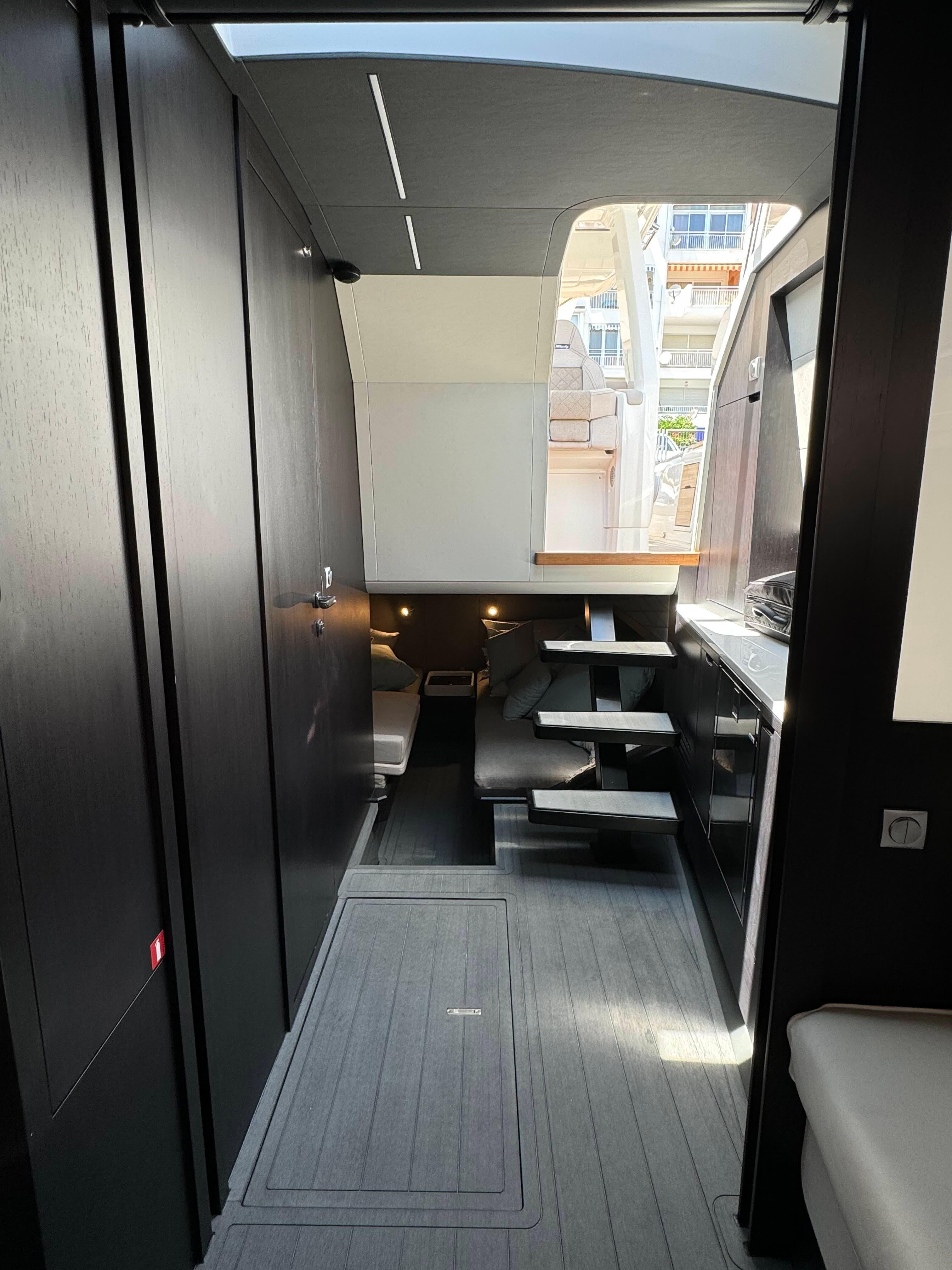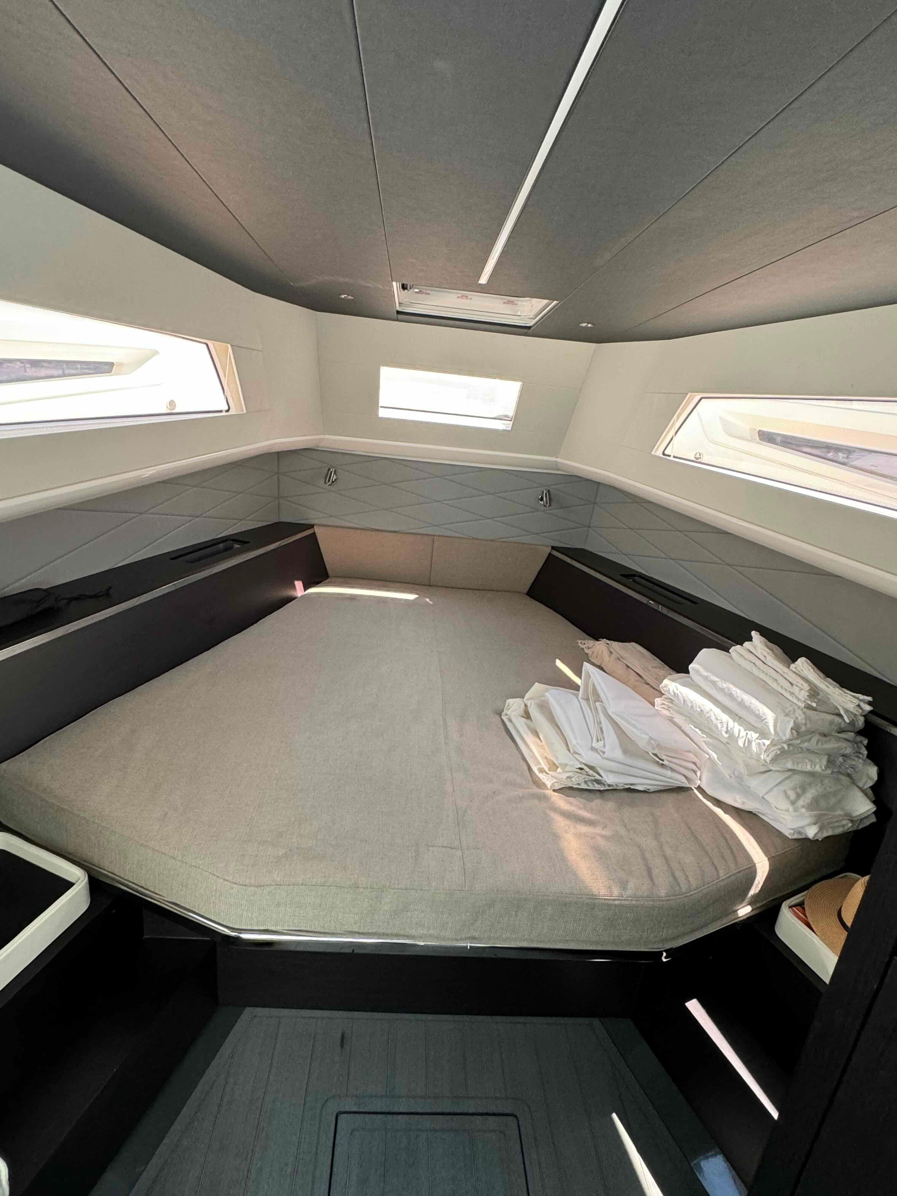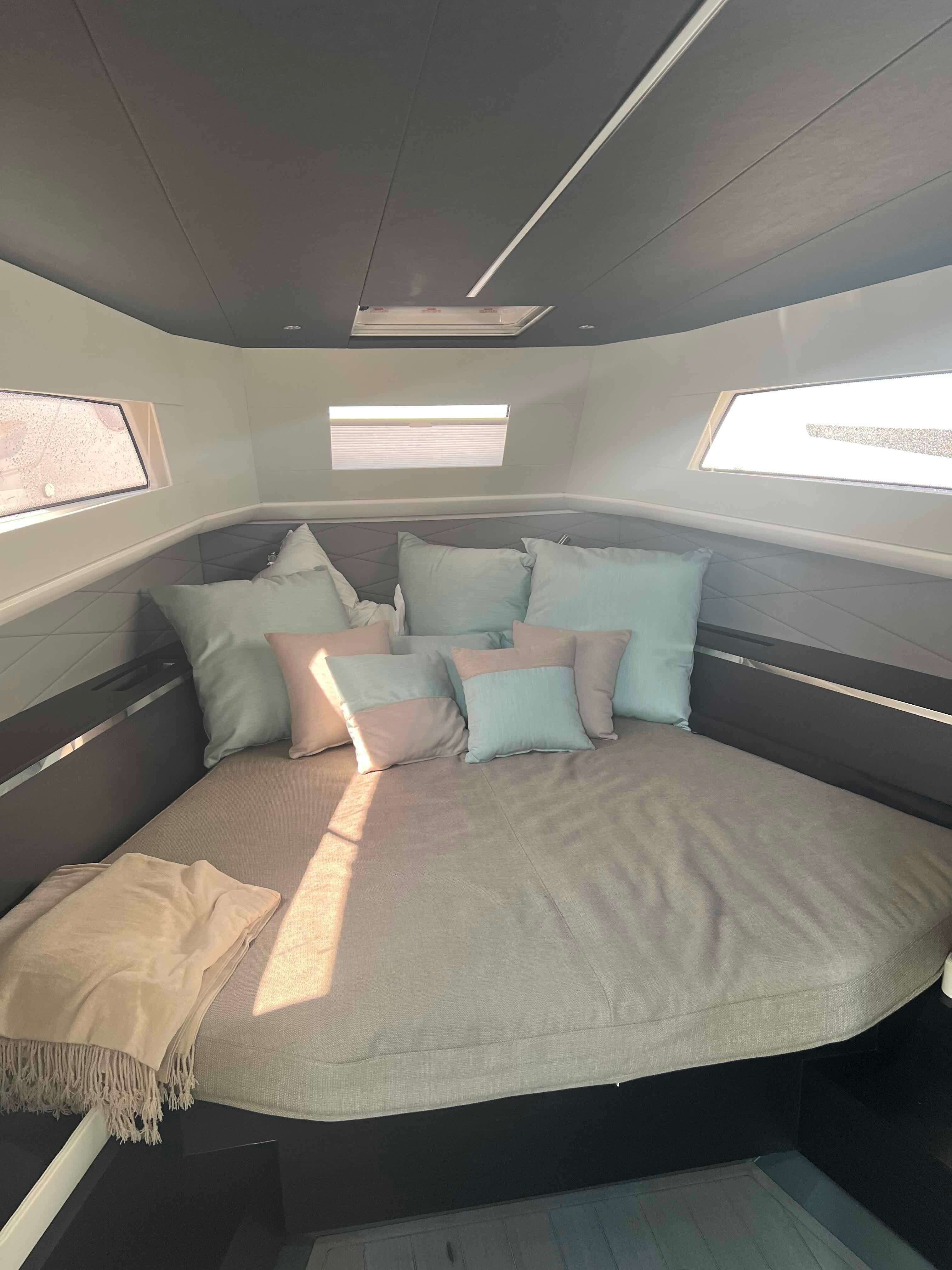 Extras: Shrink wrap transport protection, antifouling (€7,750), shore power with charger, septic tank with electric pump, windshield washer, water ski pole (x2), mooring kit (anchor, 4 ropes, 4 fenders w/ Windy socks), dashboard with Nextel finish, opening hatch in aft cabin, cover sets (instruments & harbour covers HH Lightex), scatter cushion set (SR44)
