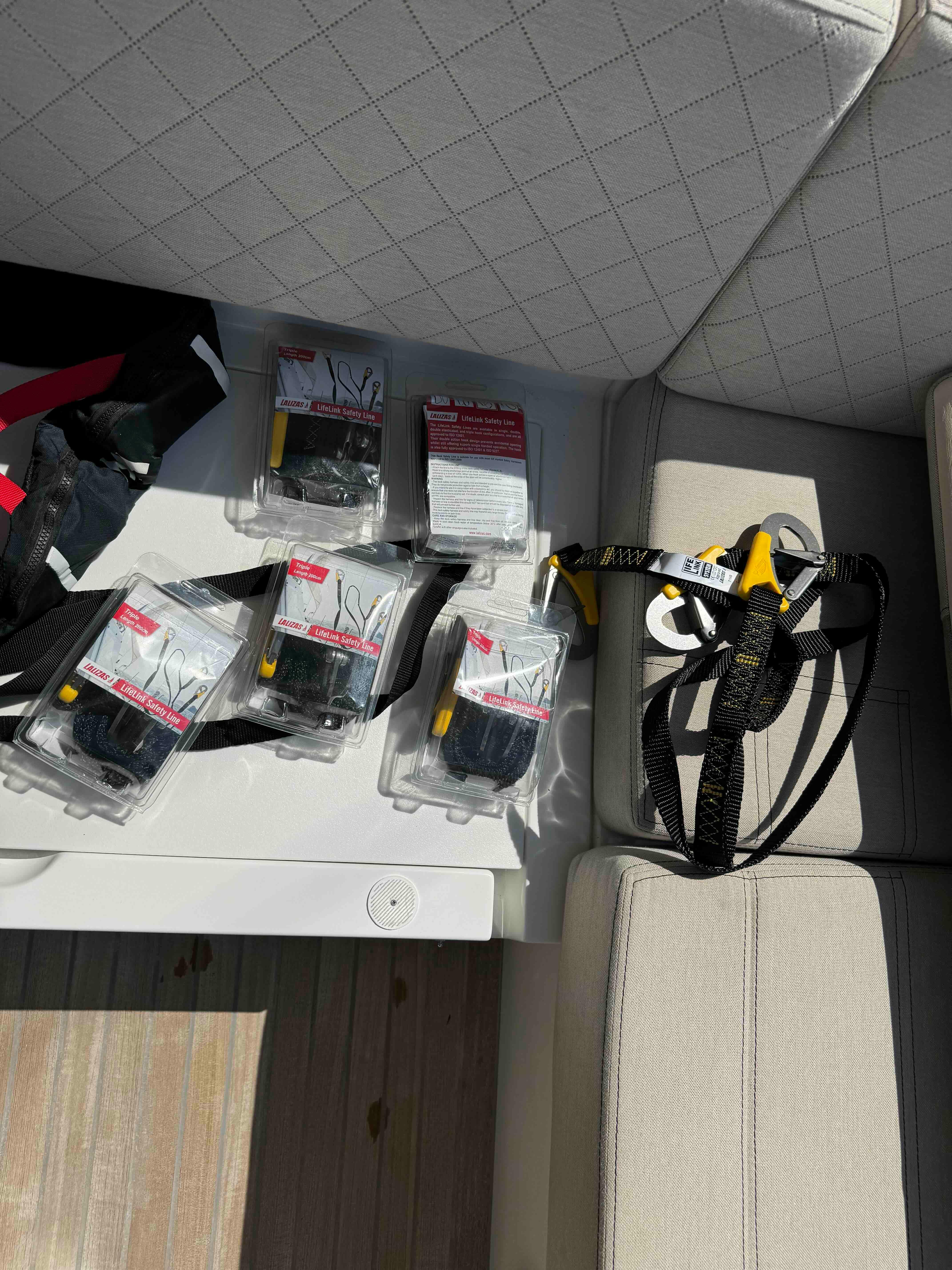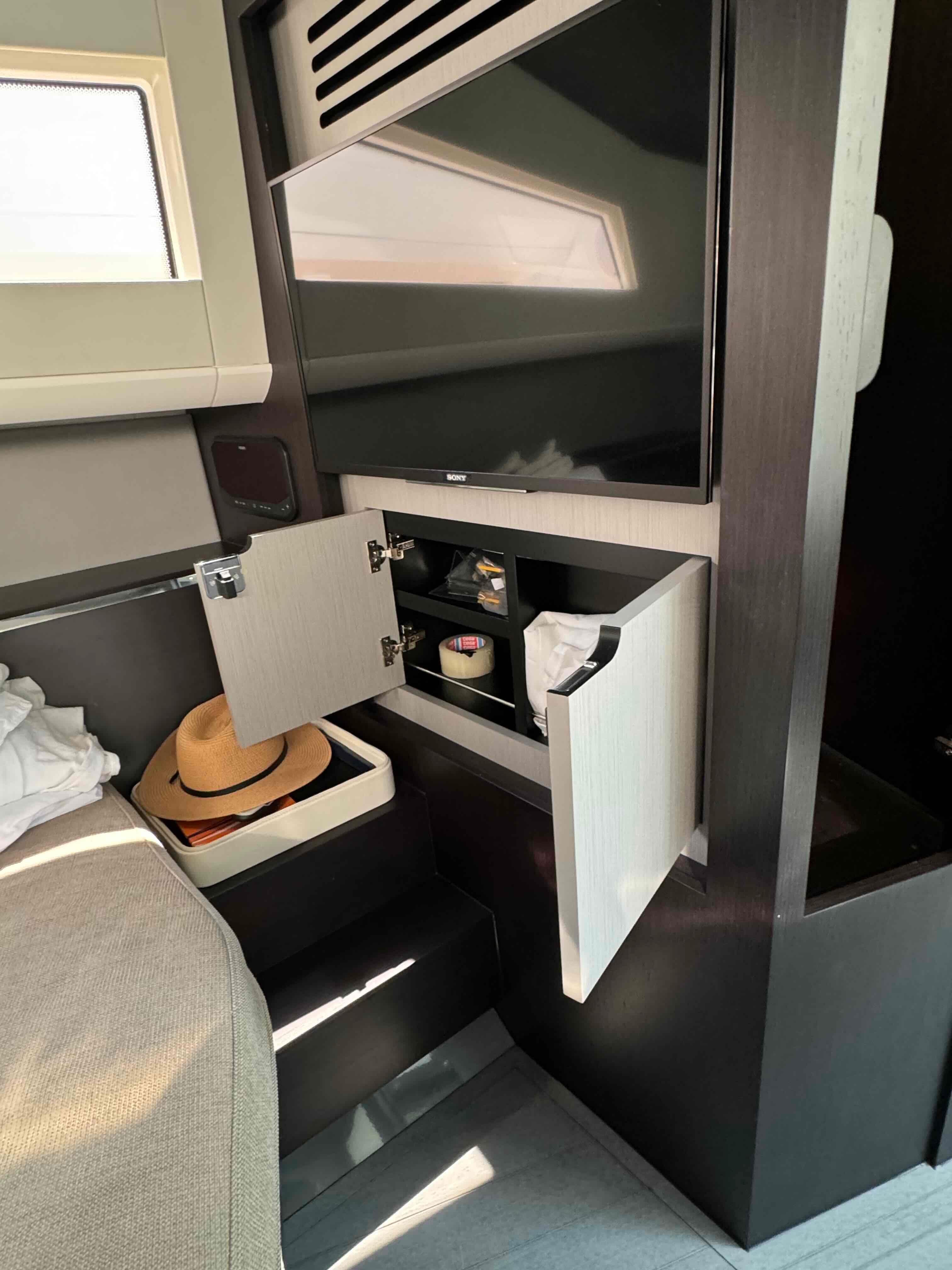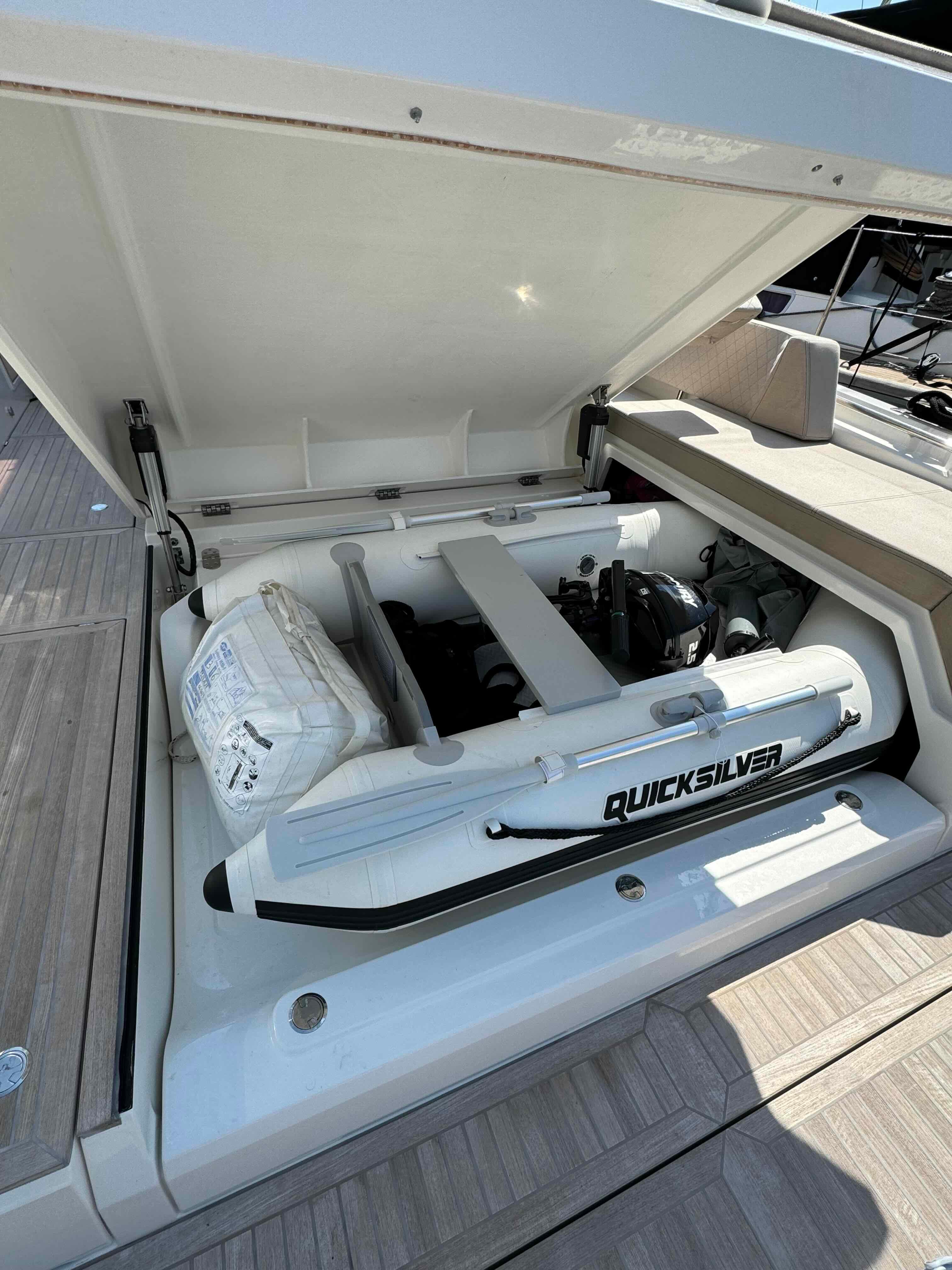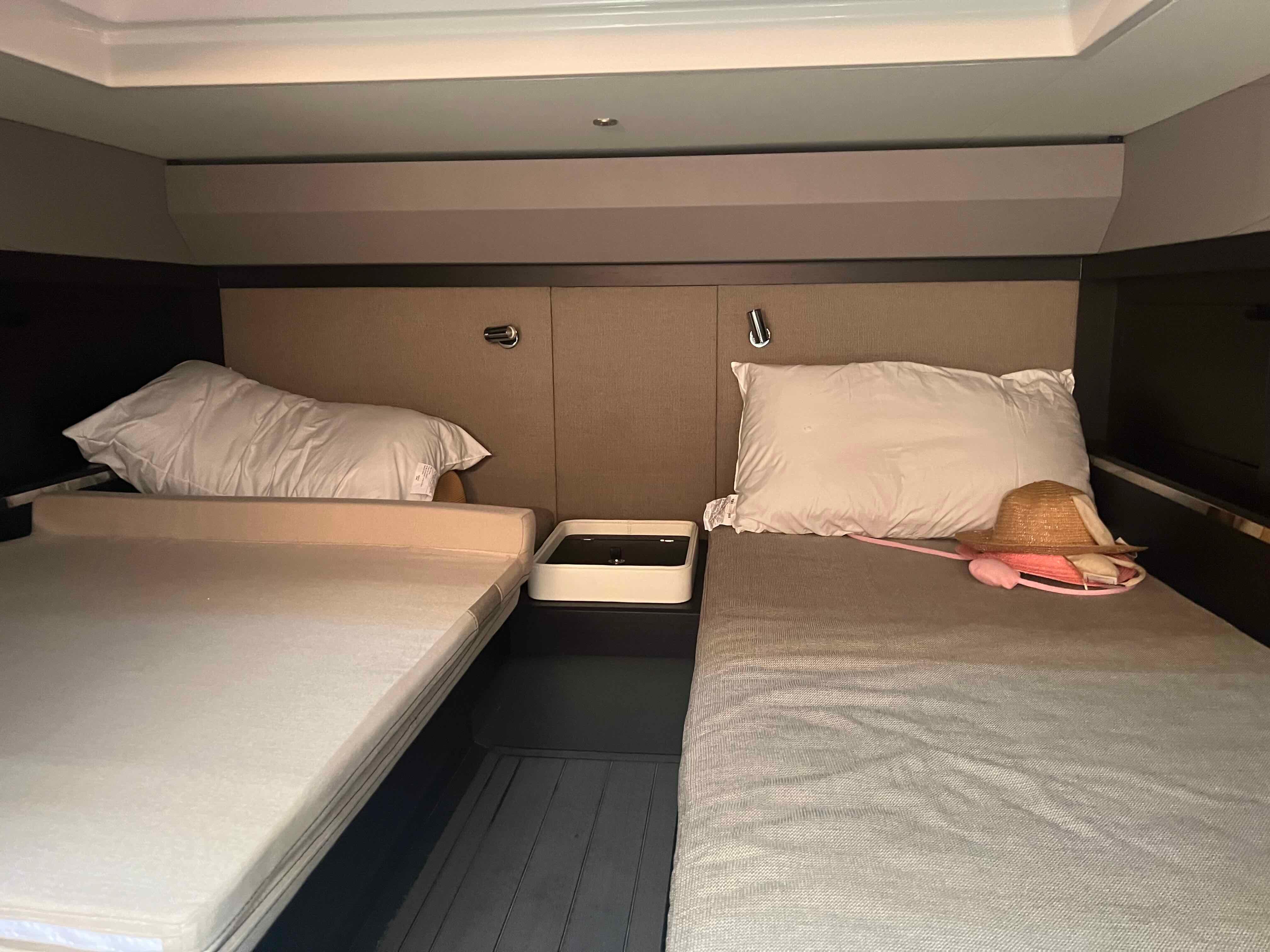 Extras: Shrink wrap transport protection, antifouling (€7,750), shore power with charger, septic tank with electric pump, windshield washer, water ski pole (x2), mooring kit (anchor, 4 ropes, 4 fenders w/ Windy socks), dashboard with Nextel finish, opening hatch in aft cabin, cover sets (instruments & harbour covers HH Lightex), scatter cushion set (SR44)