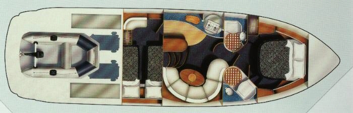 Stylish saloon with "S" shaped dinette with adjustable table, bar unit, entertainment centre, storage lockers, opening ports and sliding door to cockpit.