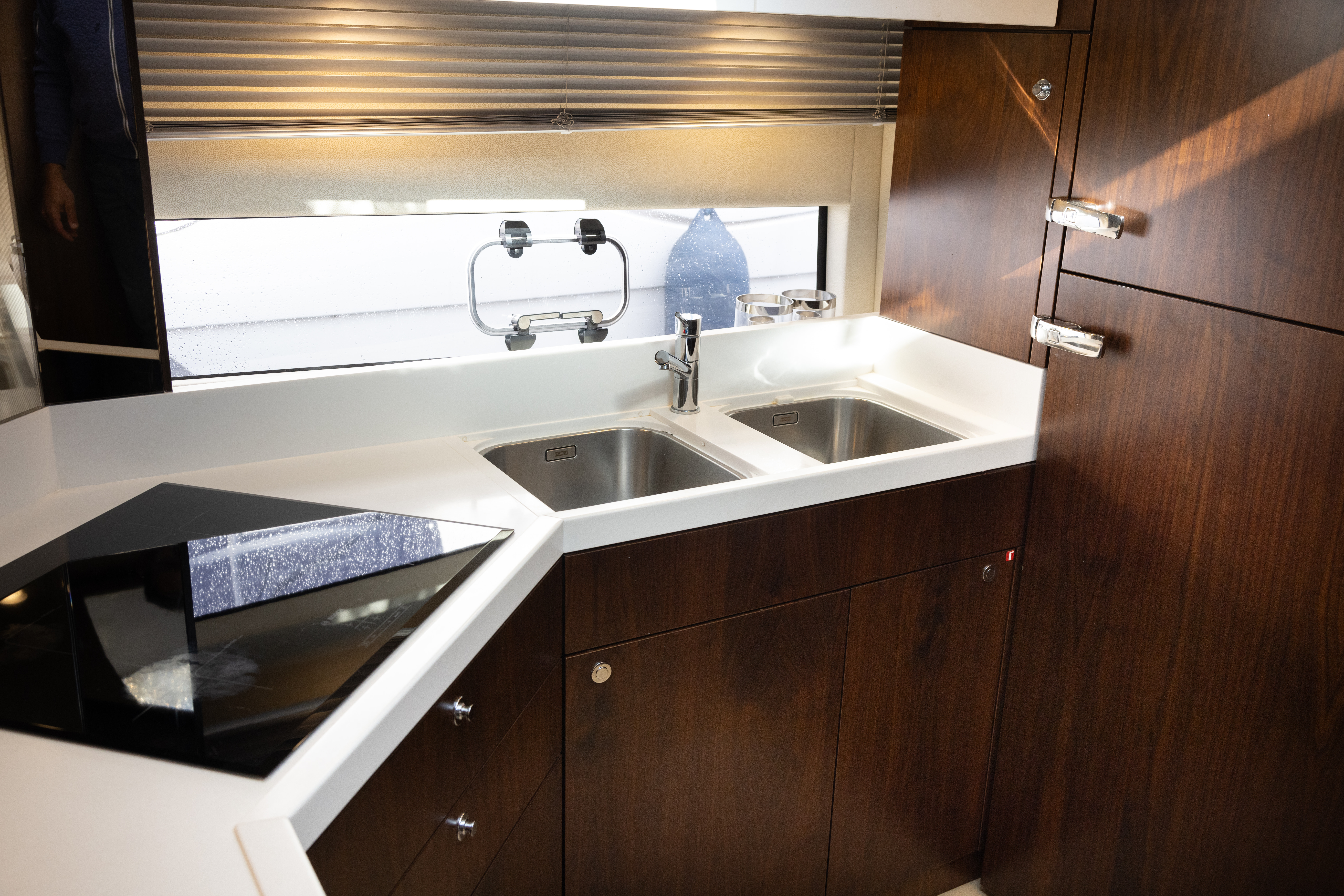 Wet bar in cockpit with sink and 2 fridges