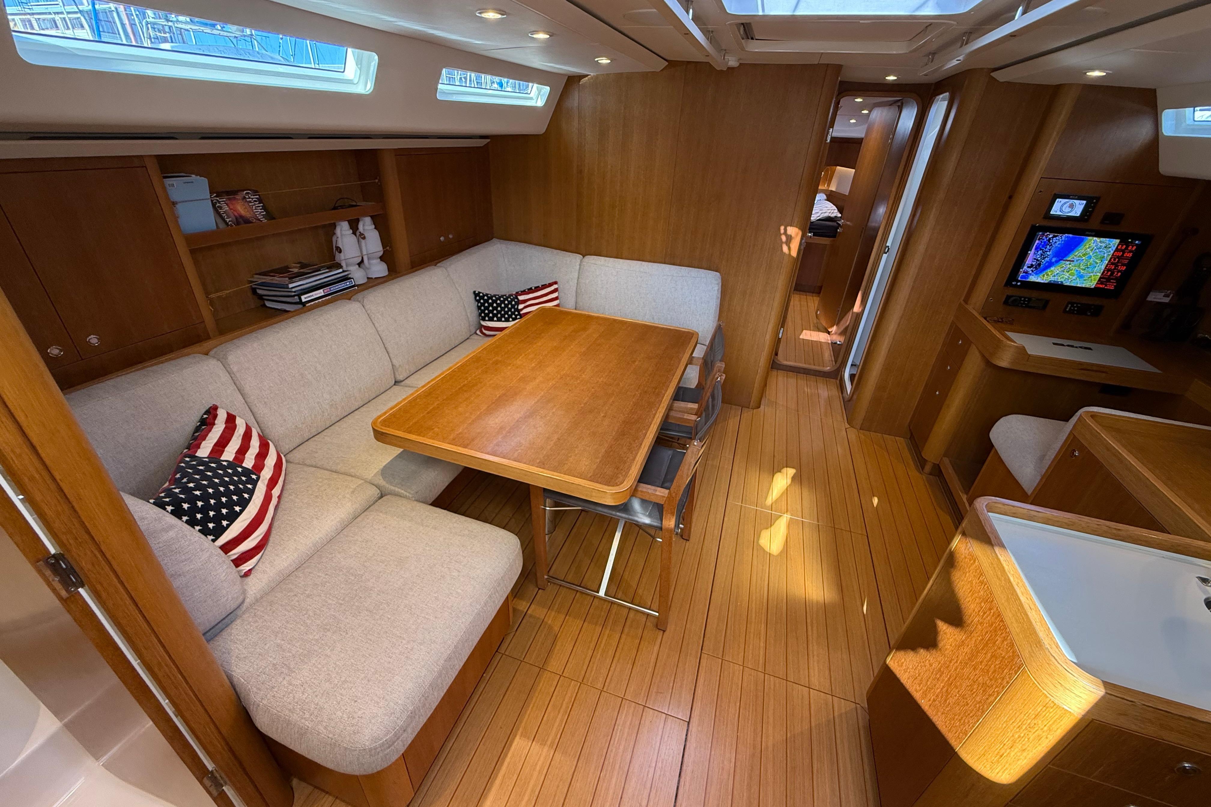 Layout and spaces inside: Large U-shaped settee on portside with navigation station and
