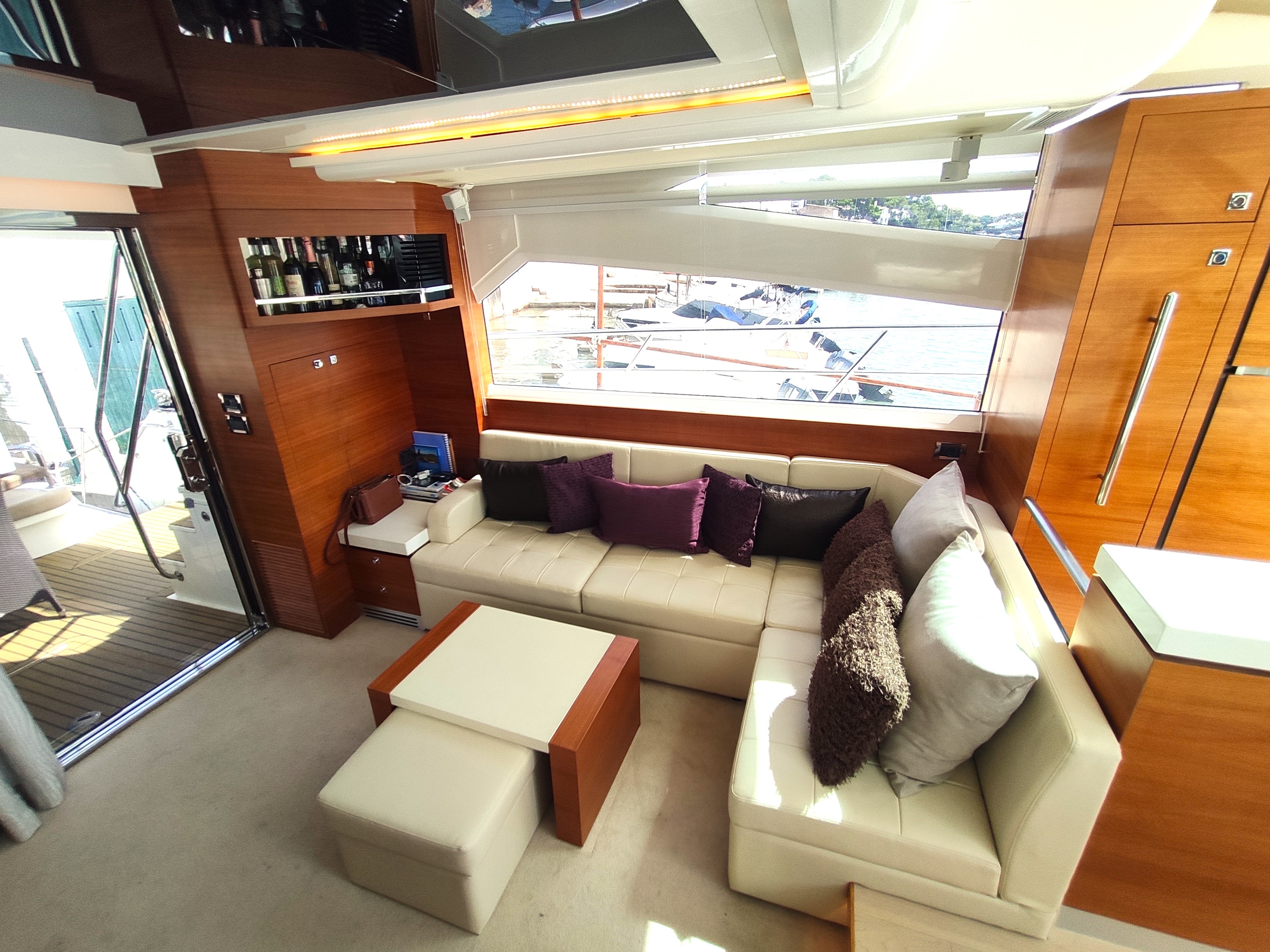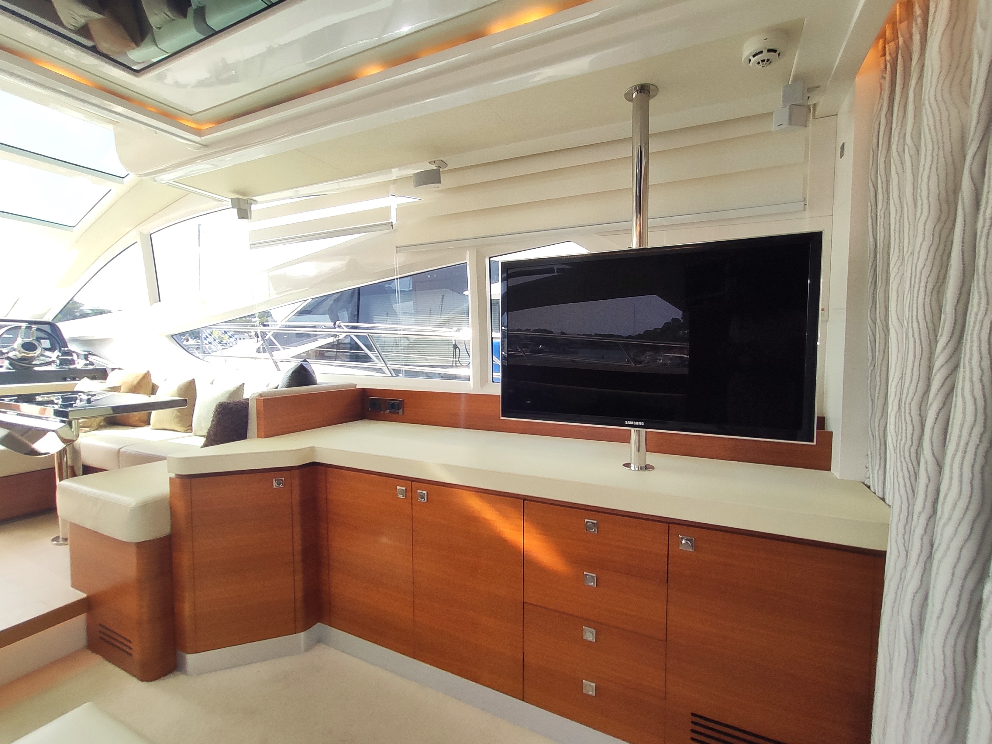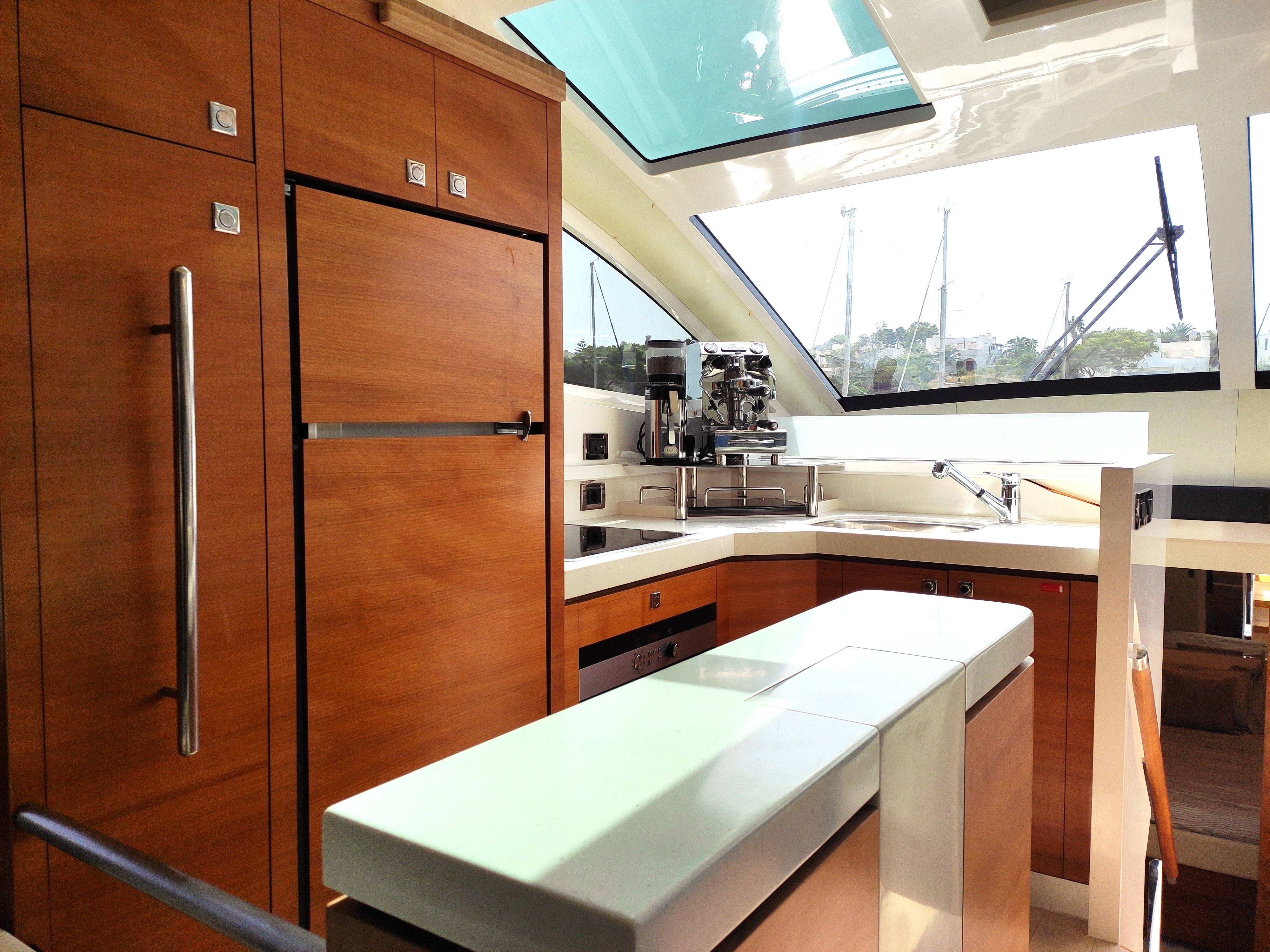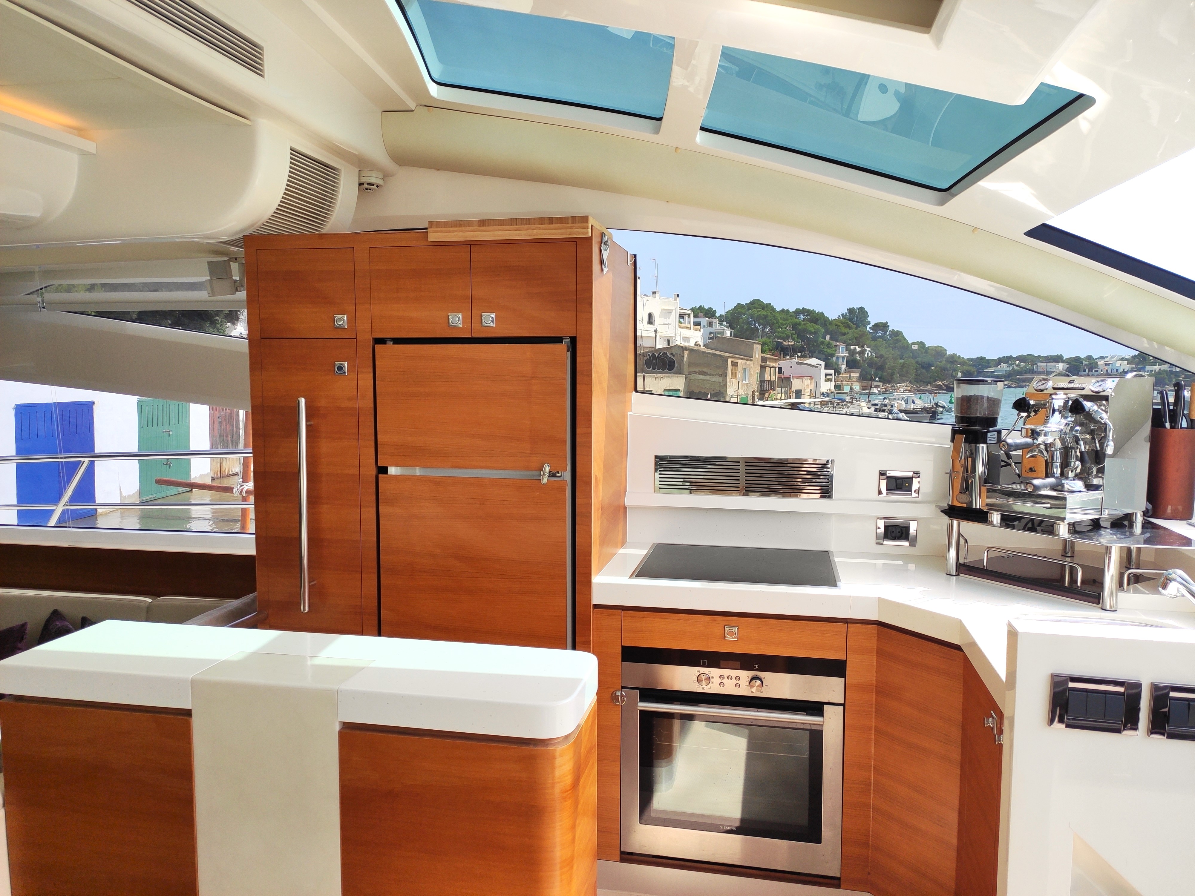 The sofa area is located aft, on portside with a big TV and storage to starboard. The fully equipped galley is located further forward to portside and the helm station just across to starboard.