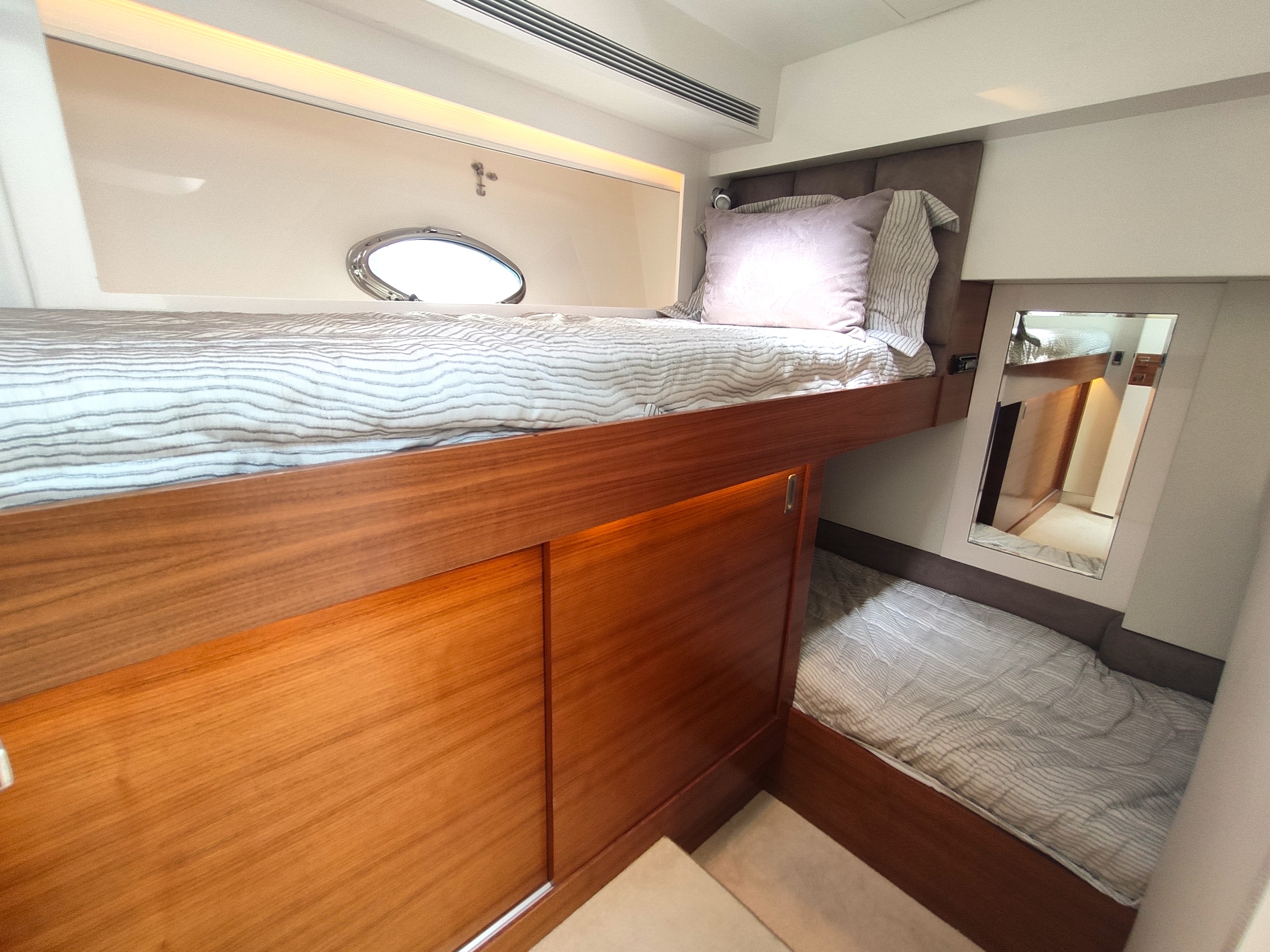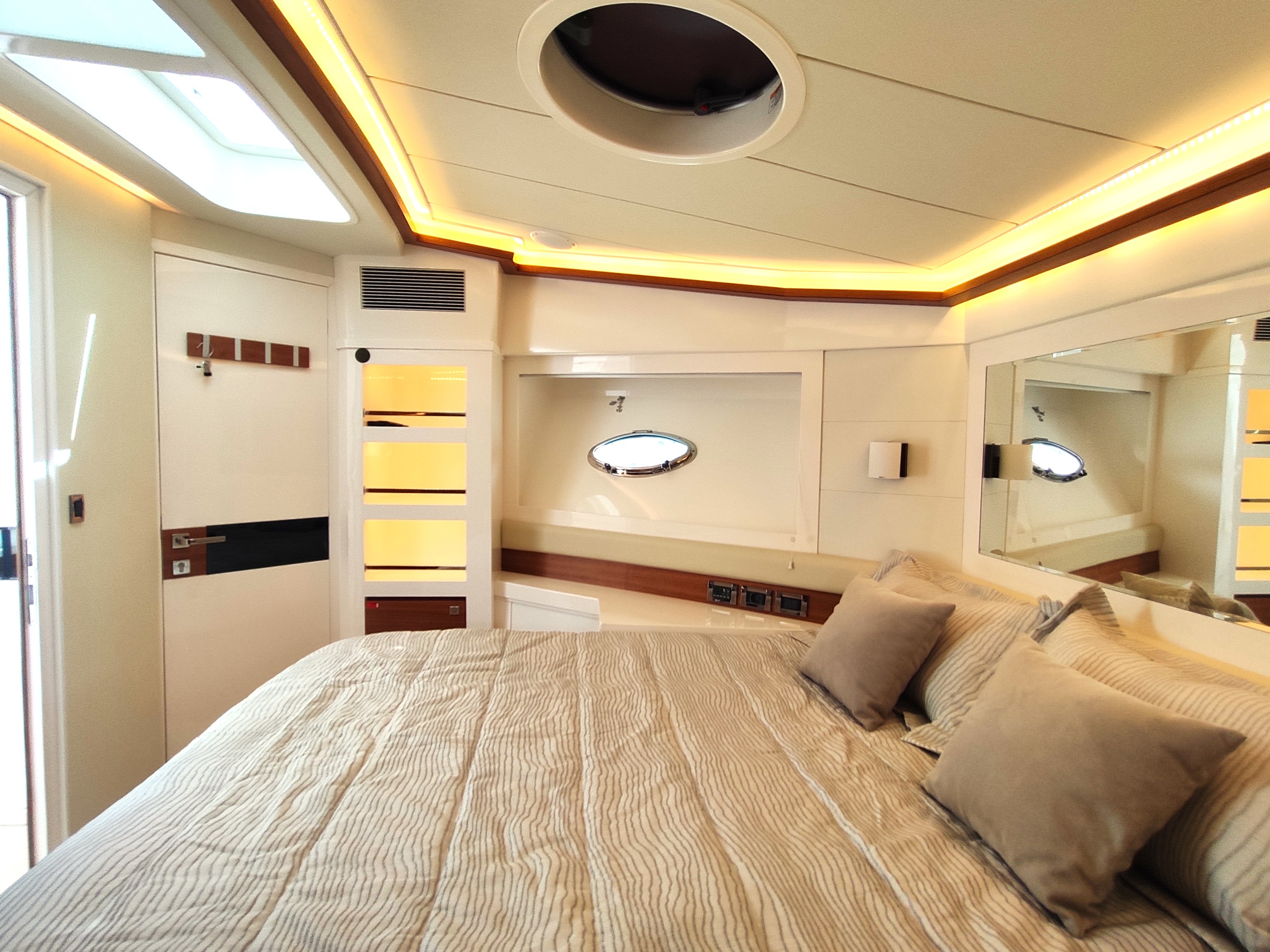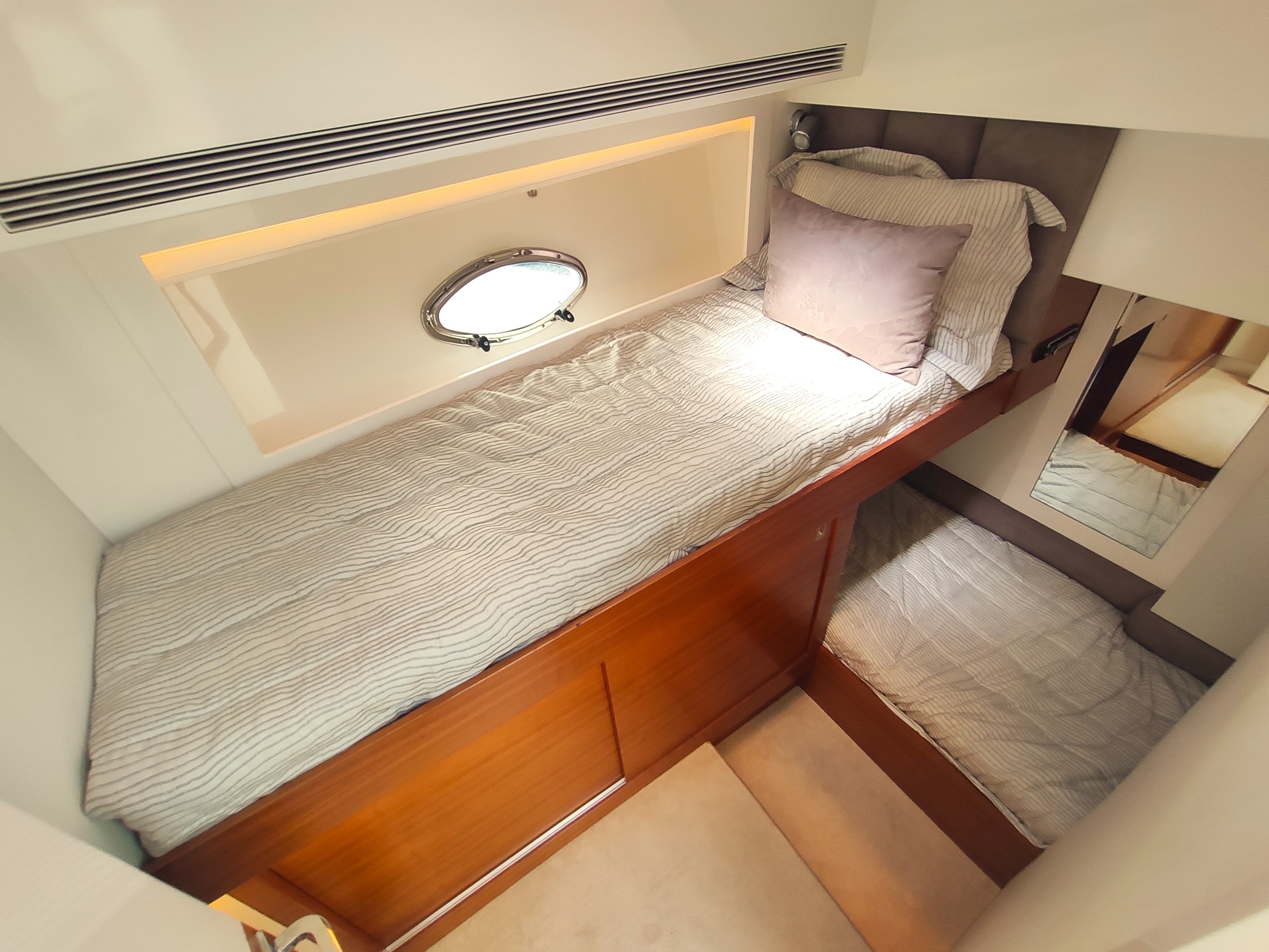 A guest stateroom with twin bunks is forward and to starboard, with a shared head to port and the highly spacious VIP cabin completely forward. The full beam master cabin is located midships with an ensuite heads with a separate shower, sink and toilet.