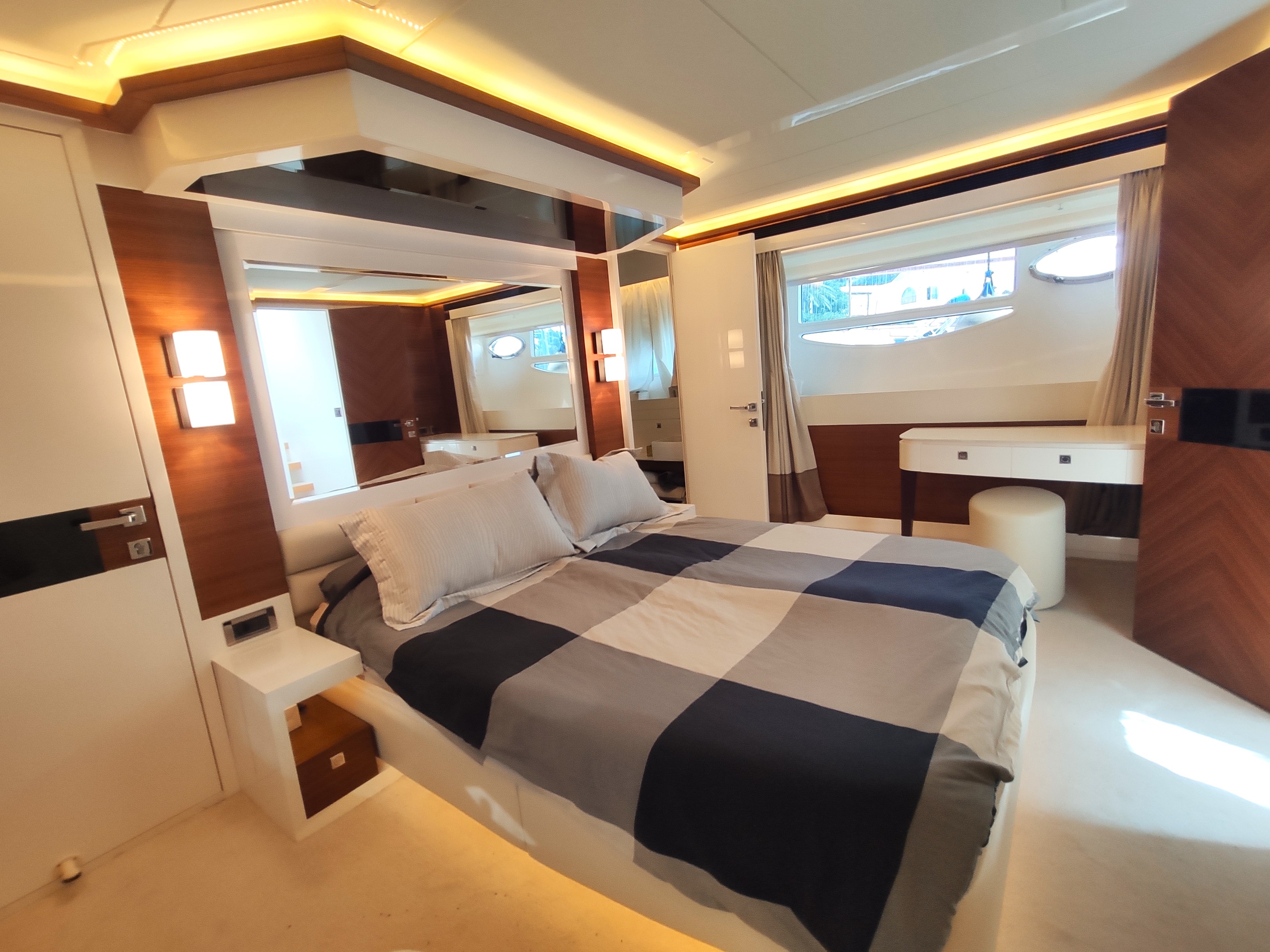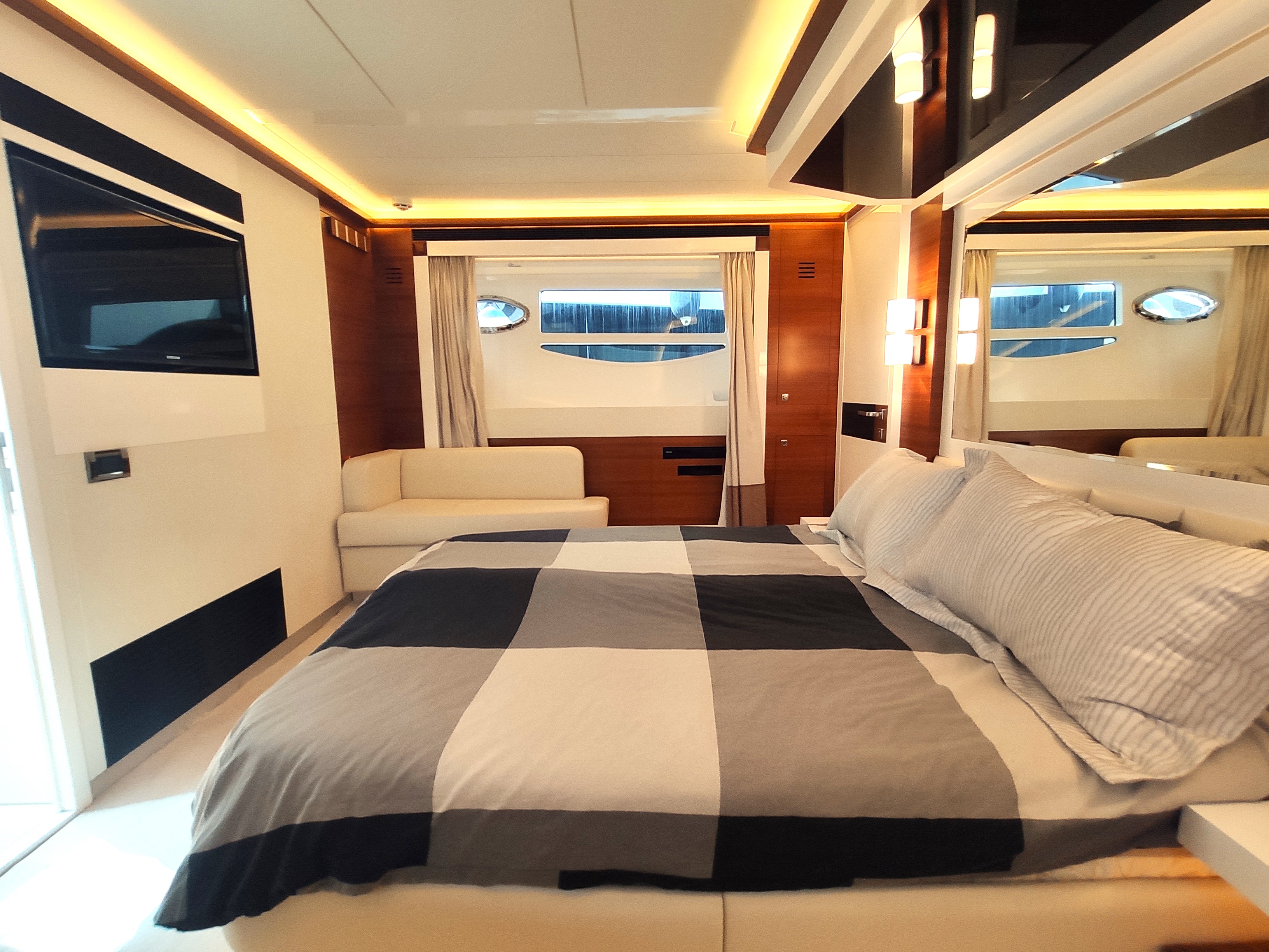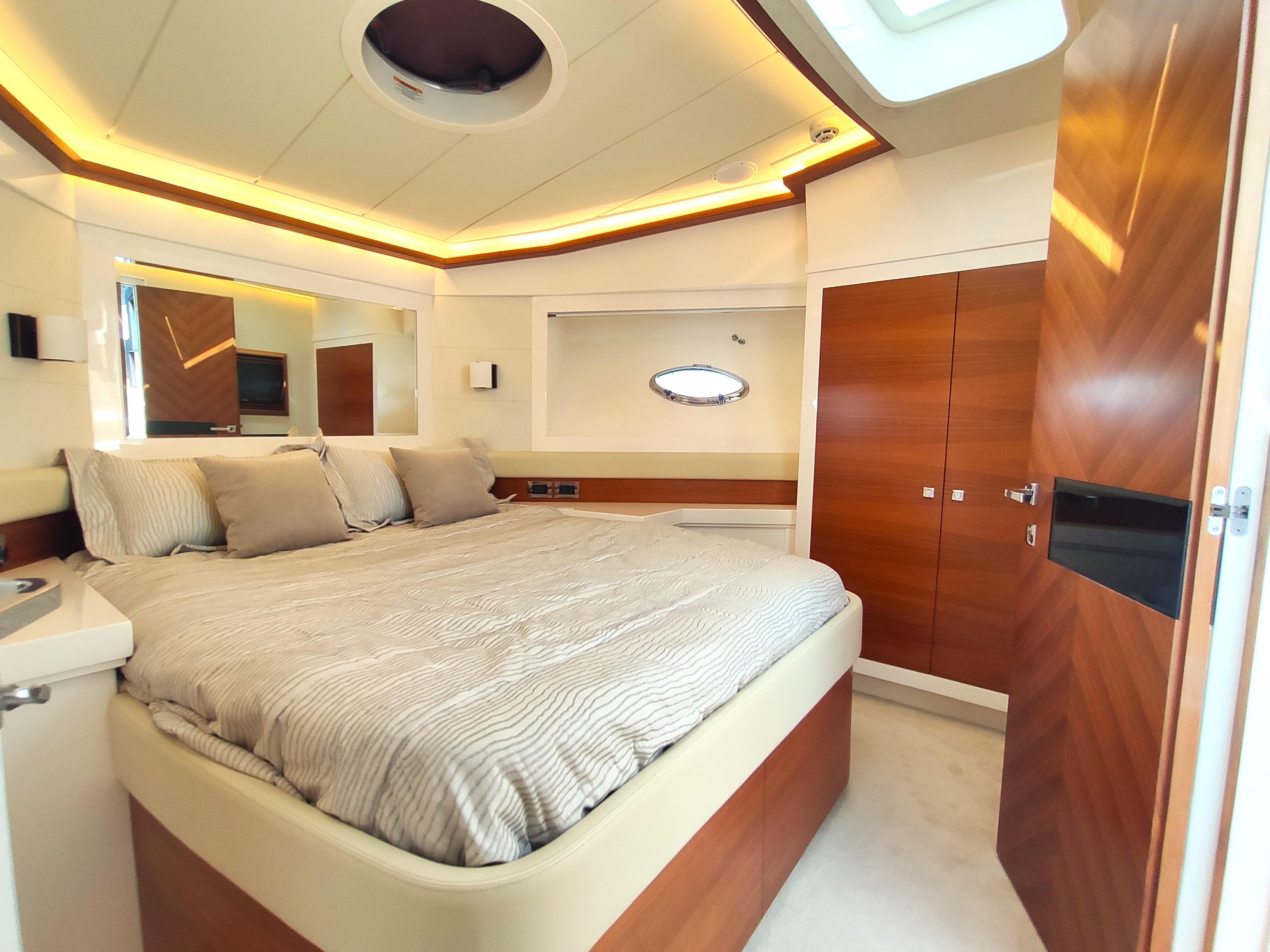A guest stateroom with twin bunks is forward and to starboard, with a shared head to port and the highly spacious VIP cabin completely forward. The full beam master cabin is located midships with an ensuite heads with a separate shower, sink and toilet.