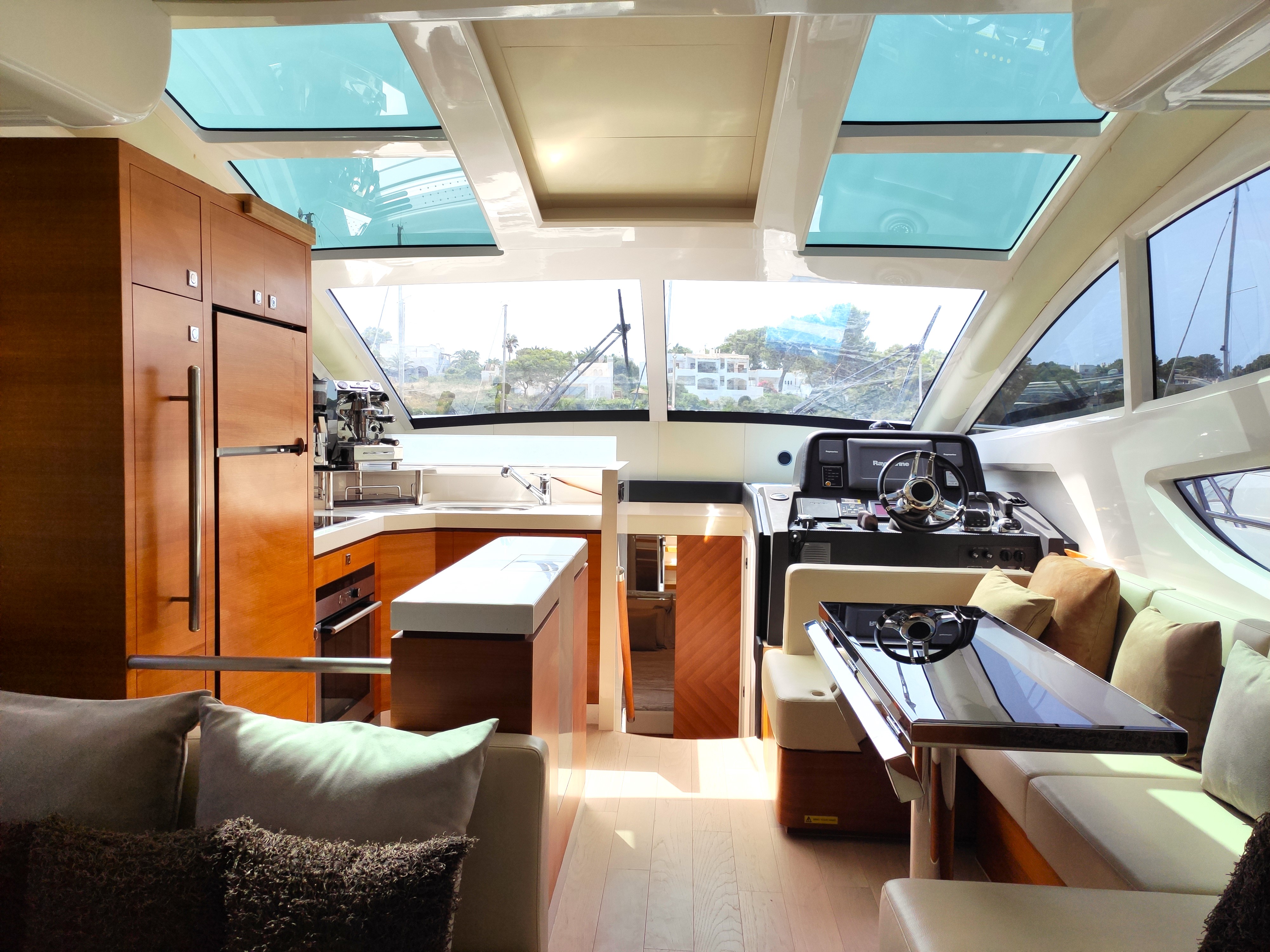A saloon with big windows, skylight and a big windscreen accentuate the natural light in the interior of the Horizon E54.