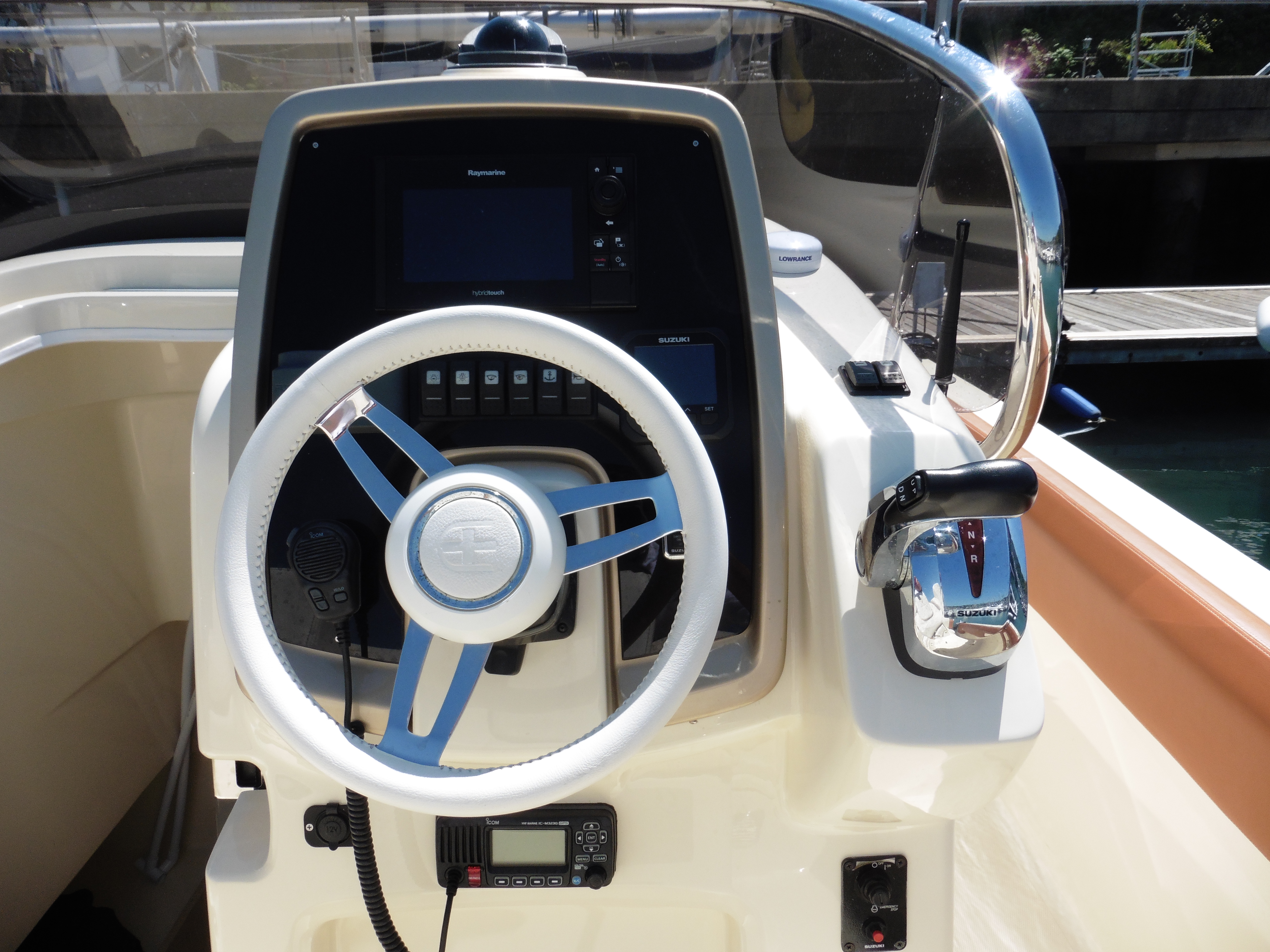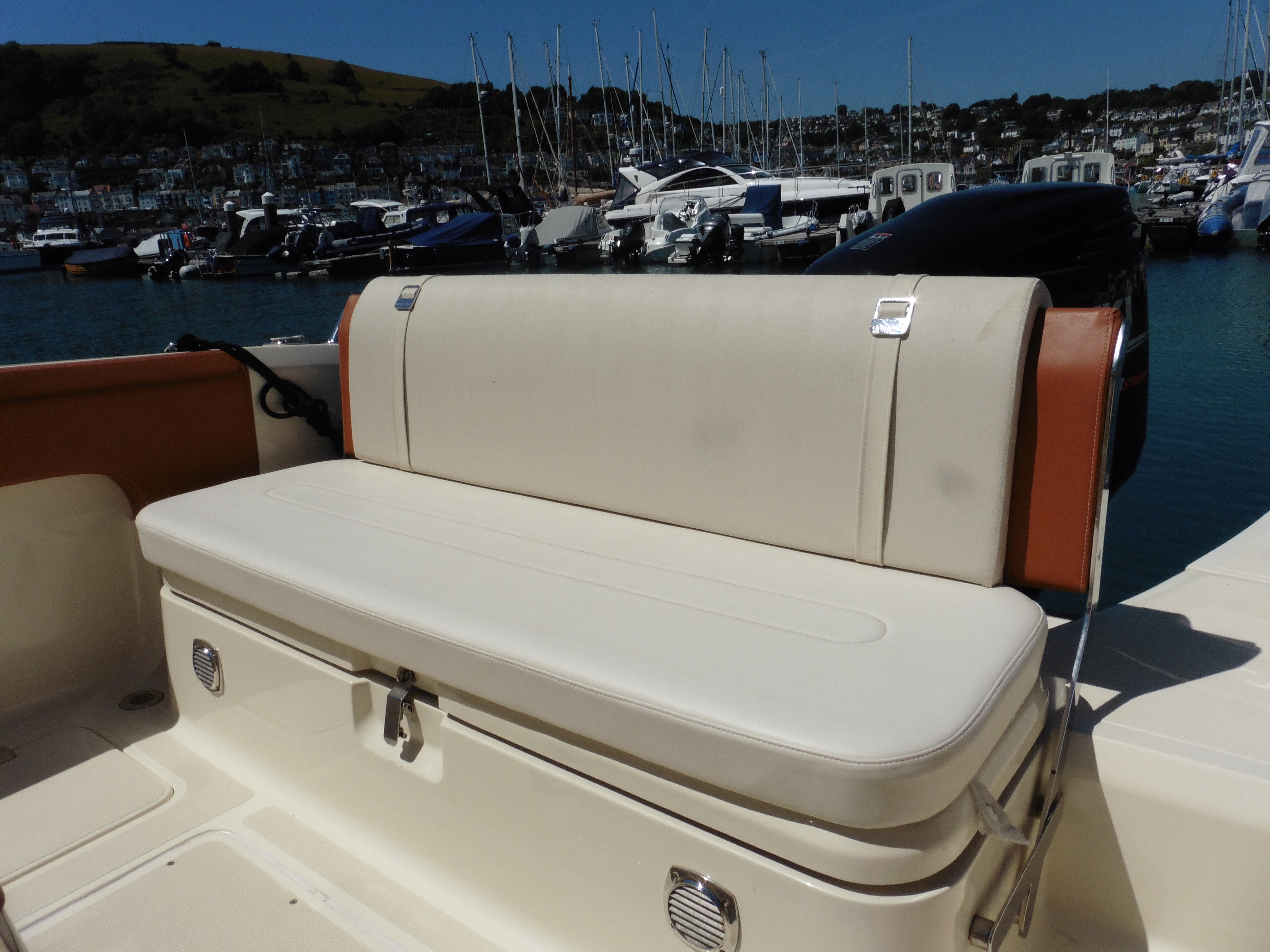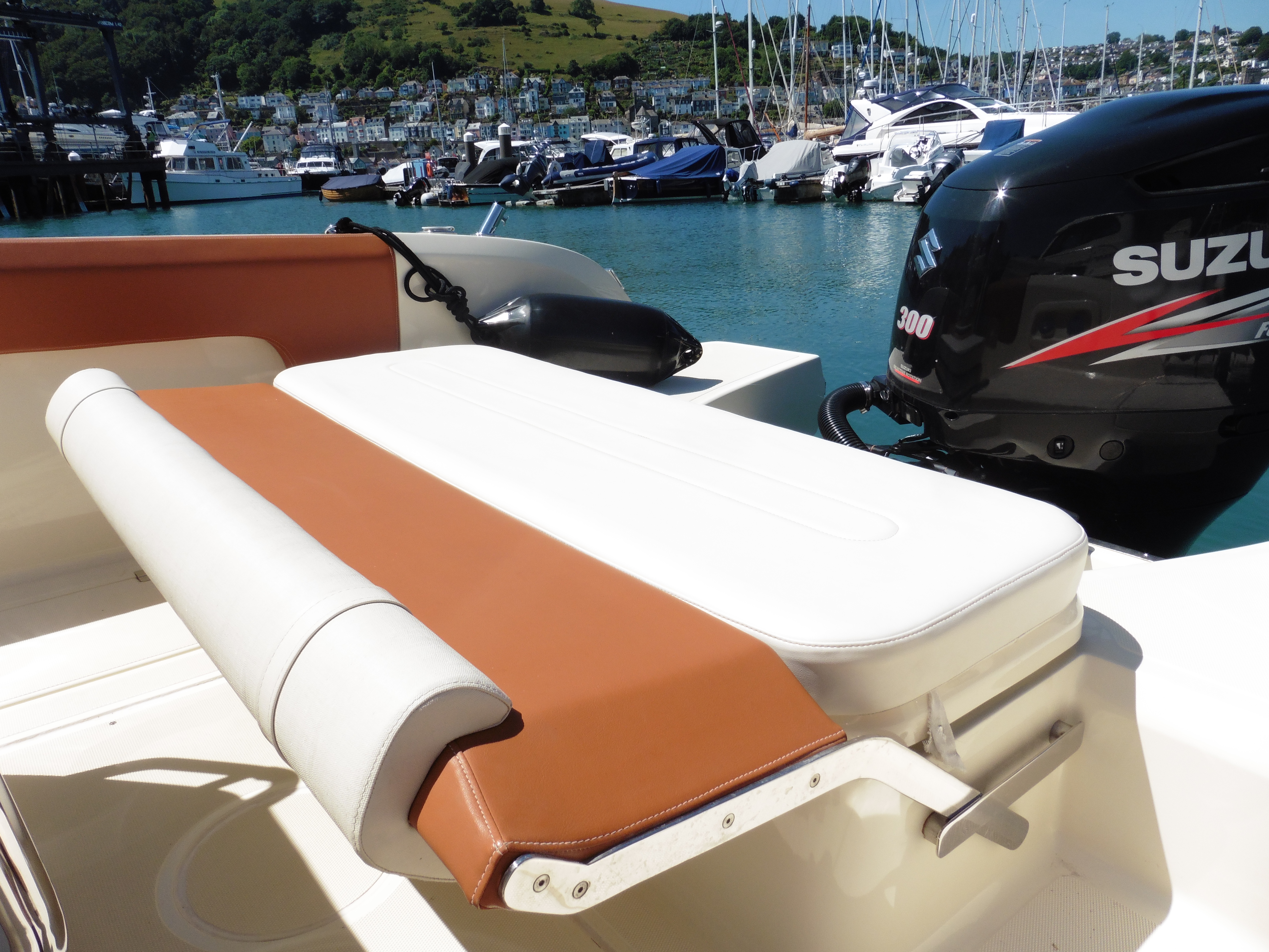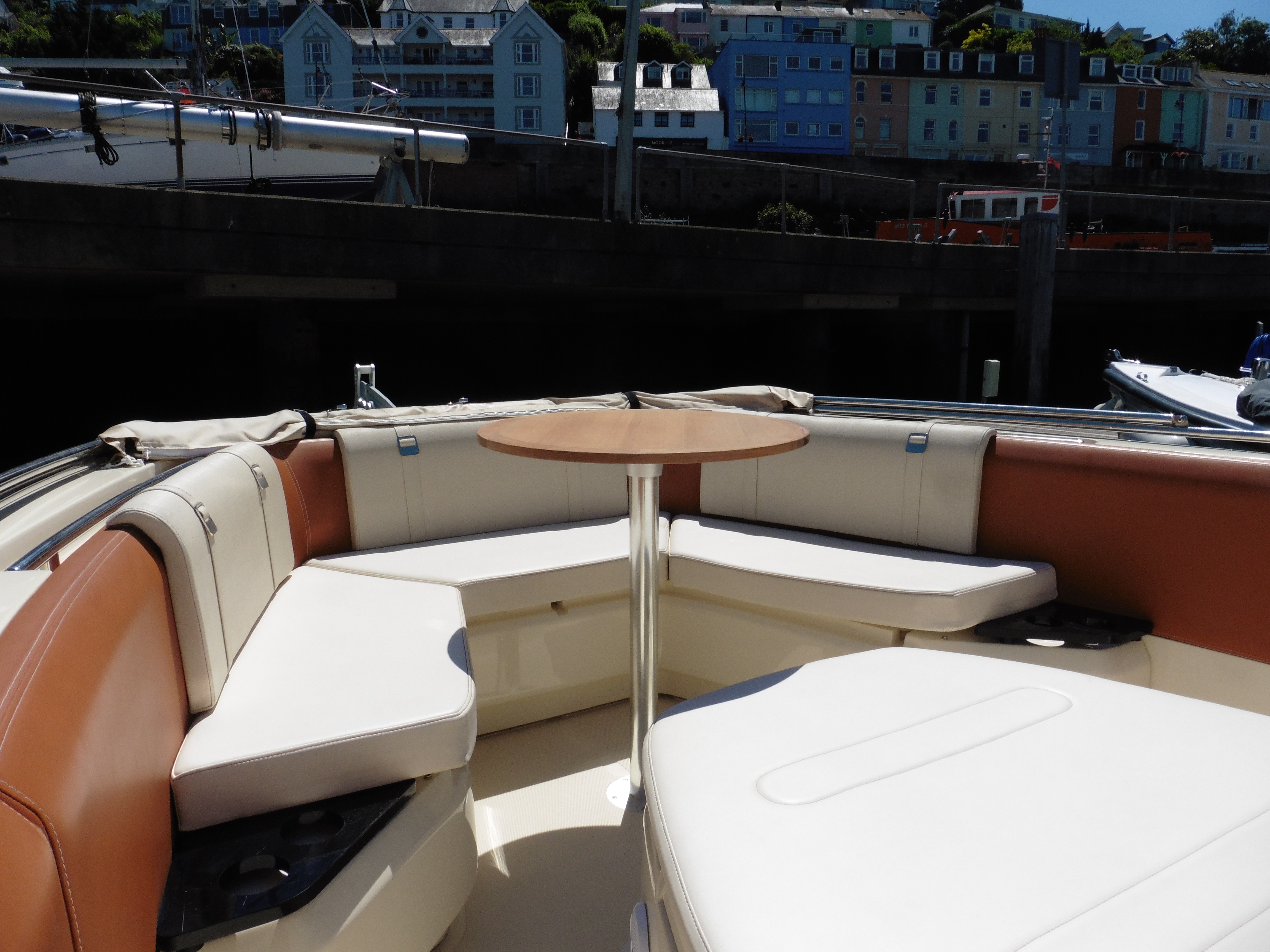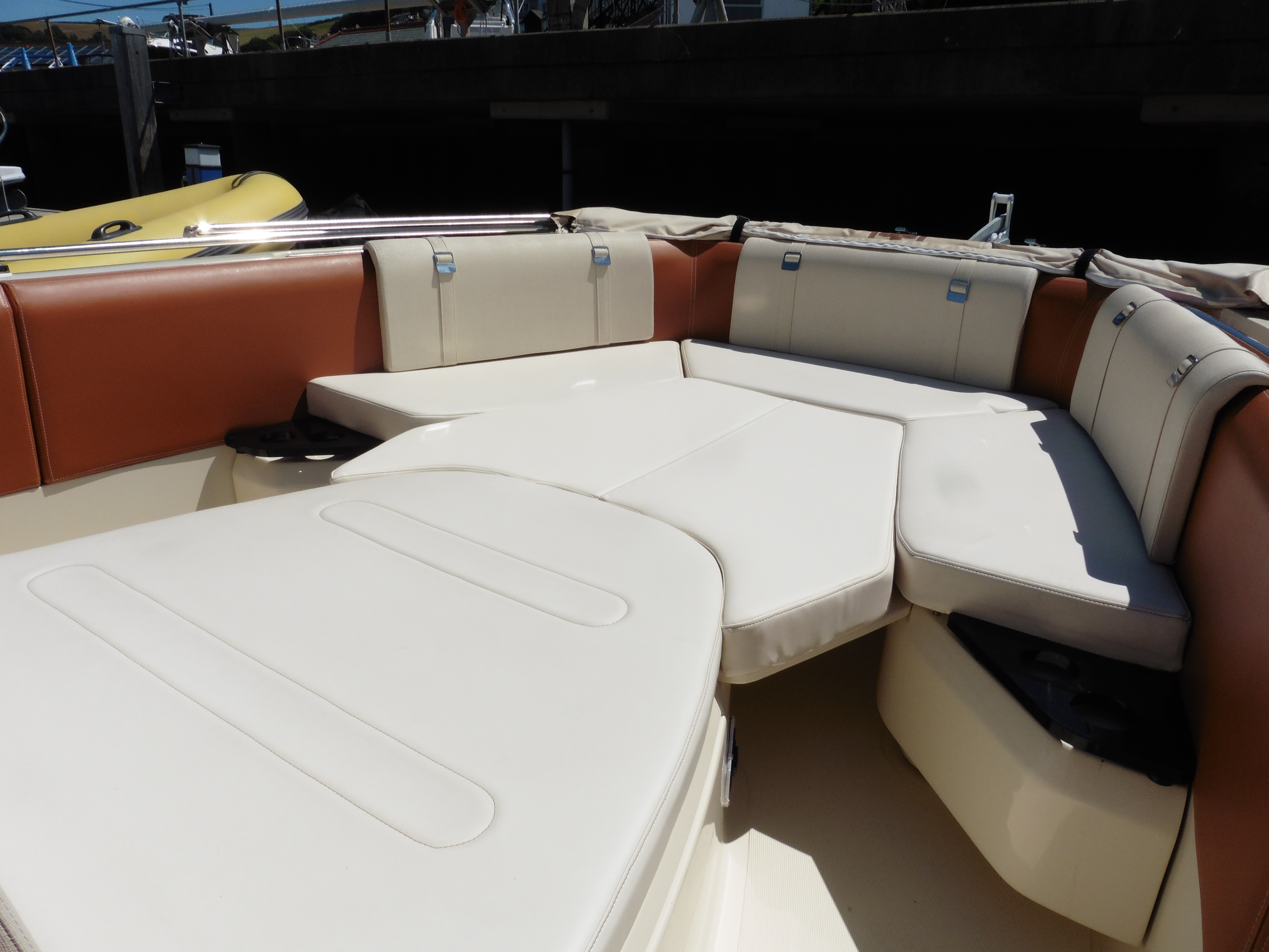 This is a charismatic open style sports boat designed and built in Italy. High sides and a well protected central console allow the entire boat to be accessed safely with seating both at the driving position and fore and aft. All the upholstery is finished in tan and cream with bolsters all around the interior protecting the hull and the passengers. If you want to arrive at your destination in style this is a boat for you.