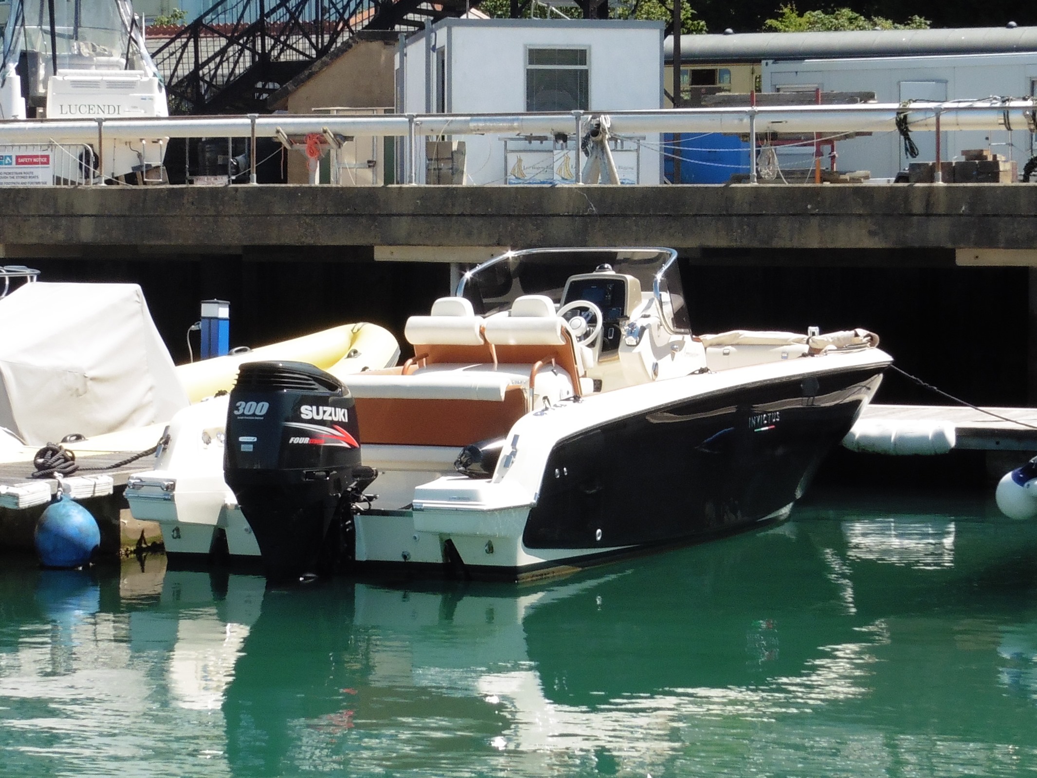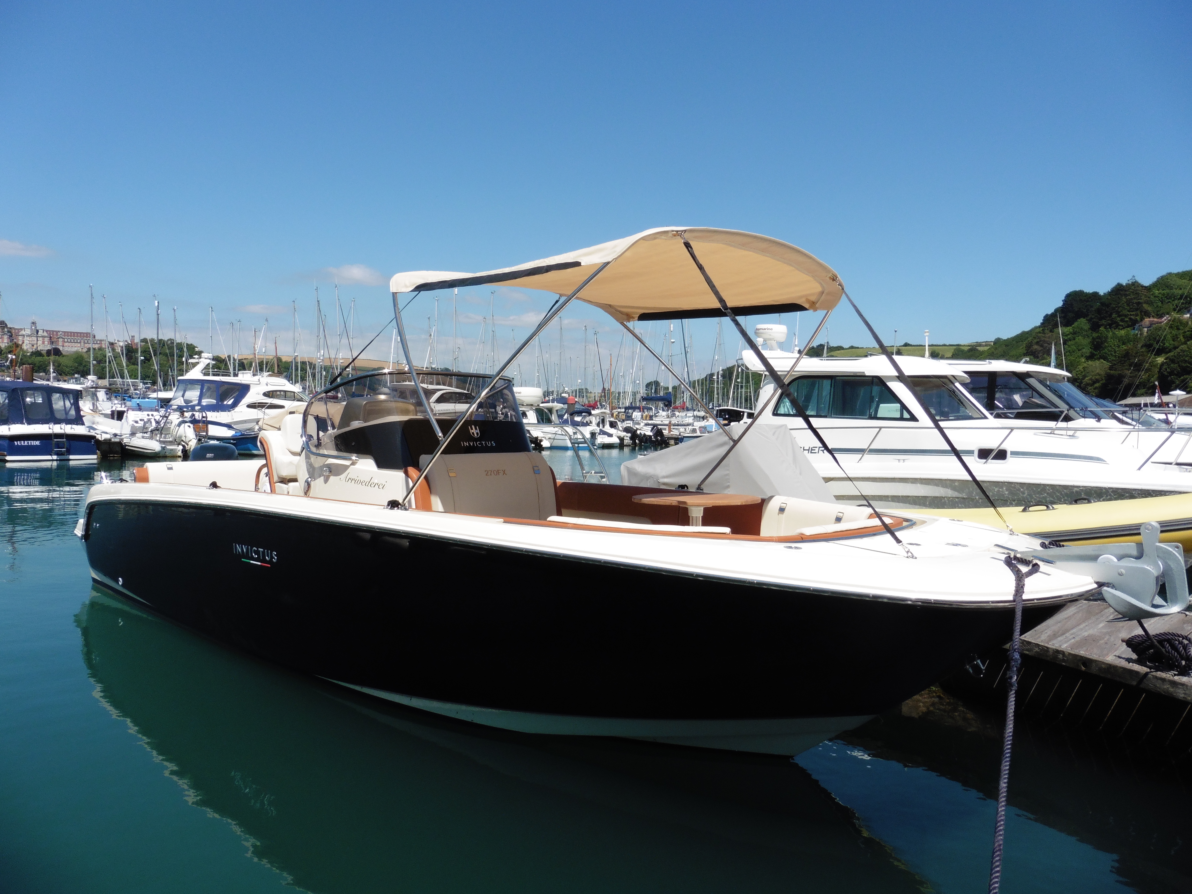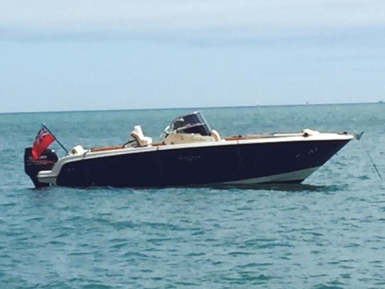 The Invictus 270FX is a scintillating example of Italian craftsmanship. With a large well protected walk around deck, there is seating fore and aft with the ability to convert both into sunbathing areas. A bimini and teak table enhance the forward section whilst a sink and coolbox storage are behind the driving seats. The main console includes the driving position and a sliding door to access the small cuddy cabin fitted with an electric flush toilet. Powered by a Suzuki 300HP outboard, this will propel you to your destination at speed if required but also cruise comfortably when taking a more leisurely approach. 'Arrivederci' is a stylish and plush sports dayboat perfect for exploring the UK coastline with it's many bays and beaches.