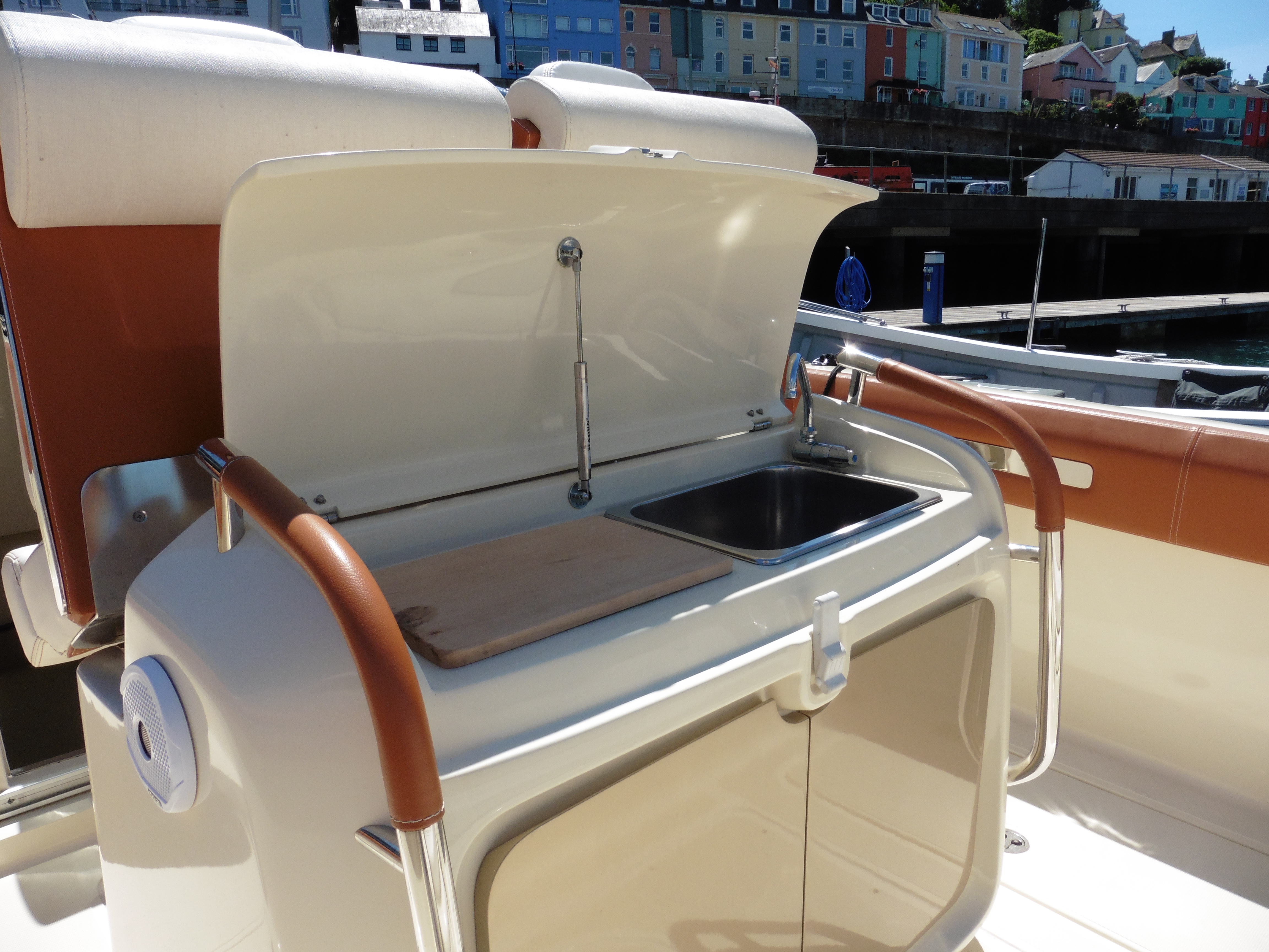 Sink and coolbox storage behind console seats