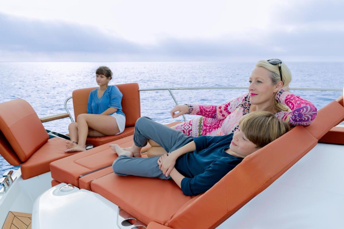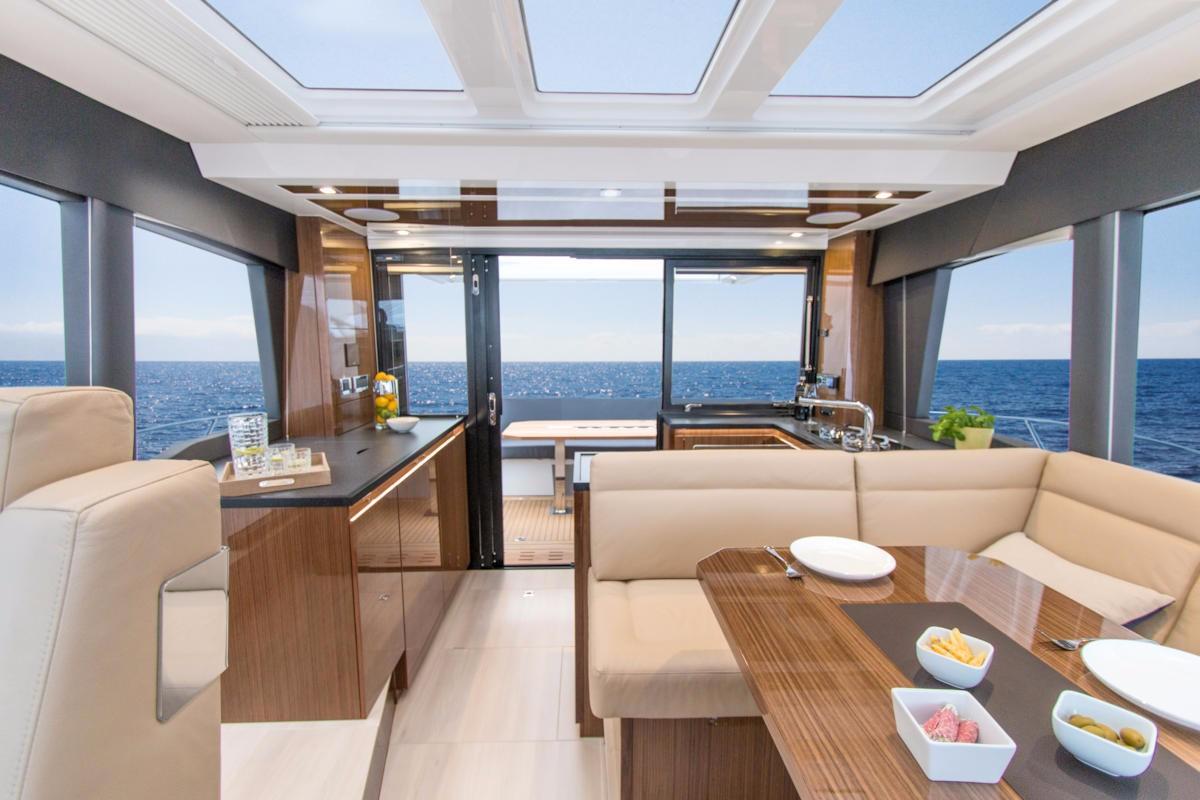 Open the electric sunroof and let even more light into the interior. With its three luxurious lounge areas, the Sealine C430 provides the perfect ambience for every moment. When the saloon is opened, both the inside and the outside become a real loft apartment at sea.