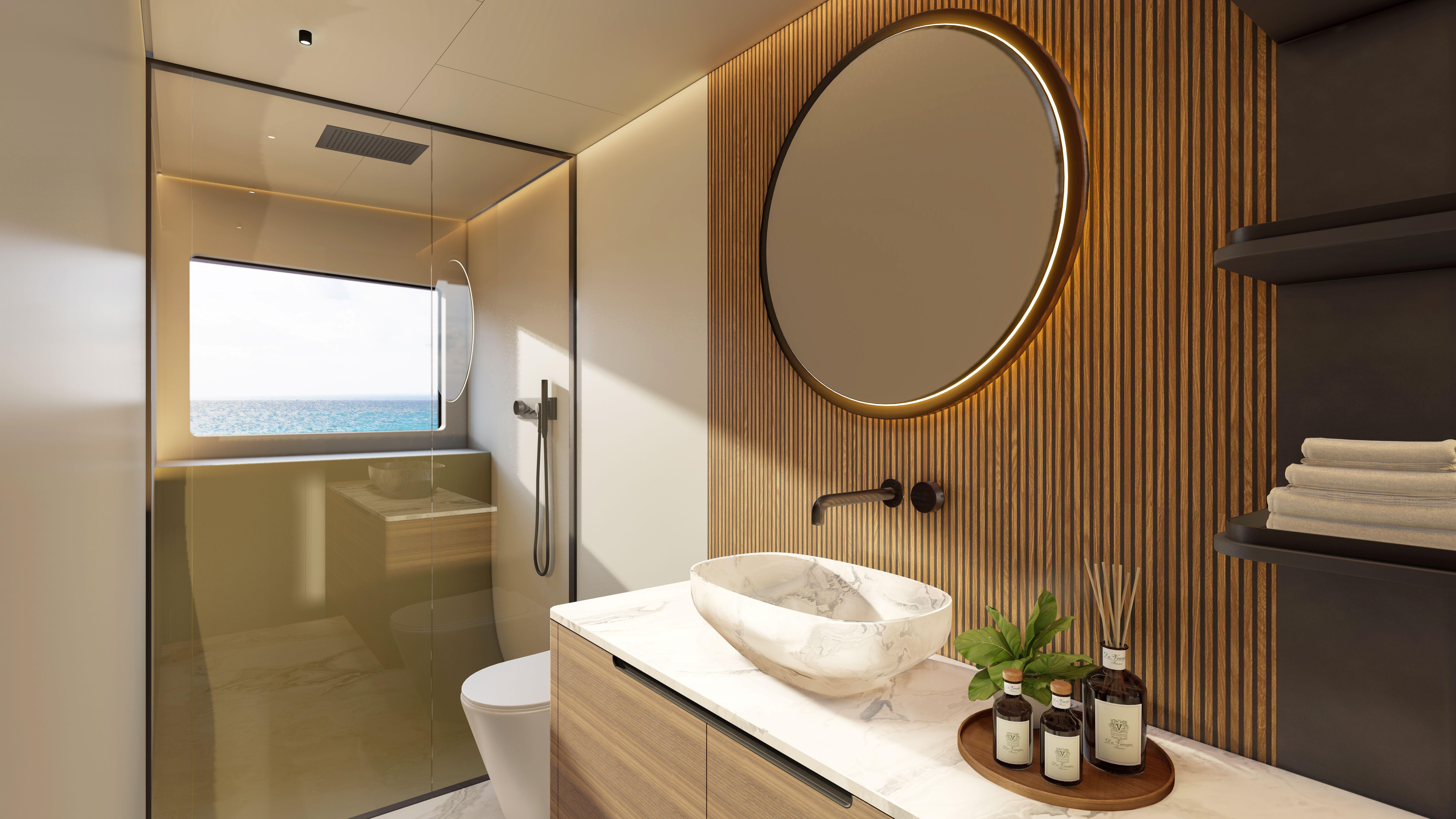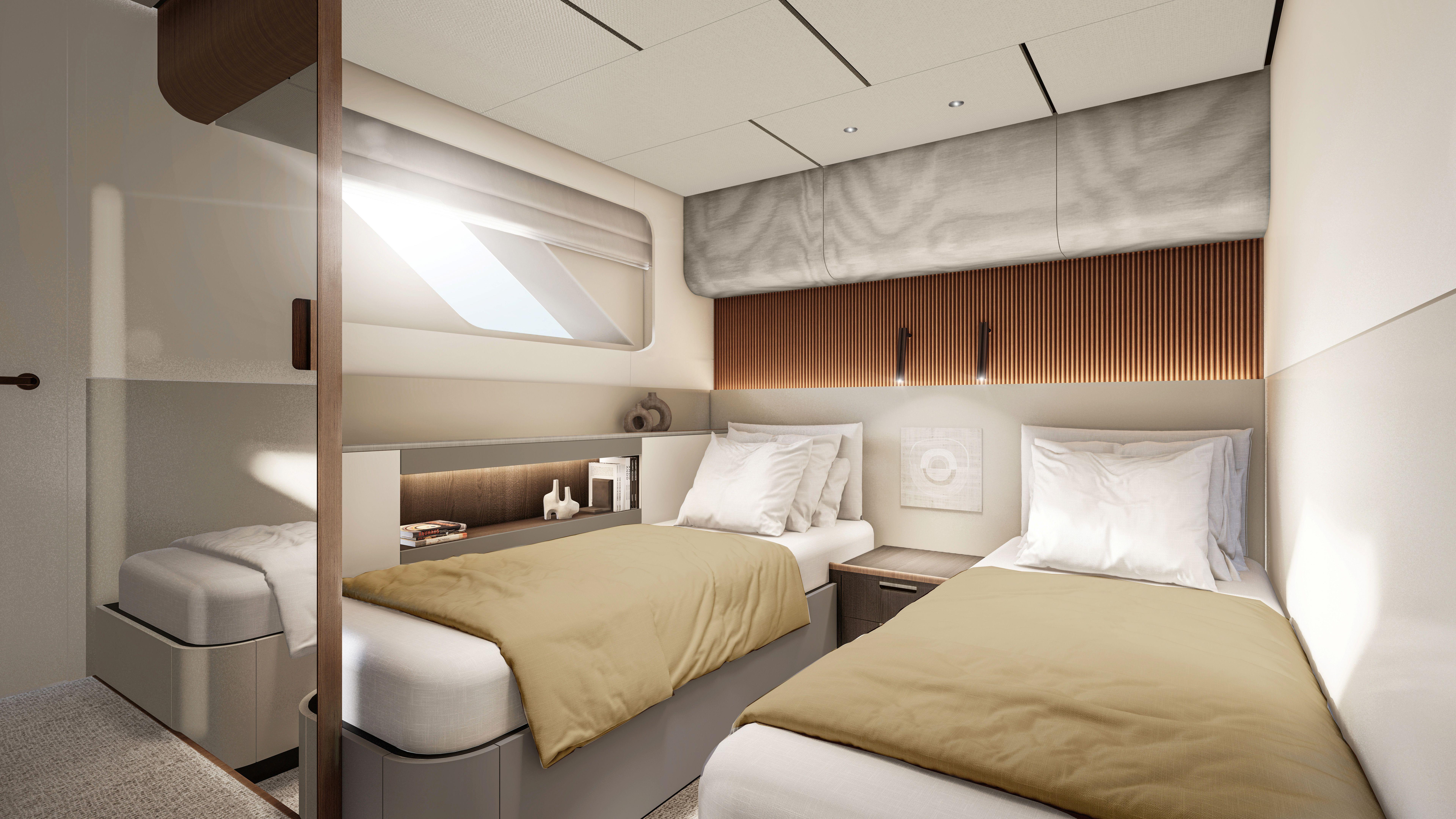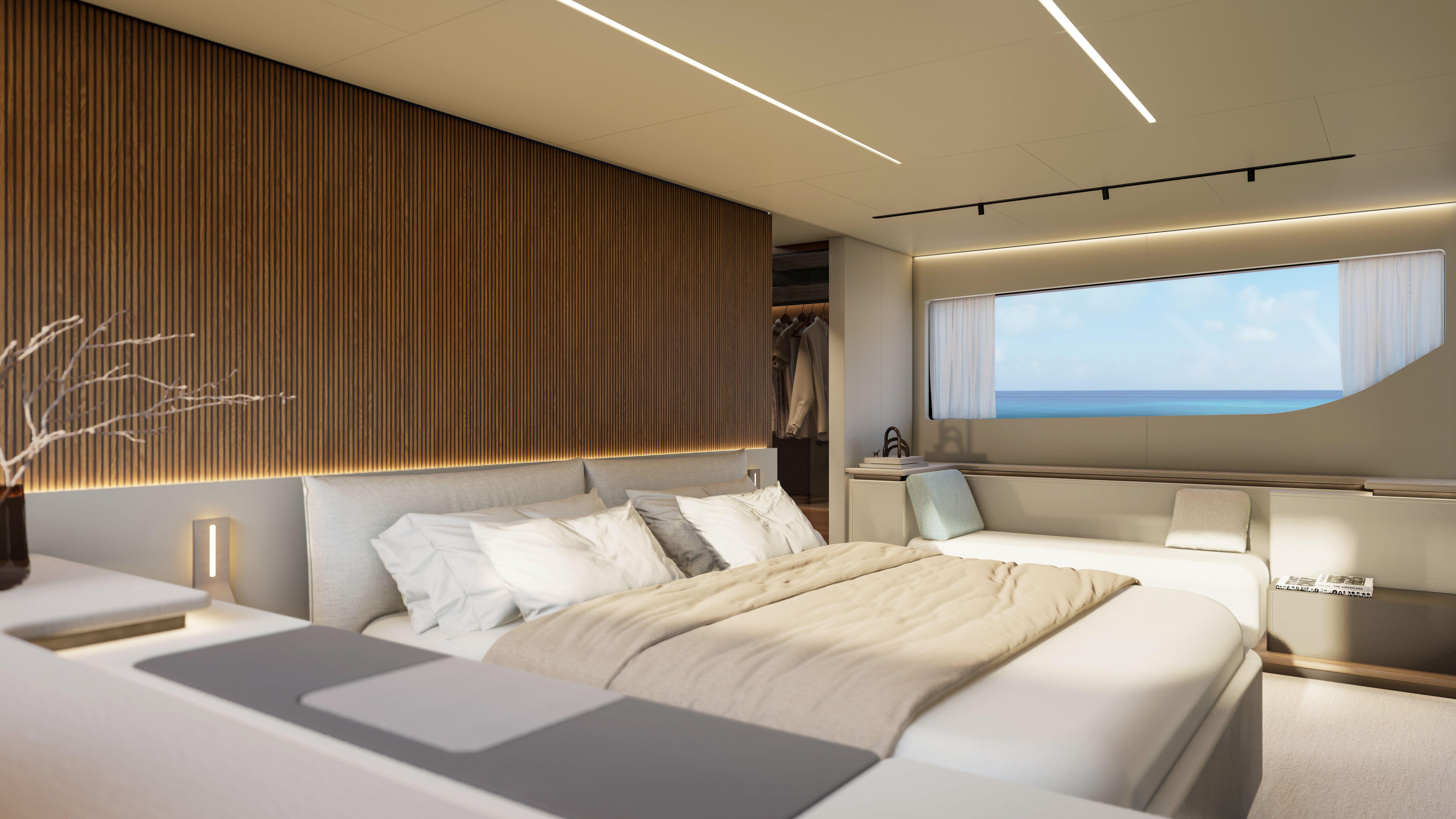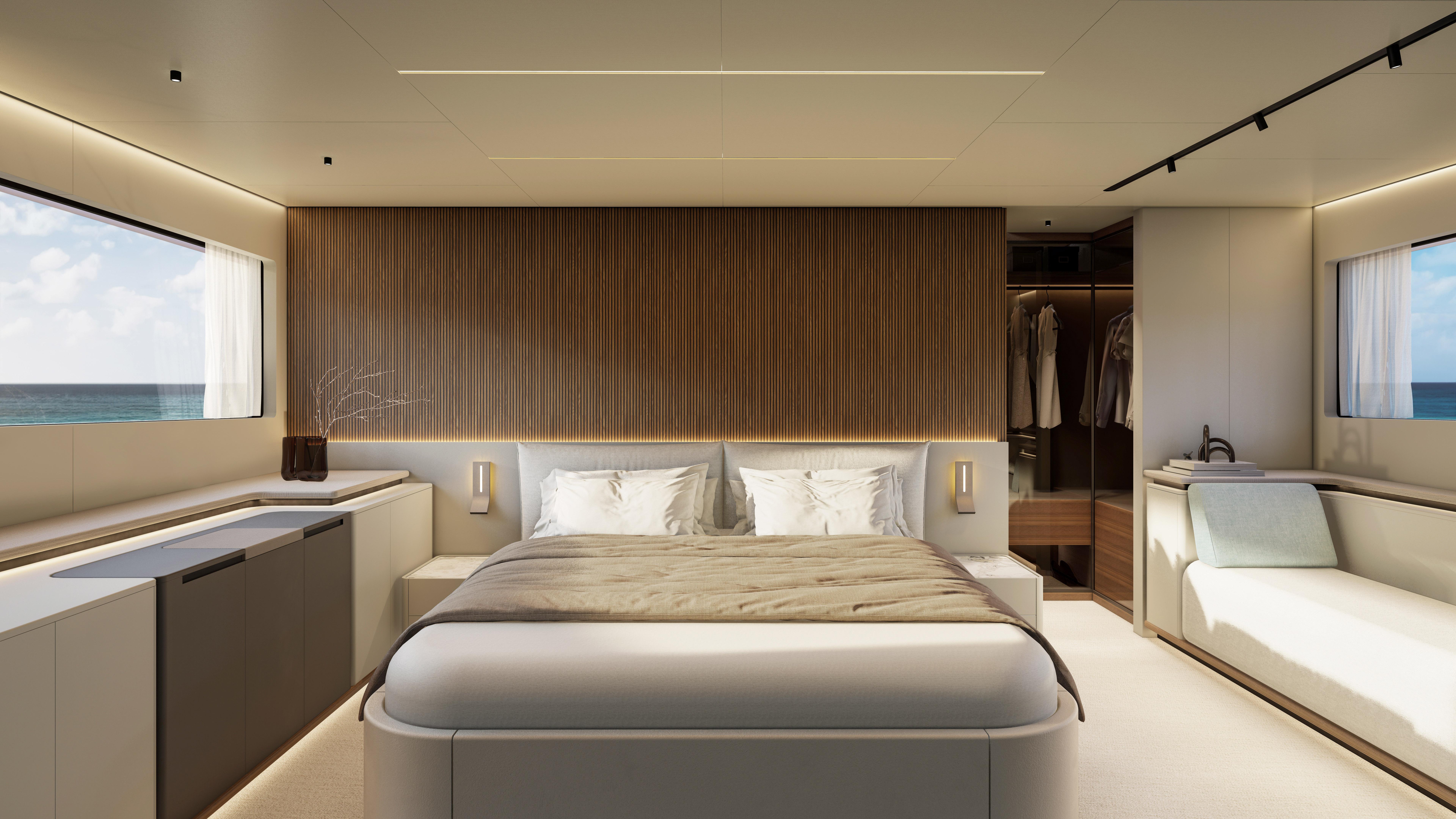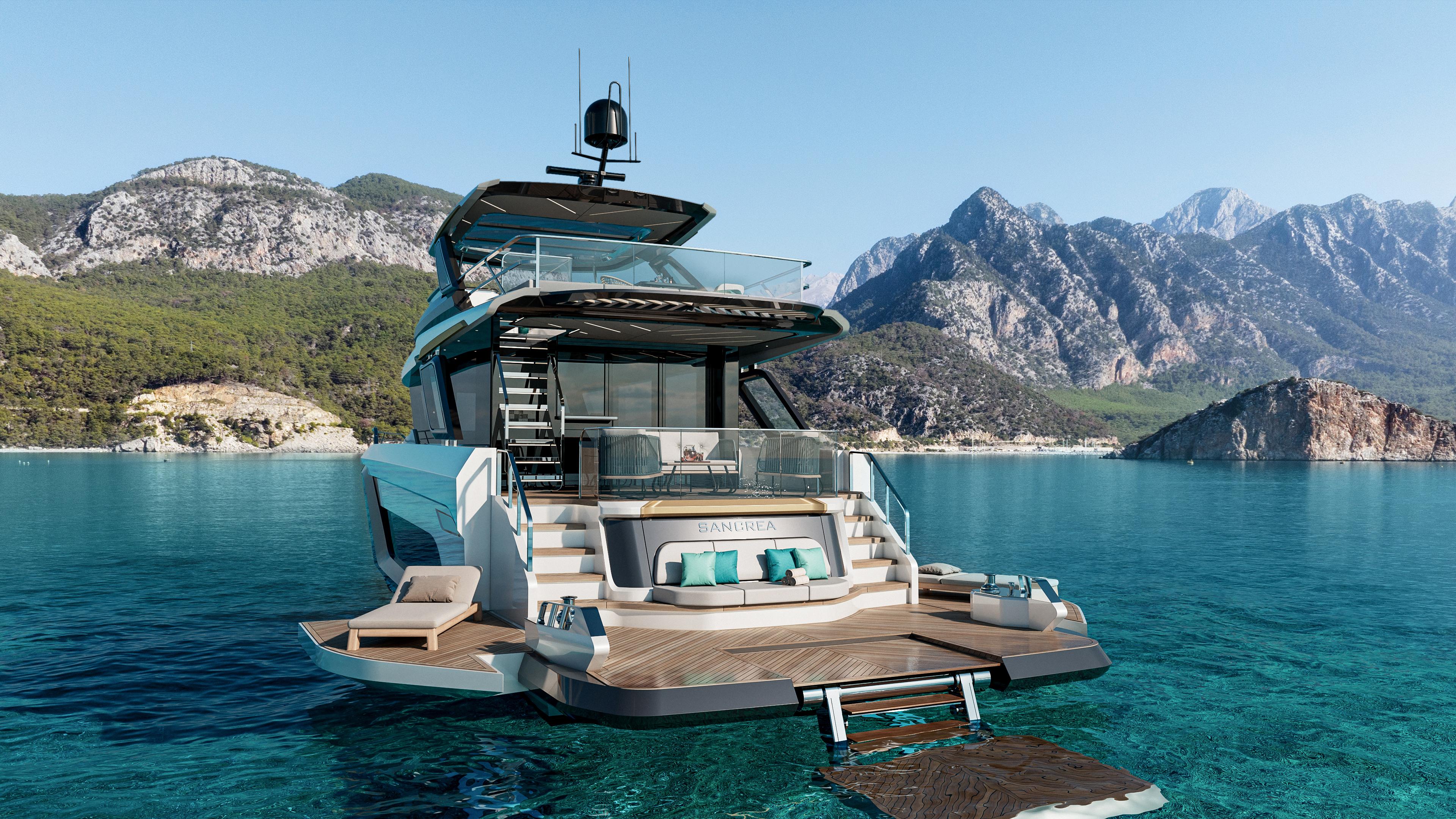 Sancrea 70 is a 21.8-meter aluminum explorer yacht designed for modern voyagers seeking comfort, elegance, and endurance at sea. Built by Sancrea Shipyard and set for delivery in 2026, she features naval architecture by Form Yacht Design, a striking exterior by Abbasli Design, and refined interiors by Bassan & Benedetti. Powered by twin MAN 560 hp engines, she offers a 1500 nm range at 9 knots, with cruising and top speeds of 10 and 14 knots respectively. The standard layout includes three spacious cabins and a utility room equipped with washer, dryer, full-height freezer, and extra storage. A four-cabin version is also available. At anchor, hydraulic platforms on the aft deck extend the beach club area, transforming the stern into a generous open-air lounge ideal for leisure and relaxation.