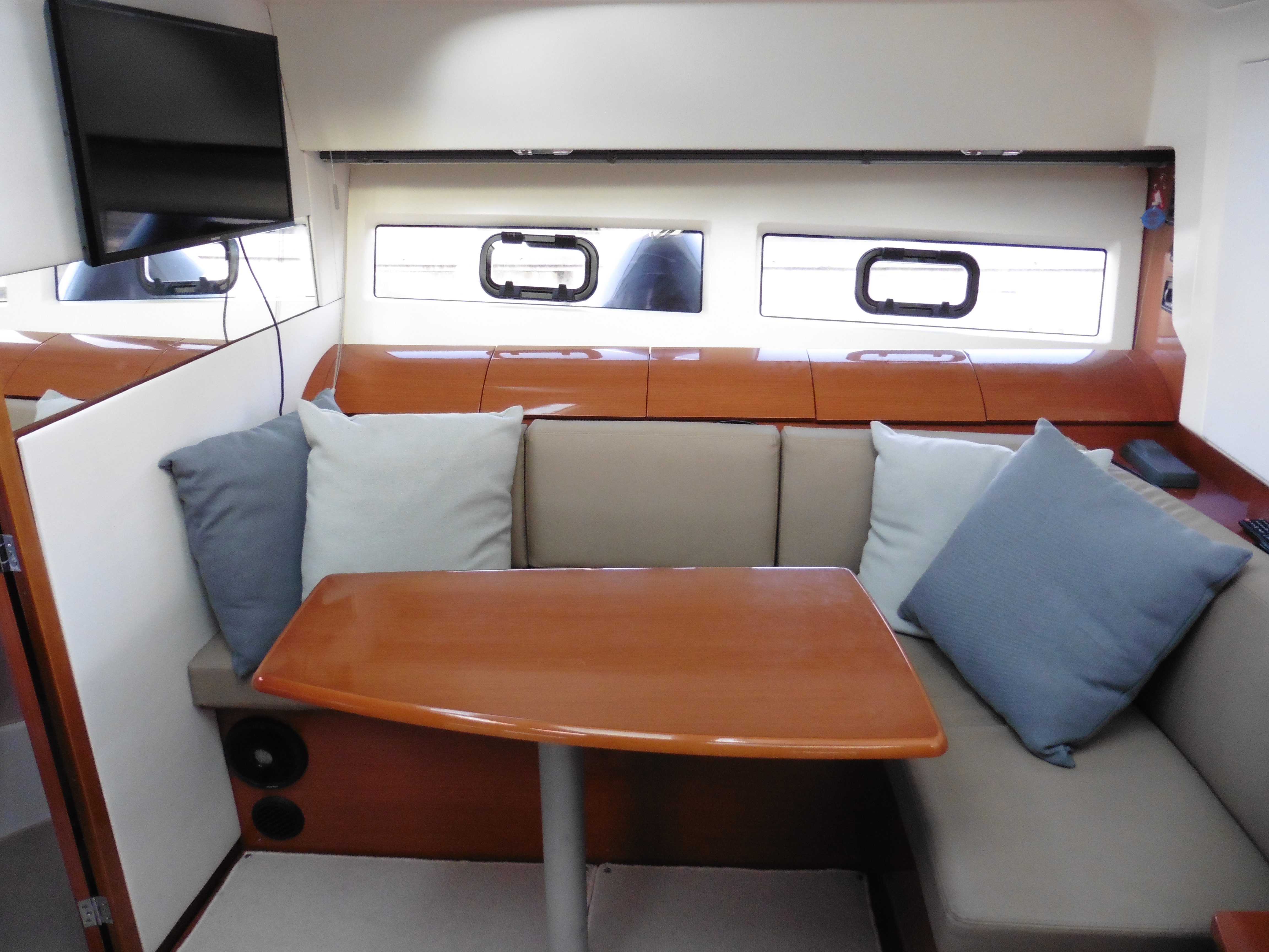 Saloon with convertible L-shaped settee, varnished table and under seat storage