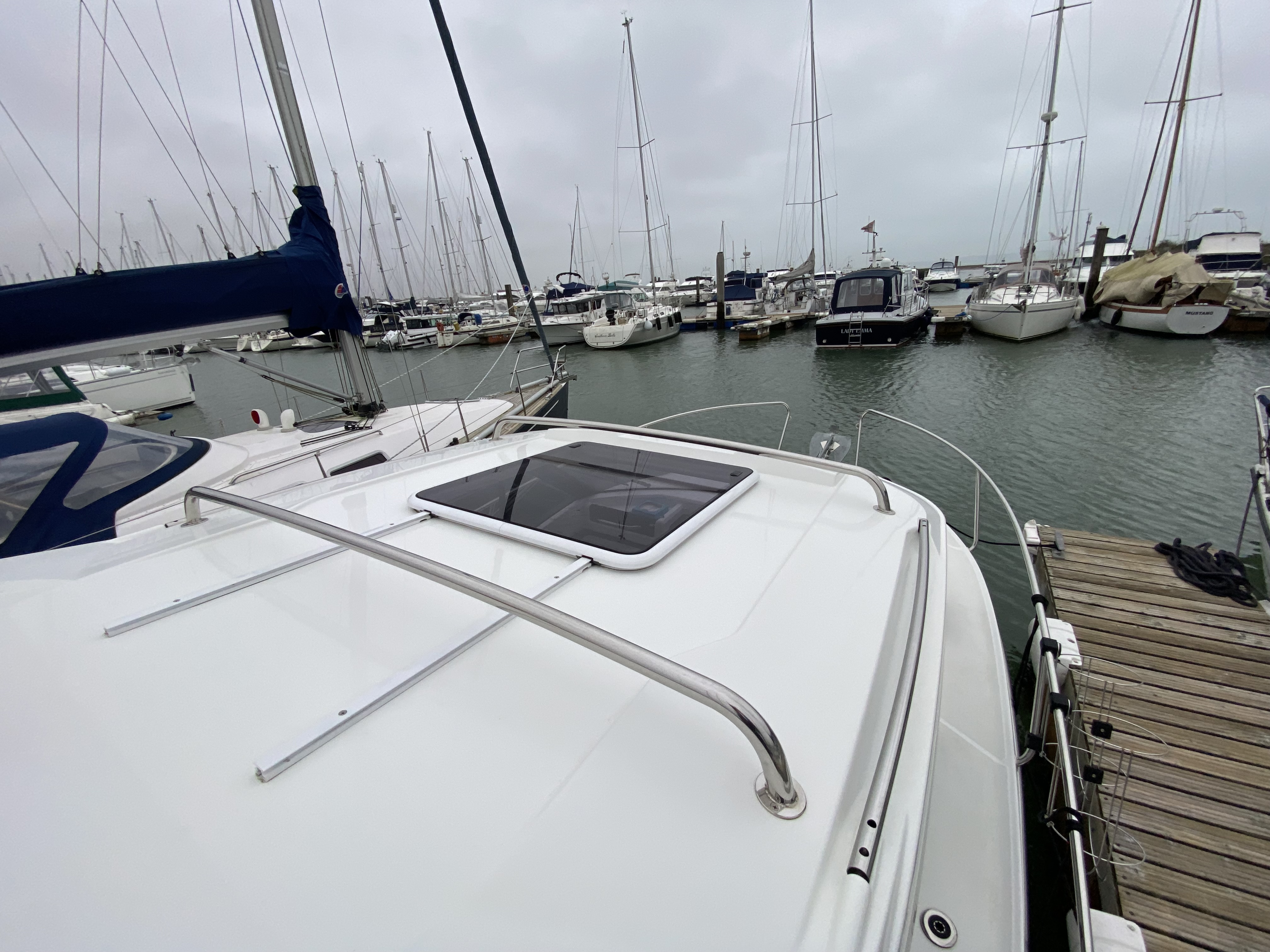 Access to foredeck via side-decks with grab handles