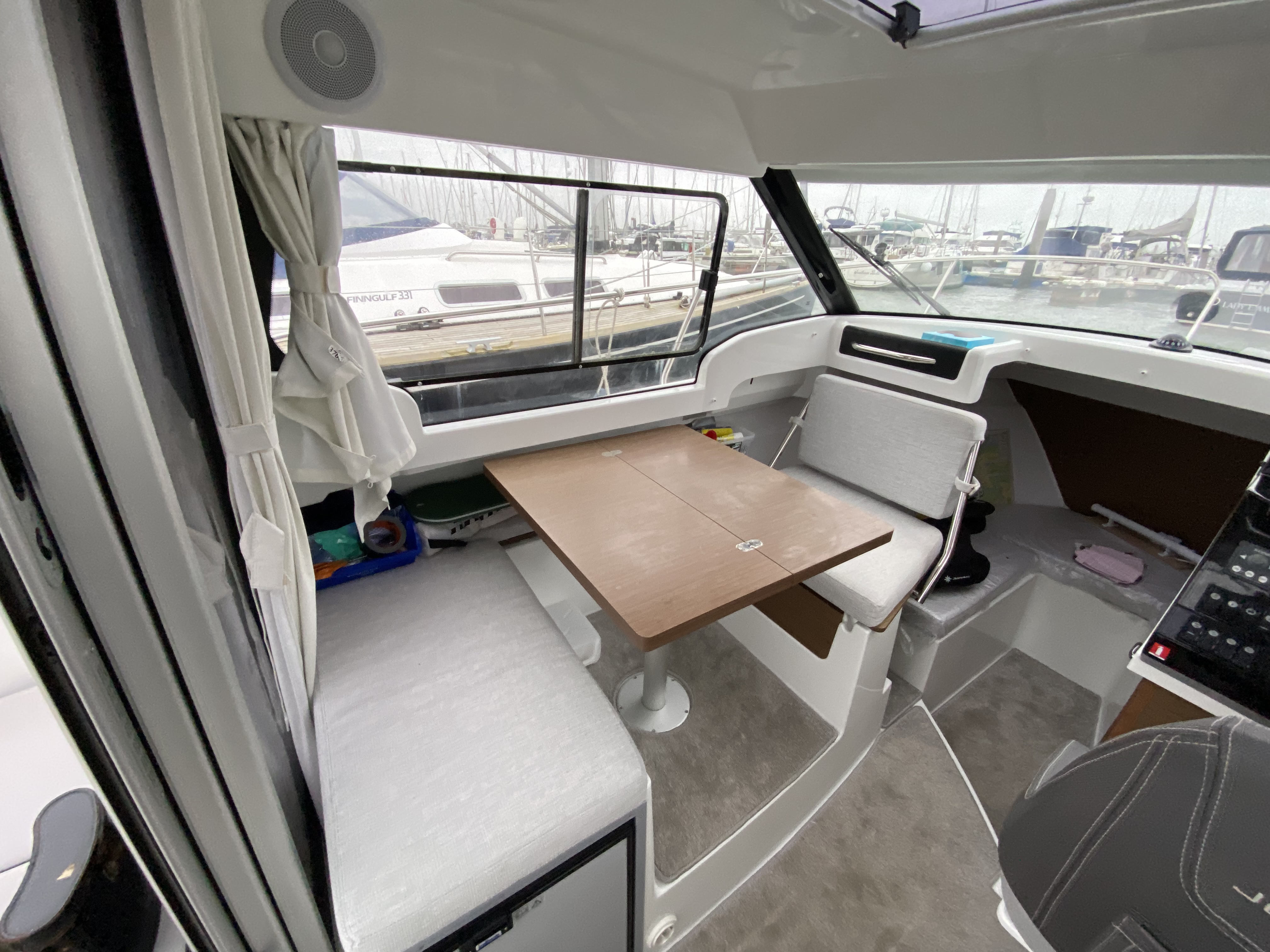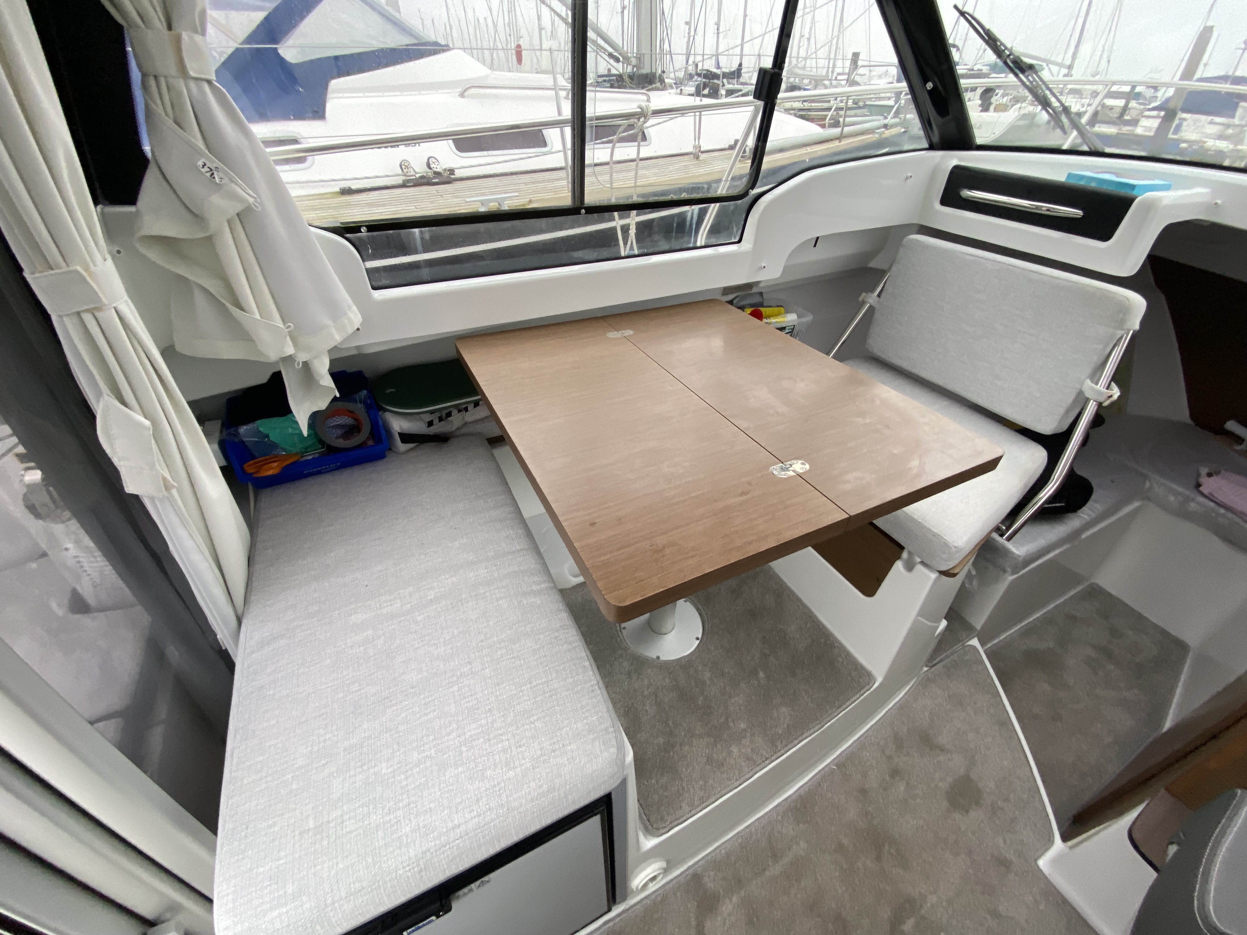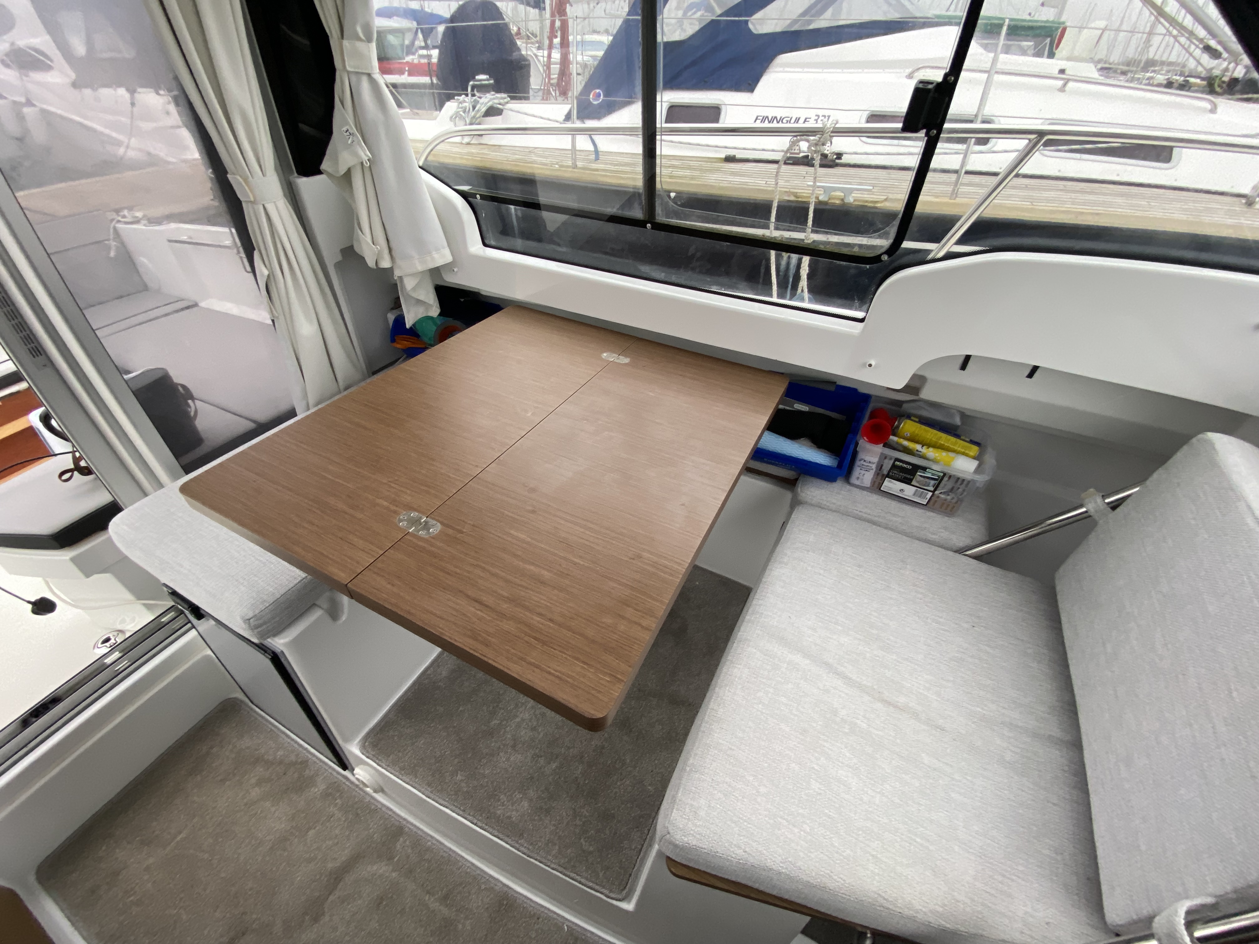 "U" shaped bench seating with cushions, cockpit table