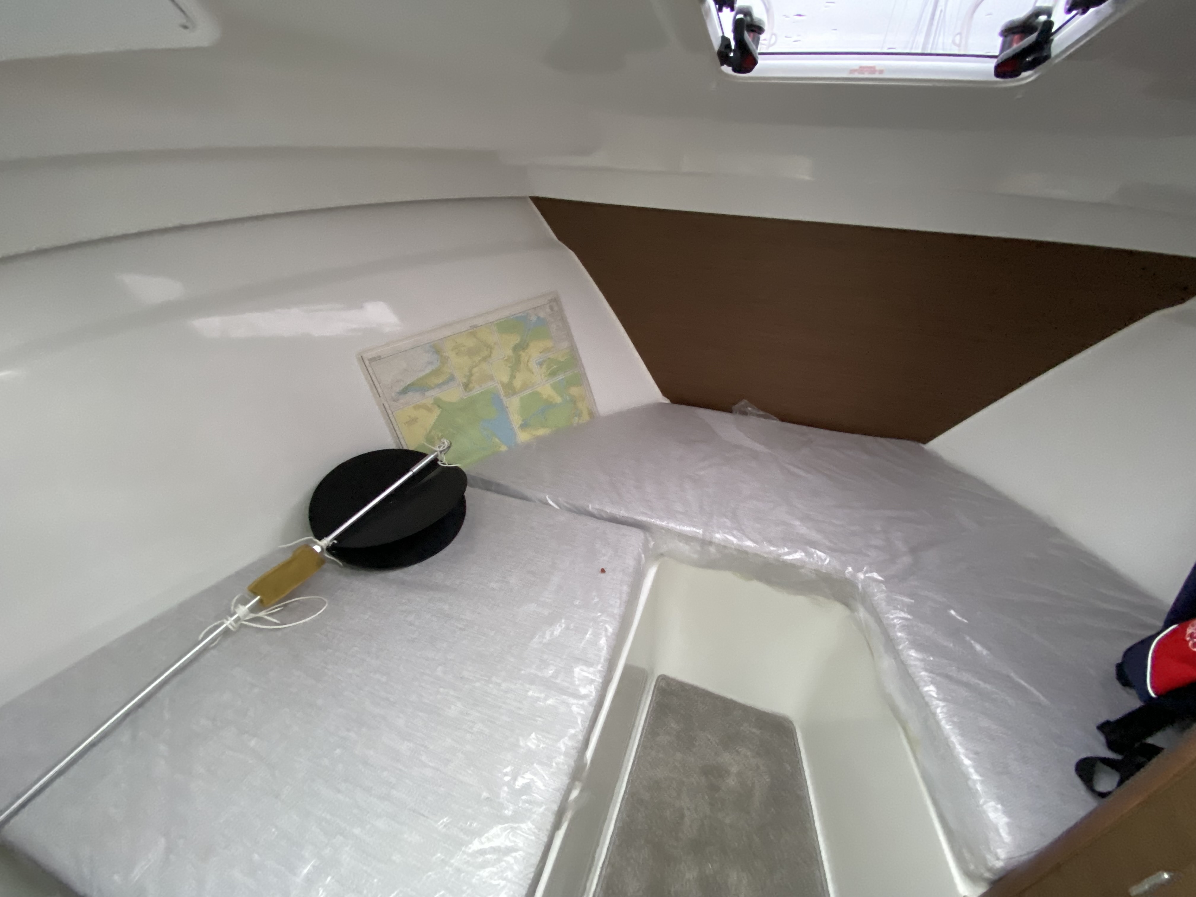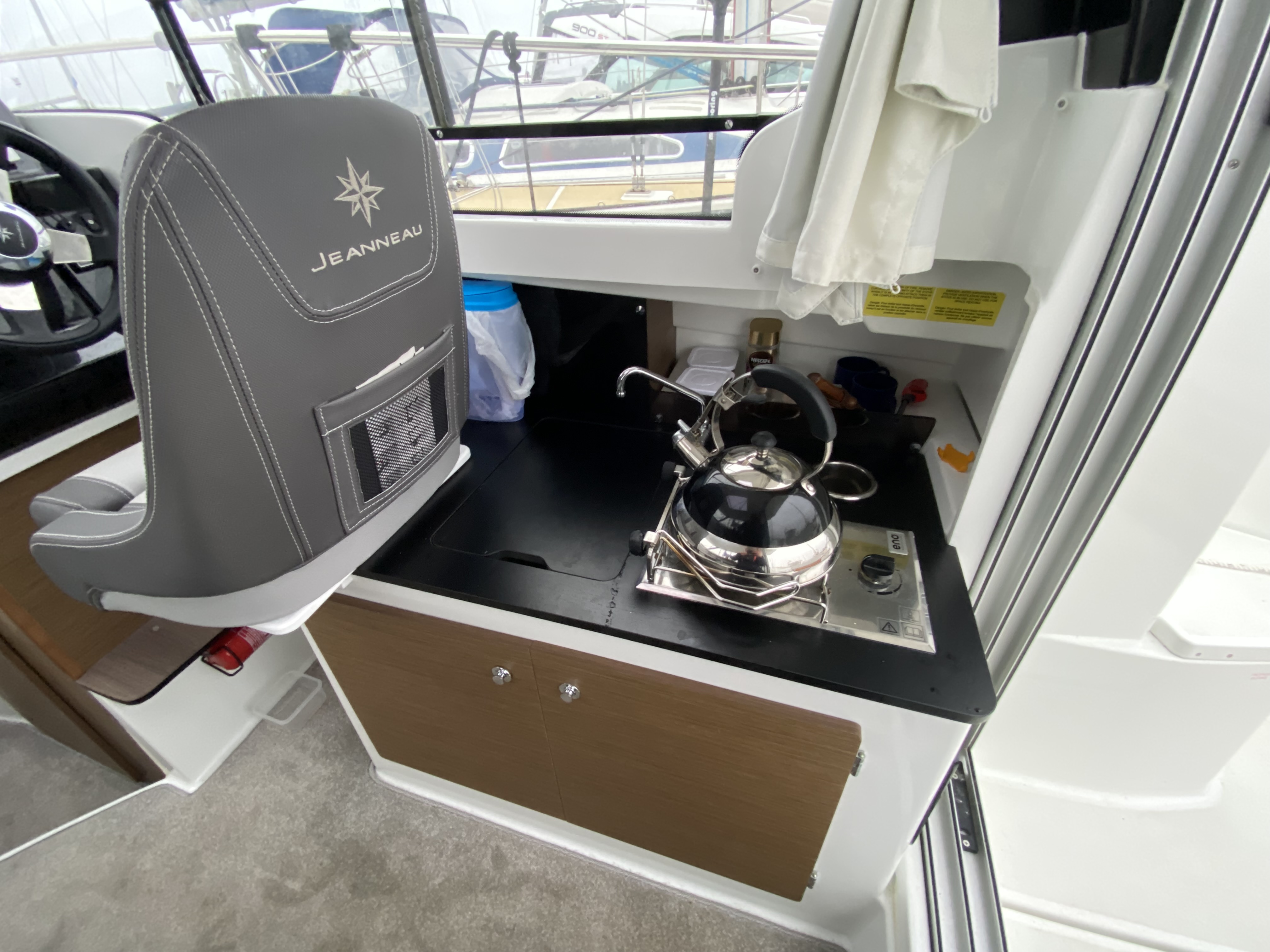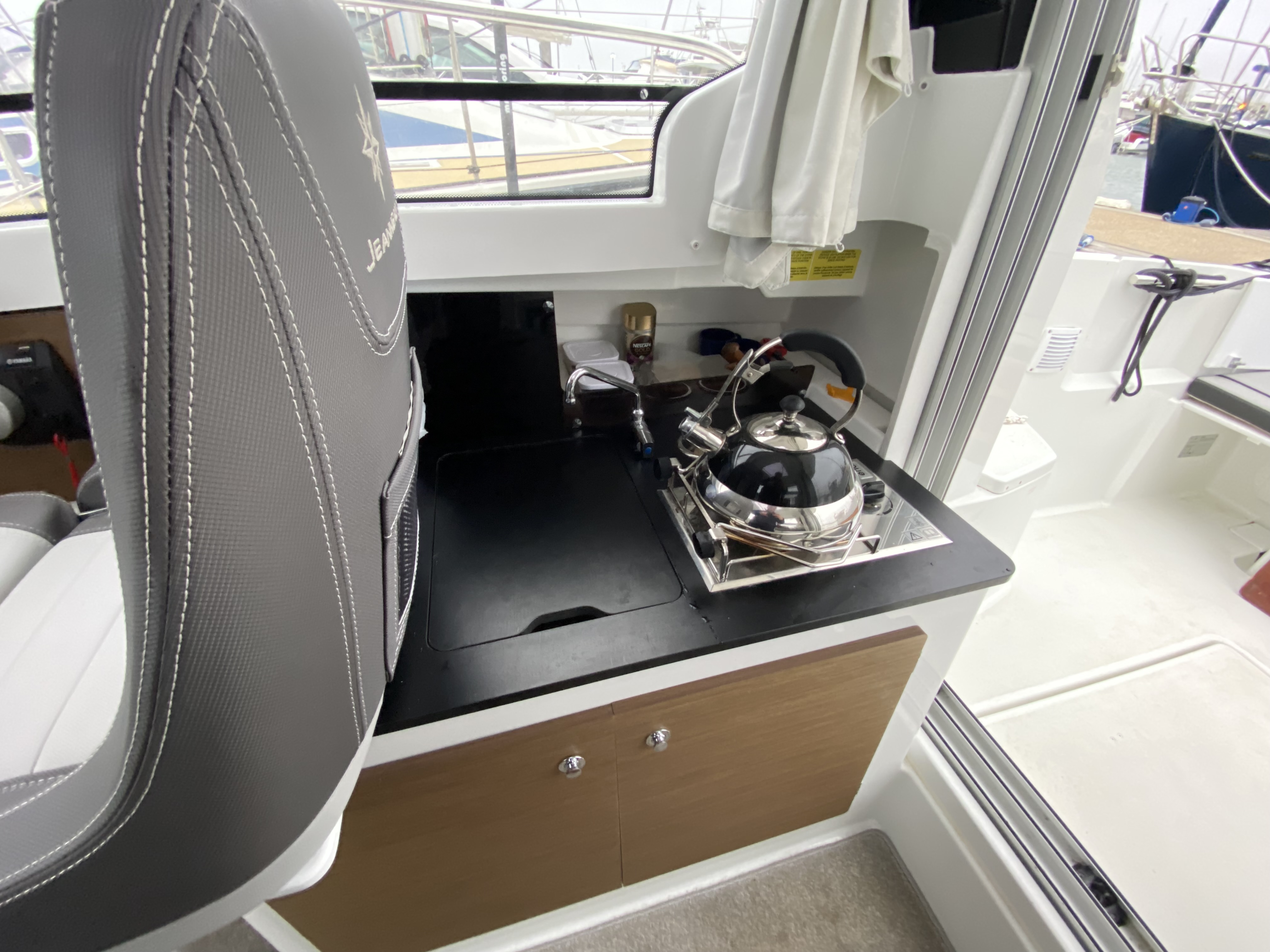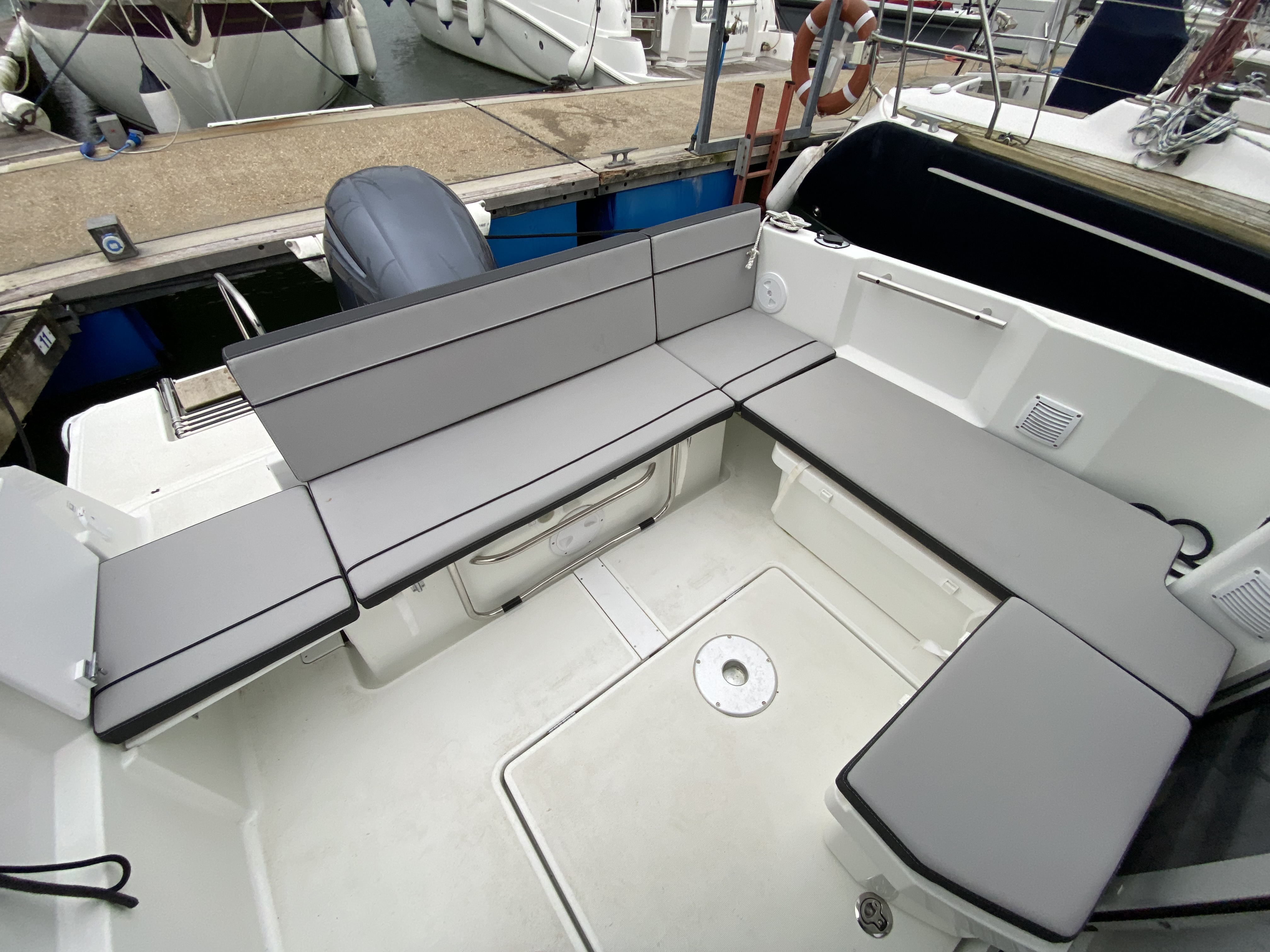 "U" shaped bench seating with cushions, cockpit table