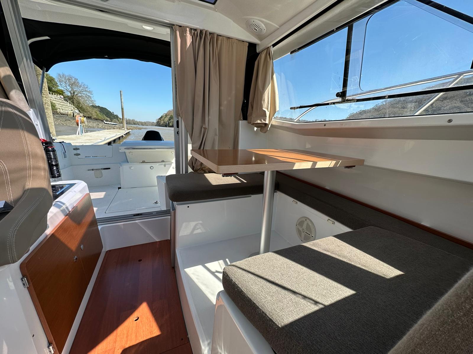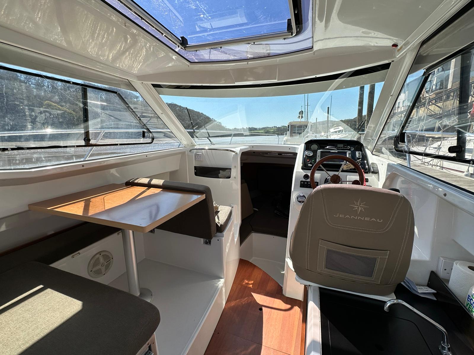 Spacious wheelhouse/cabin with table to port which converts to a double berth, sliding windows either side