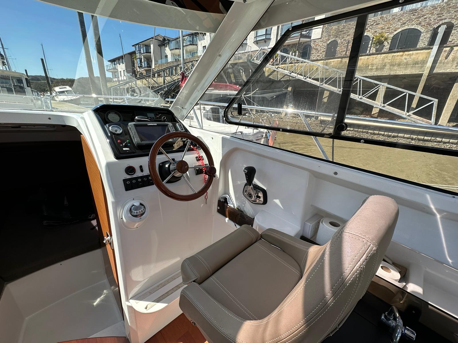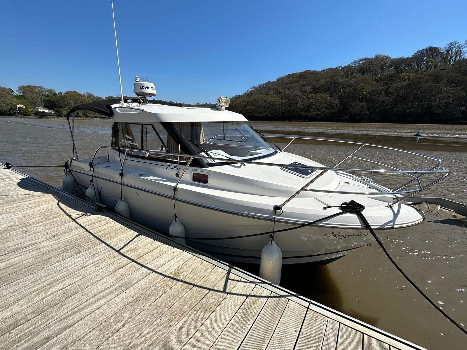 Built in 2013 to a 2014 model 'Sunfish' is a great example of the ever popular Merry Fisher 755. She gives good balance between interior and exterior space and designed to facilitate a variety of uses, she is a wonderful example of a day boat that easily manages overnight stays. Powered by a Suzuki 150hp 'Leanburn' four stroke outboard with less than 300 hours. Her spec includes diesel heating, bow thruster, electric windlass & Lowrance electronics. She is well presented & has great service history, and also benefits from coppercoating completed in 2020.