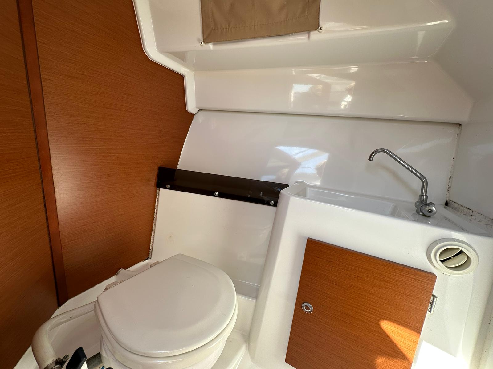 Heads under helm to starboard with manual sea toilet with holding tank, sink with cold water and storage cupboard beneath