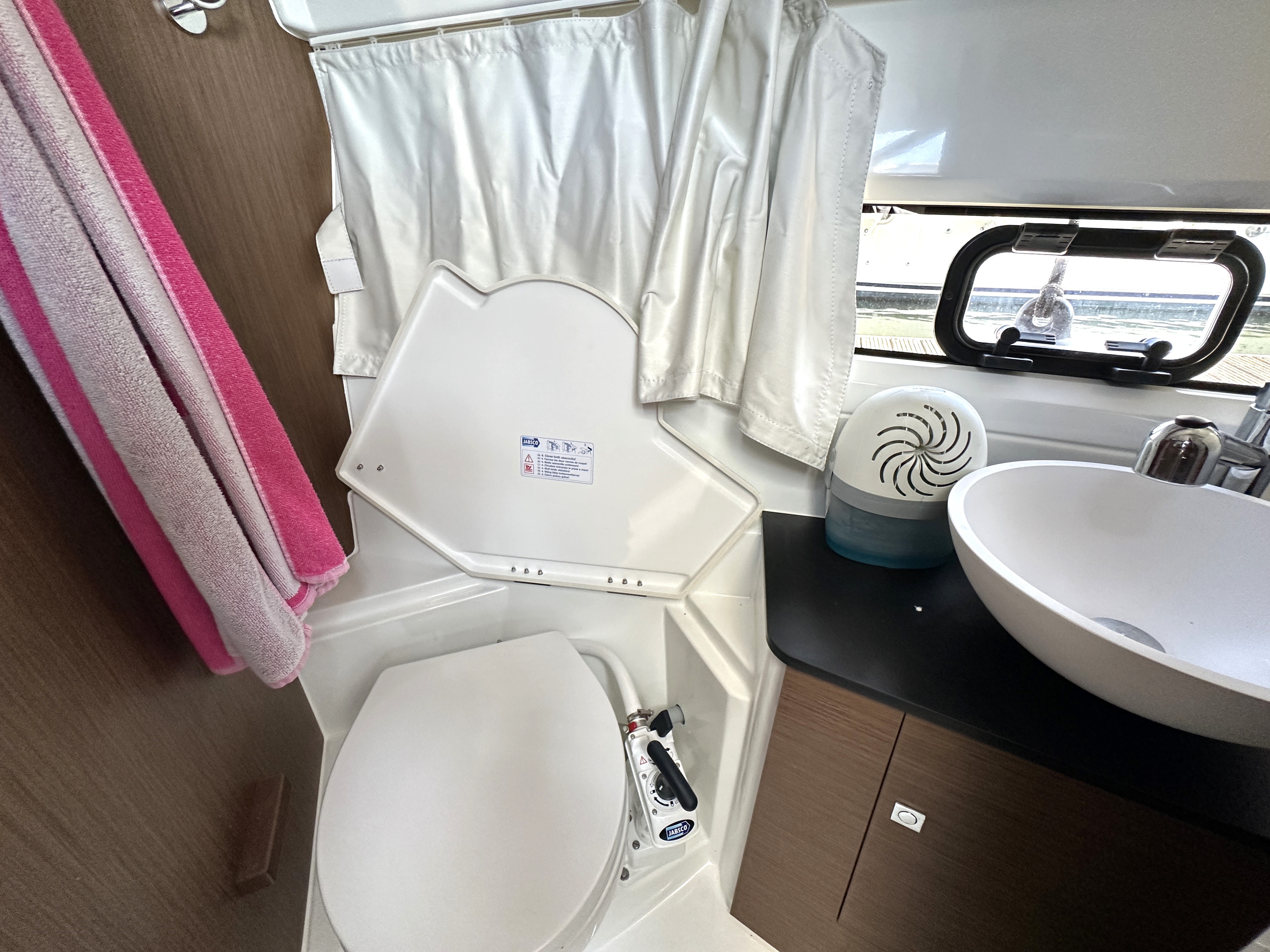 In this compartment there is a marine toilet with shower seat lid, sink, pull out shower with a shower pump.