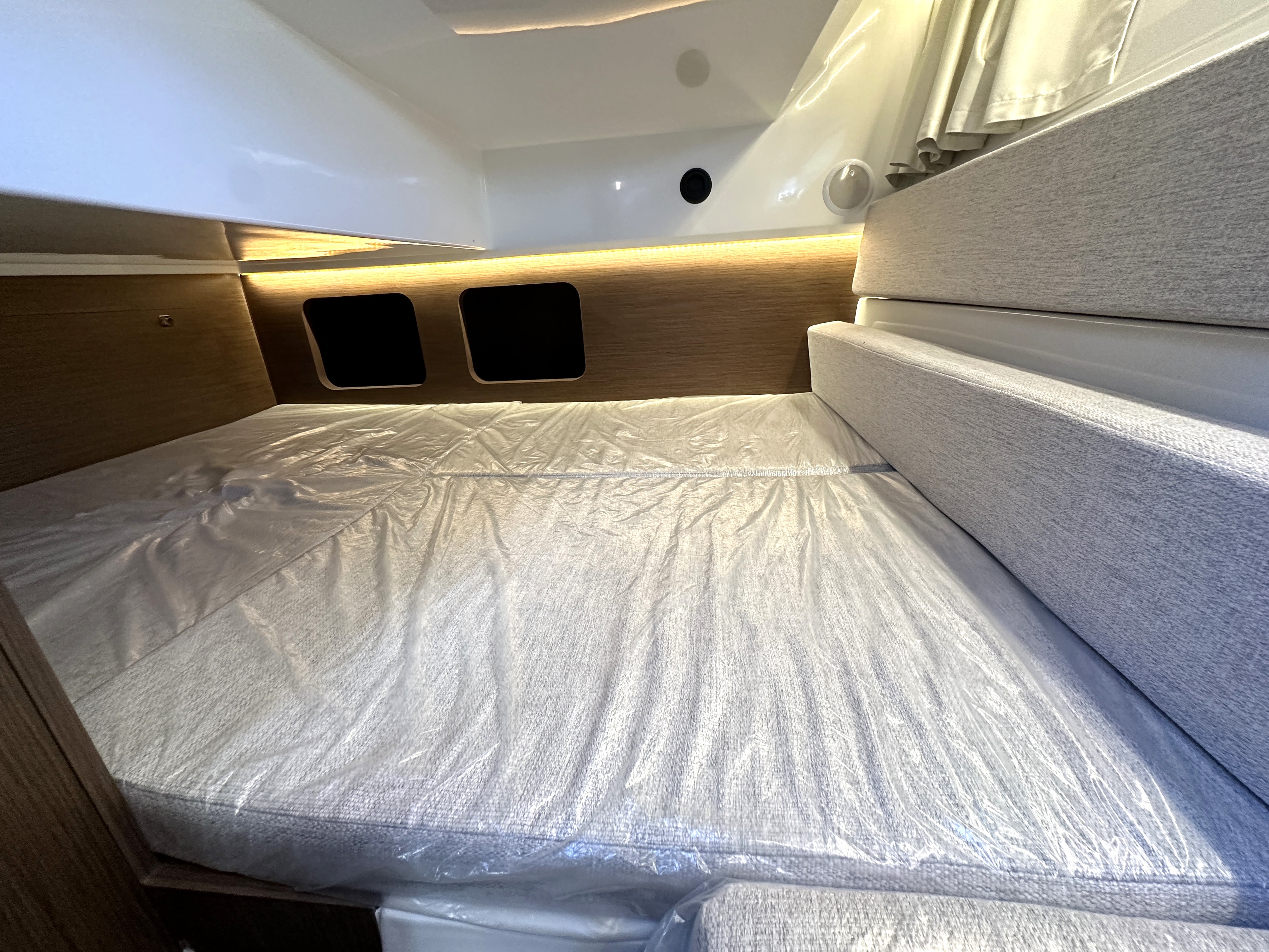 Large double bed with ambient lighting LED lighting, seating and port holes.