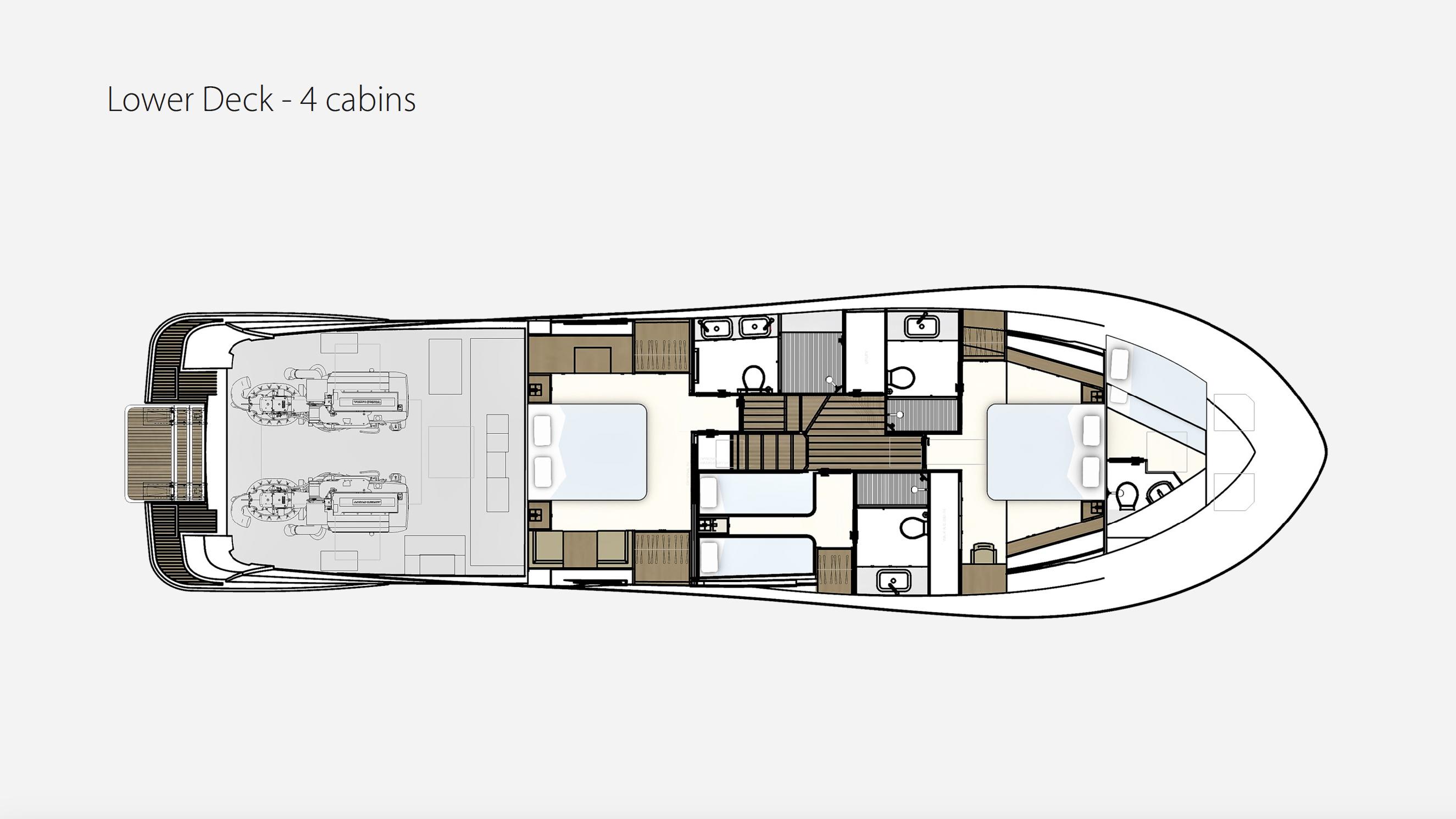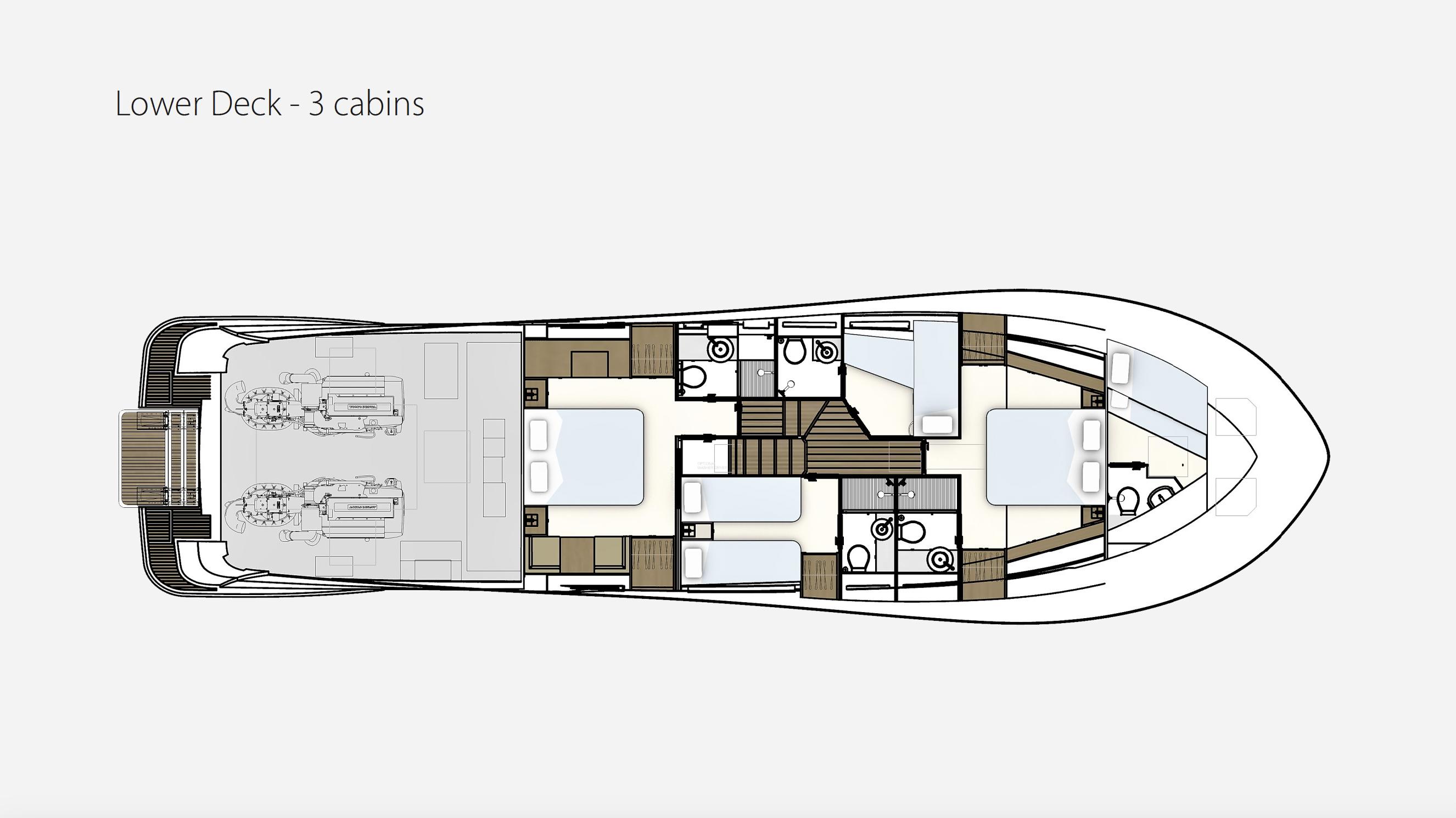 3 cabin layout standard, 4 cabin layout optional all cabins and bathrooms feature opening portholes individual AC in each cabin 115V outlets with USB ports LED ceiling and ambient lighting all bathrooms feature 115V outlets, shower stalls. electro-vac fresh water toilets, extractor fans, and vanity combo washer dryer unit in lobby or engine room Owners Stateroom: