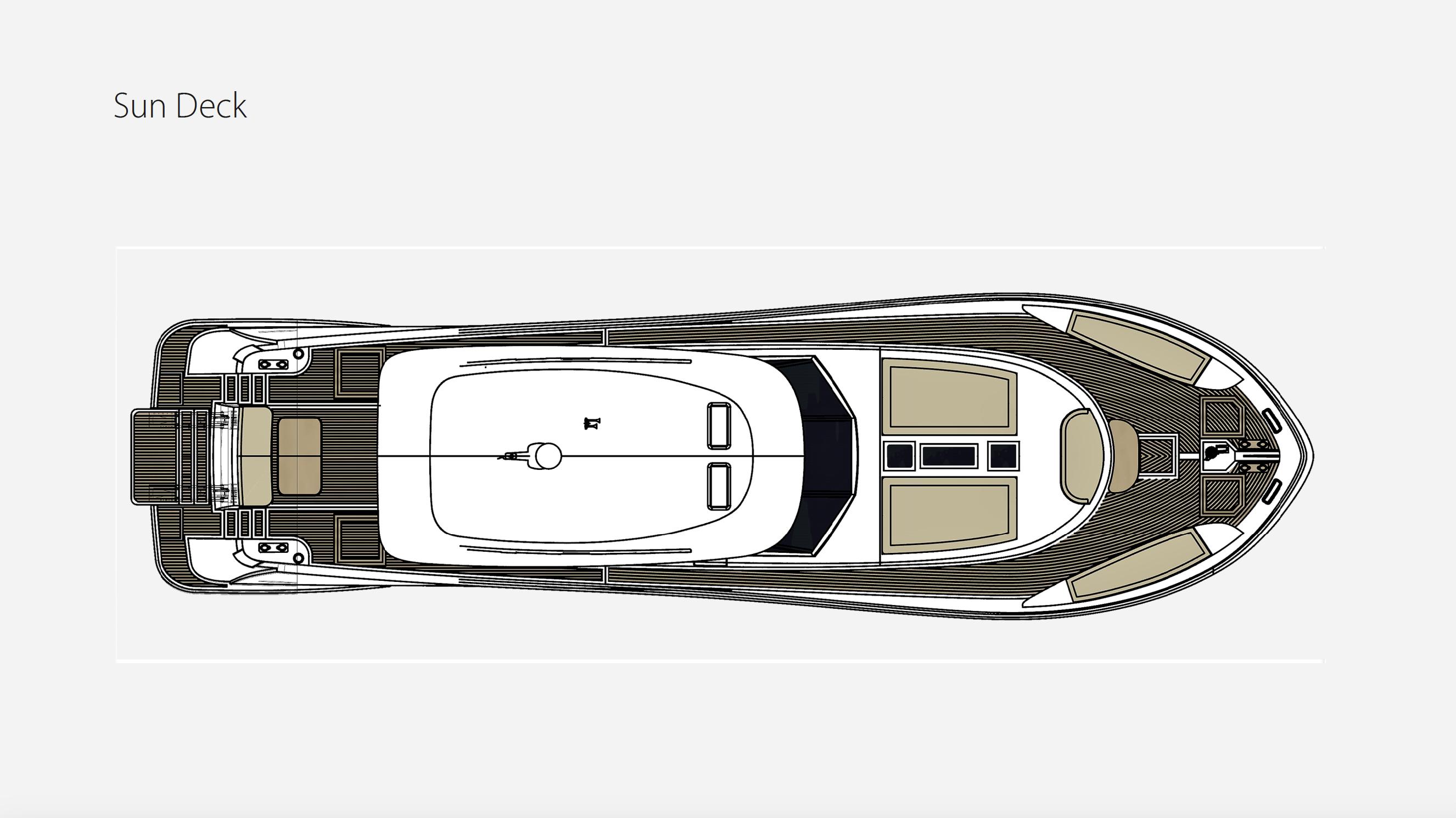 The yacht’s strikingly sharp and highly developed bow dominates oncoming waves with authority, ensuring passengers enjoy smooth, comfortable cruising while projecting an unmistakable impression of power and capability. The sleek spindle line, robust structural strength, and extremely deep V-hull design define this exceptional vessel’s seaworthy character.