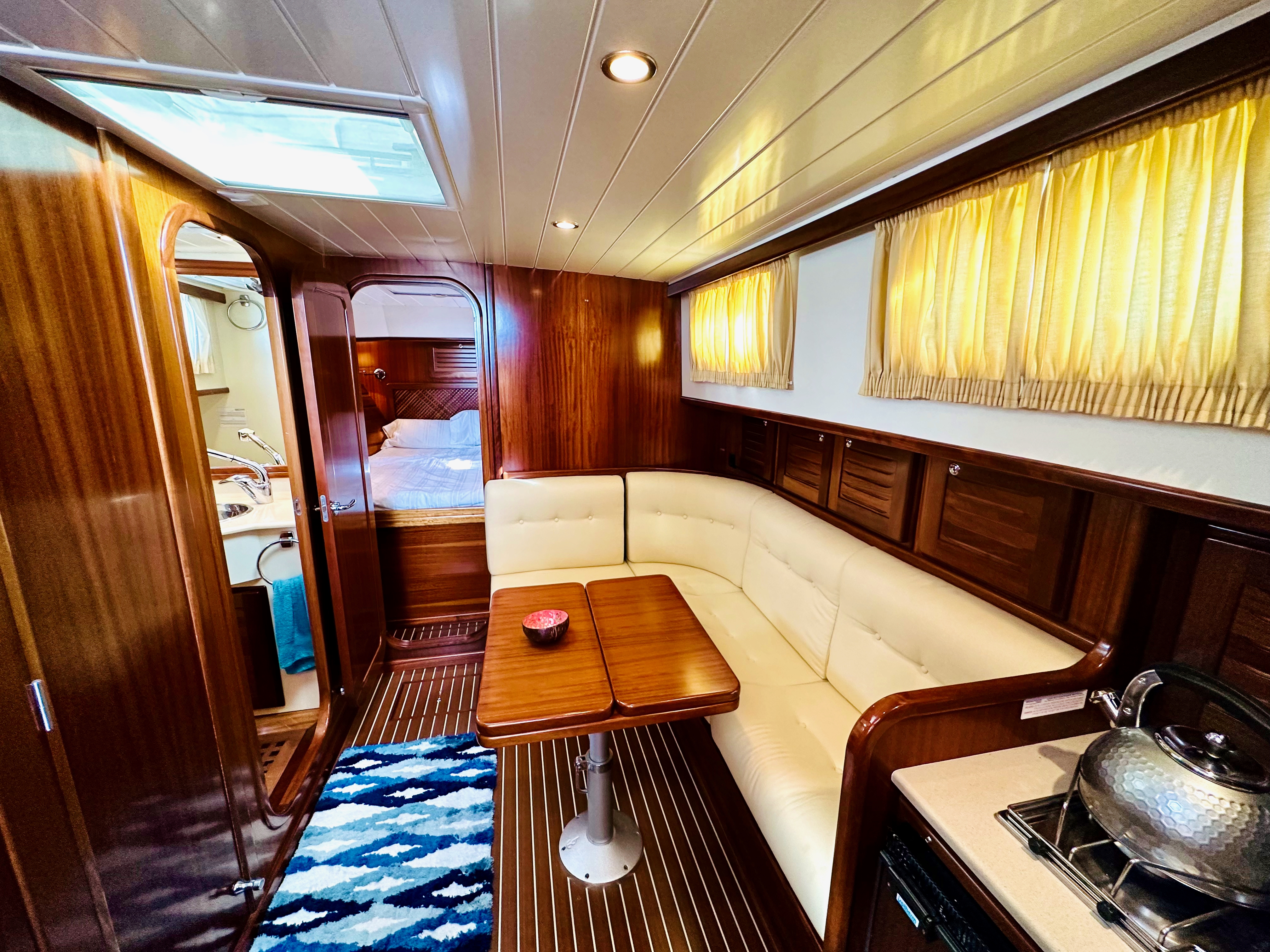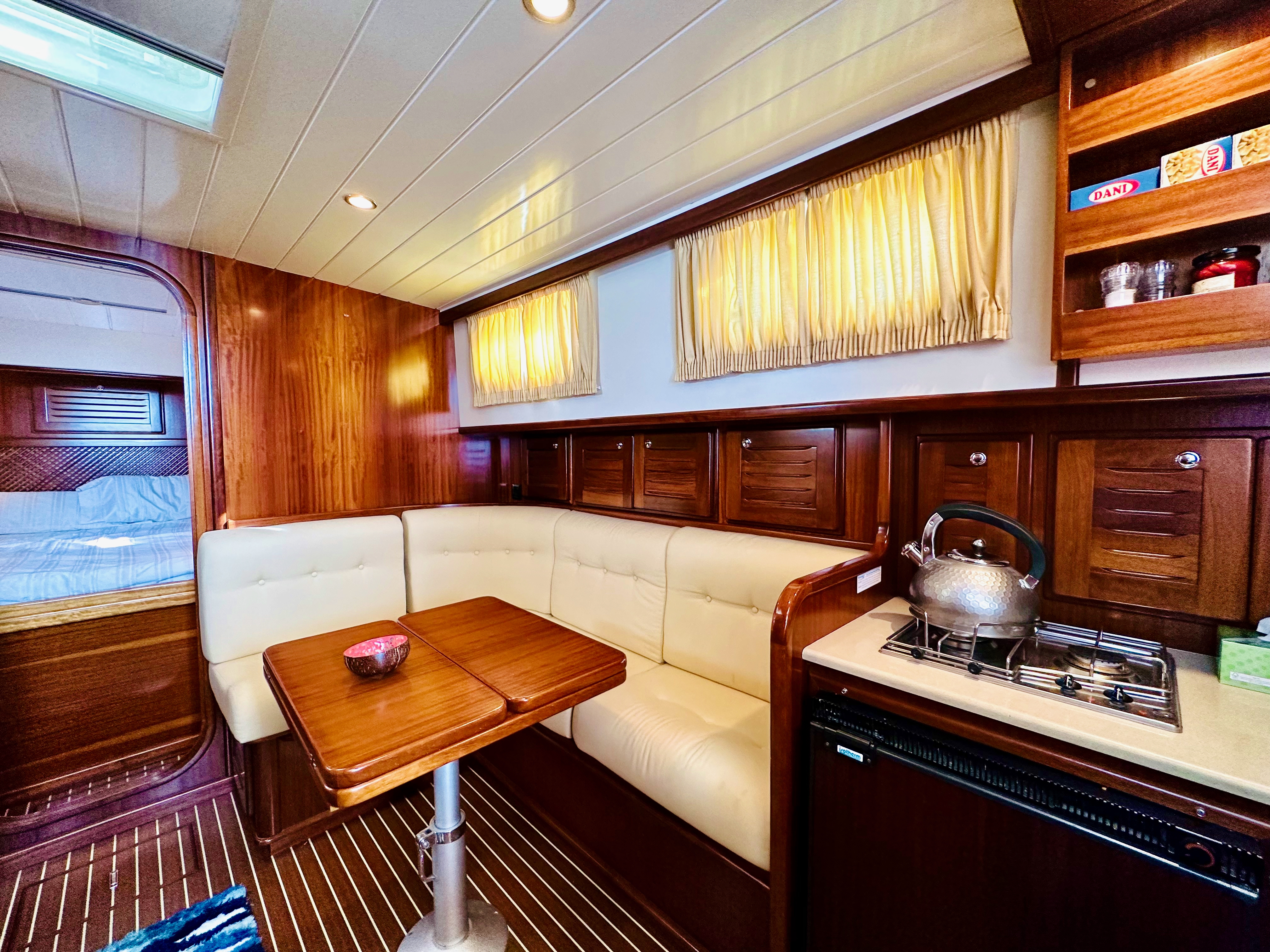 SALOON - L-shaped sofa with table, ( convertible into bed ) portholes to open, storage lockers, CD/DVD/MP3.