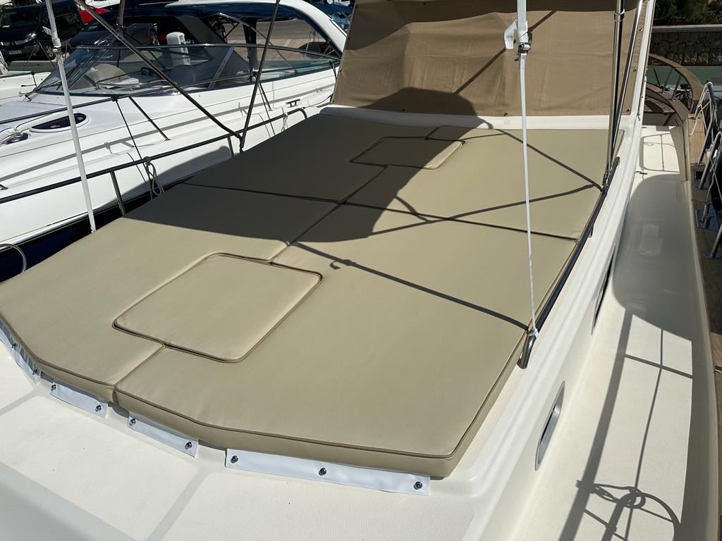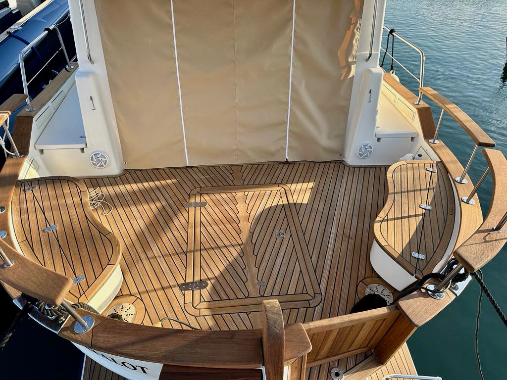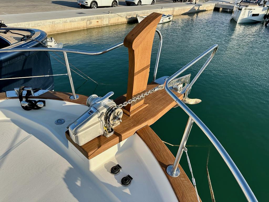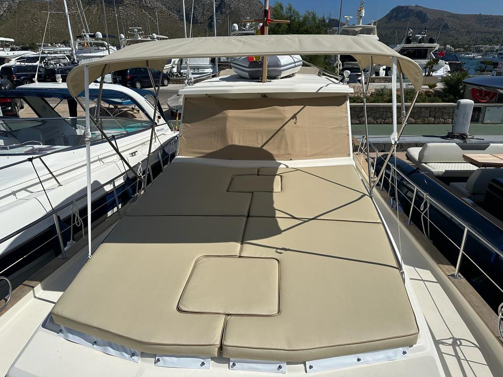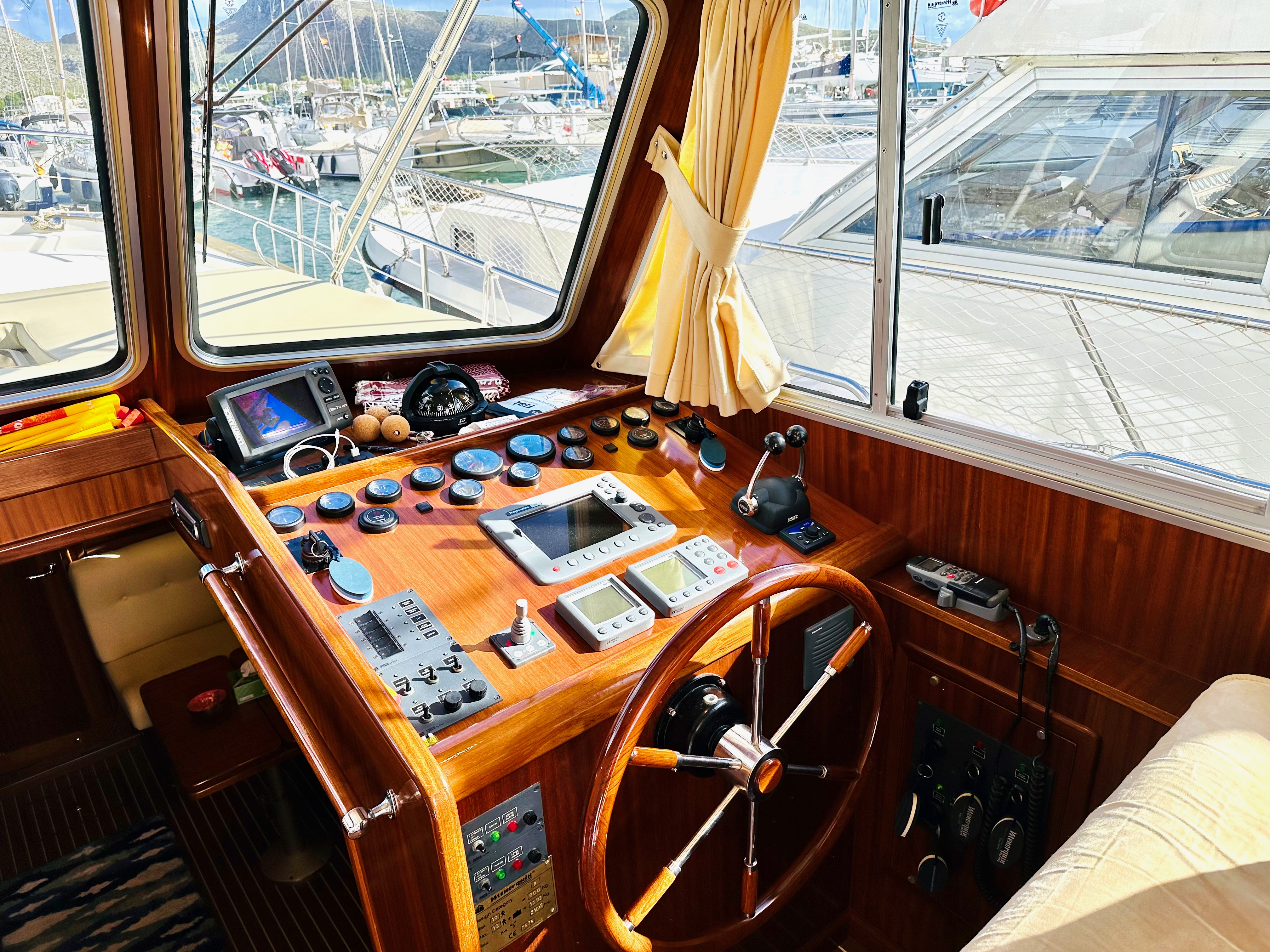 Menorquin 120 in lovely condition. Full refit in 2023: bow thruster, new deck cushions, new covers, teak decks sanded, new BESENZONI hydraulic gangway, new front and aft cockpit Bimini, etc. Only lightly used. The Menorquin is a comfortable and safe, powerful semi-displacement cruiser. Spacious cockpit with ig opening doors to the typical Menorquin Pilothouse. Lovely interior, lots of space! Twin 260hp Volvo engines, 2 cabins, 6 berths, teak laid cockpit and bathing platform, sun awning, two fridges with freezers compartment, sun awning, stainless steel anchor and chain etc. Boat will be stored outside the water in inside storage, over winter 23/24 in Mallorca