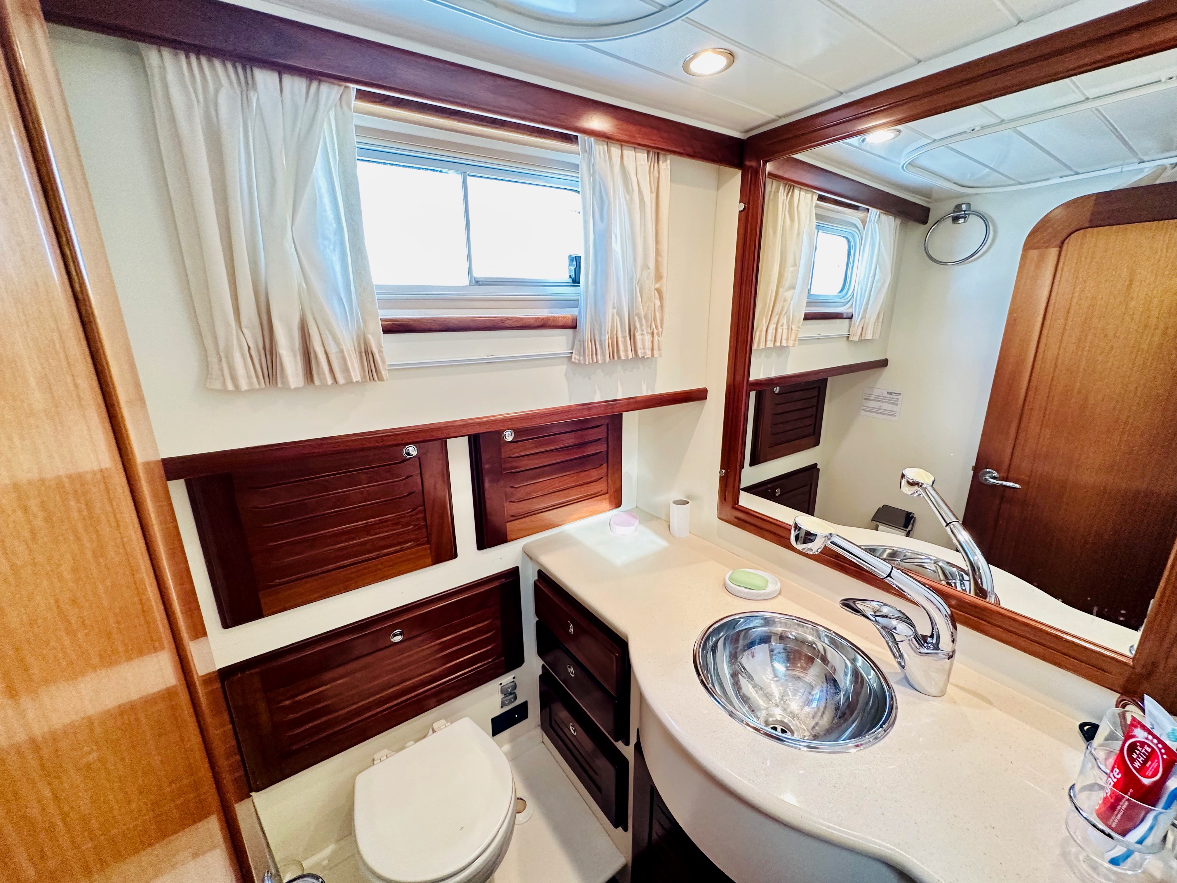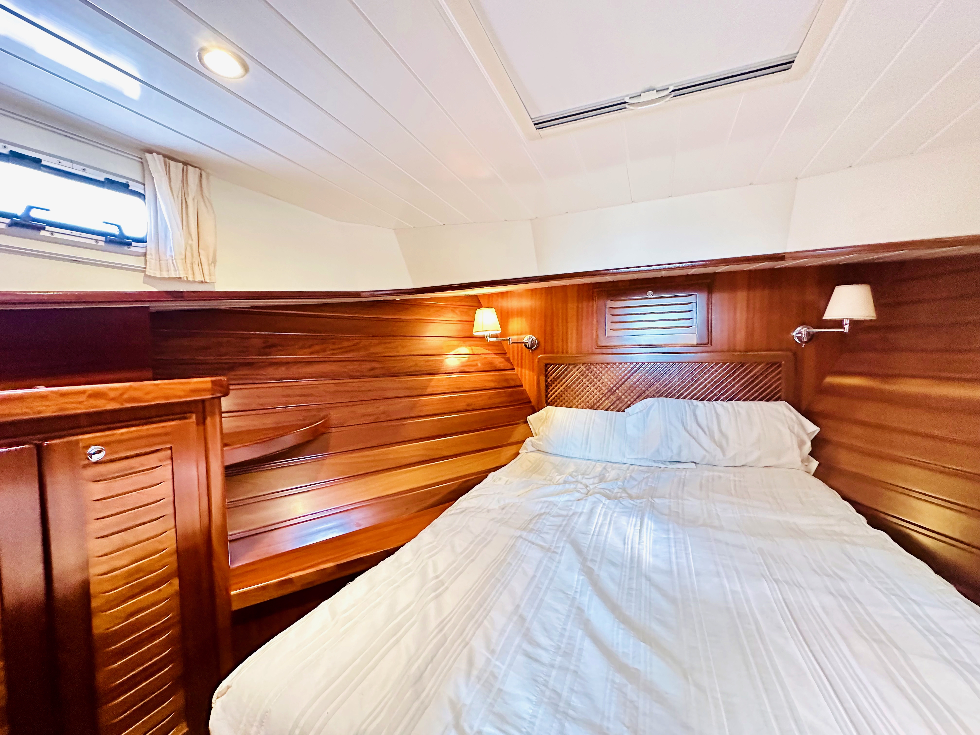 FORWARD CABIN - Master cabin with double berth ( storage below ) with reading lamps, 220v sockets, two wardrobes, access to anchor locker .