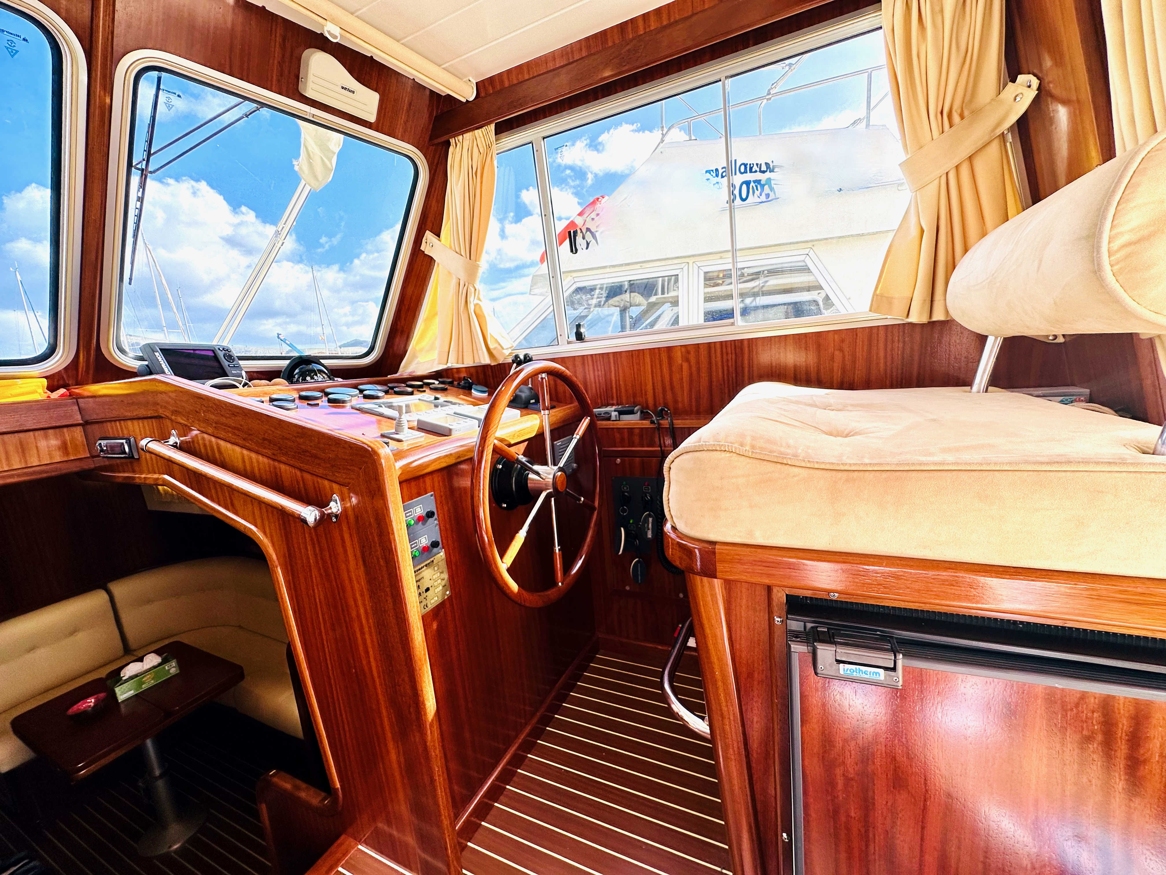 PILOTHOUSE - 4 part saloon door in wood and glass to enter from cockpit. Can be fully opened and same level to cockpit. Interior steering position with helm and pilot seat to starboard, chart table; settee to port.