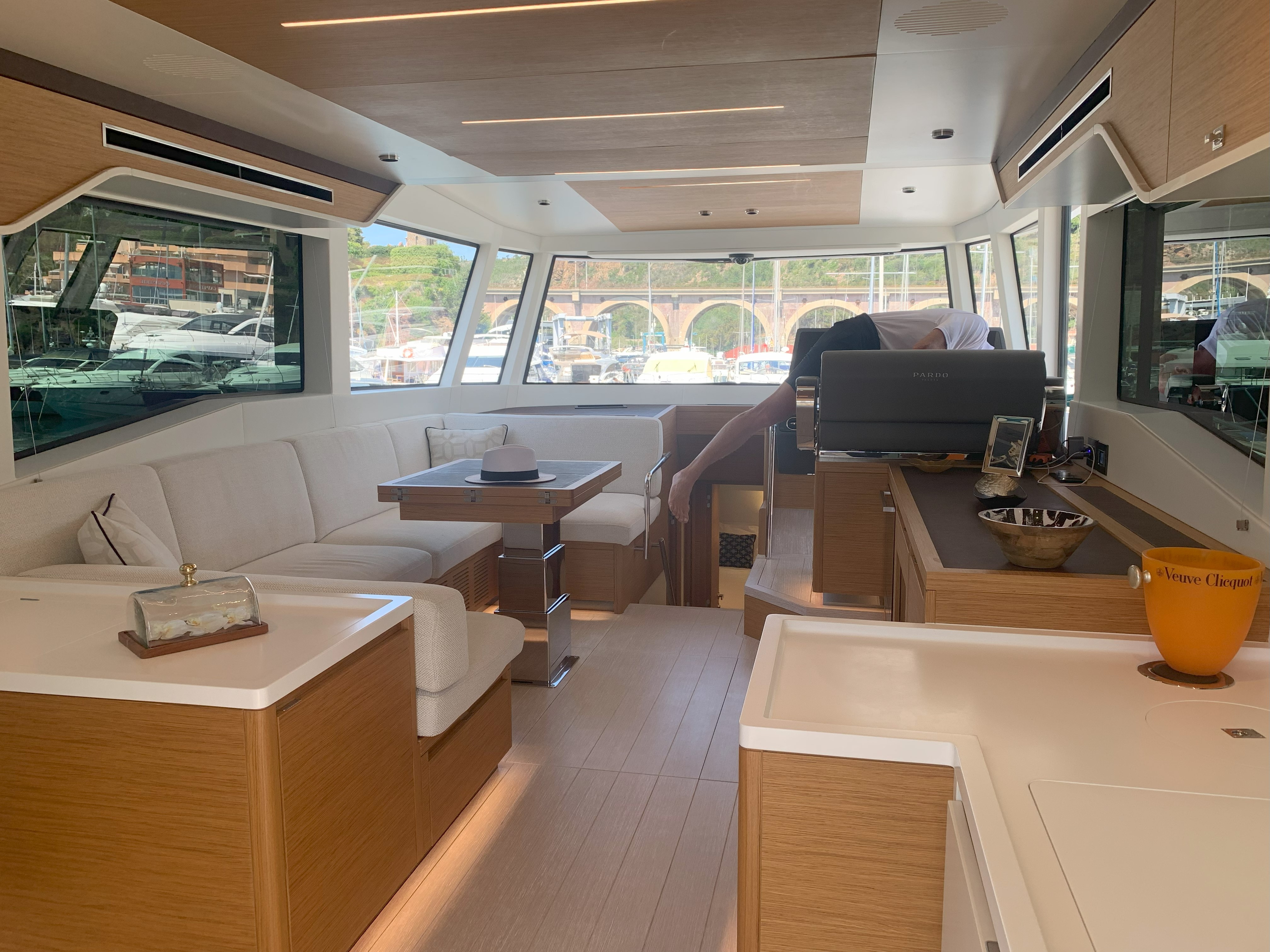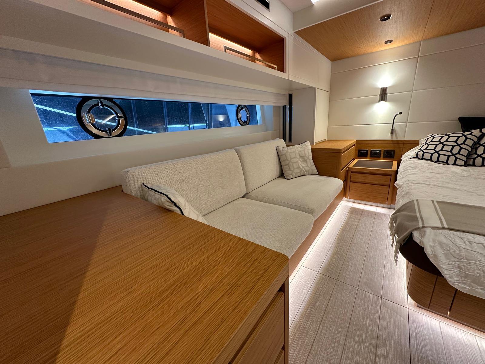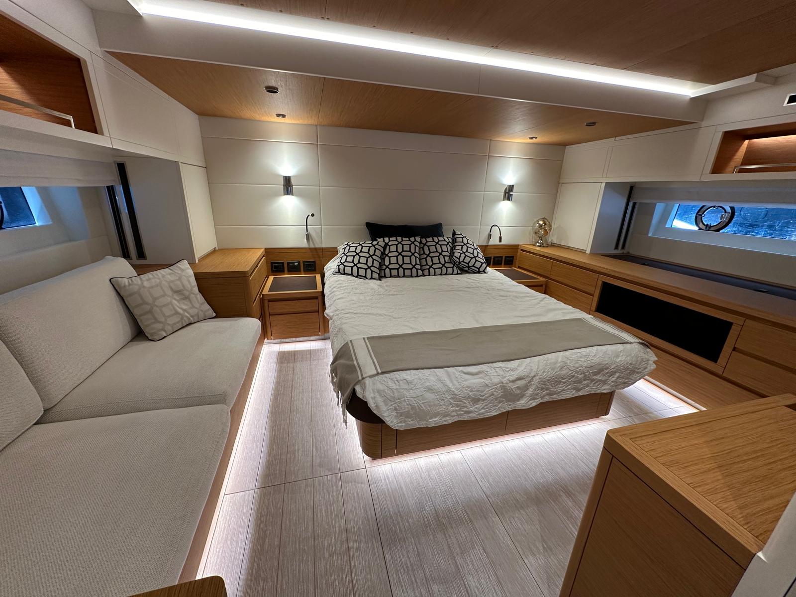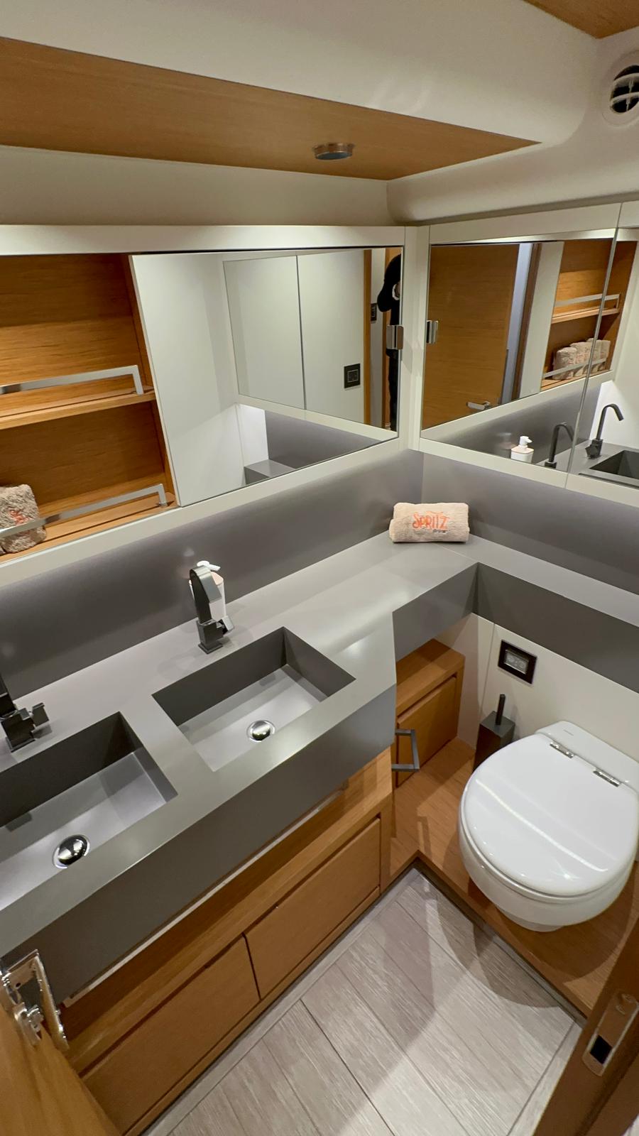 Owners central cabin with double berth , sofa and en suite head with wc, washbasin and separate shower
